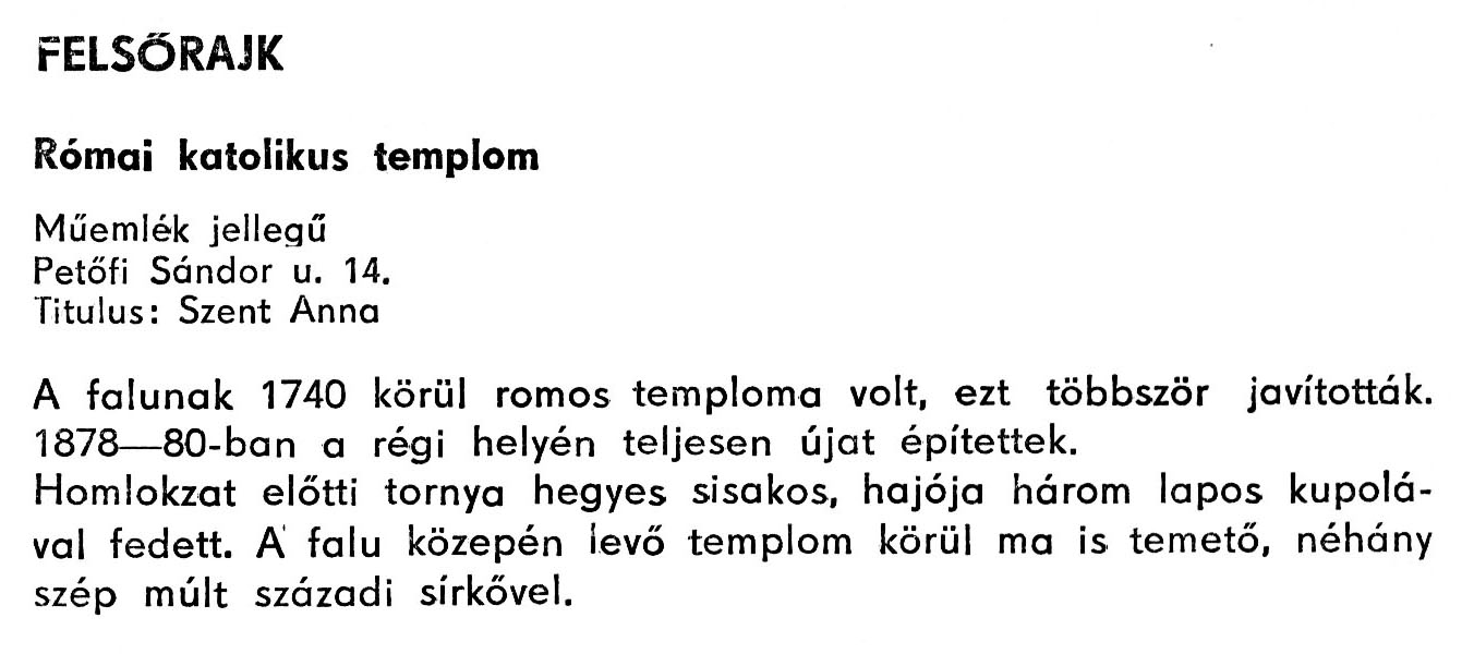 Nyilvános 2085 | 4276 | Felsőrajk - Zala megye műemlékei 1979 068old | A részlet szövege: FELSŐRAJK Római katolikus templom Műemlék jellegű Petőfi Sándor u. 14. Titulus: Szent Anna A falunak 1740 körül romos temploma volt, ezt többször javították. 1878–80-ban a régi helyén teljesen újat építettek. Homlokzat előtti tornya hegyes sisakos, hajója három lapos kupolával fedett. A falu közepén levő templom körül ma is temető, néhány szép múlt századi sírkővel. A részlet a következő könyvből származik: Cím: Zala megye műemlékei Szerző: Németh József (1928) Közreműködő: Vándor László (szerk.) ; Szabóky Zsolt (1941) (fotó) Szerz. közl.: Németh József ; [szerk. Vándor László] ; [fotók... Szabóky Zsolt] Kiadás jelzés: 2. bőv. kiad. Kiadás: Zalaegerszeg : Zalai Ny., 1979 ETO jelzet: 72(439.121) ; 7.025.3/.4(439.121) ; 908.439.121 Tárgyszó: Zala Szakjelzet: 908 Cutter: N 53 Nyelv: magyar Oldalszám: 134 p. |