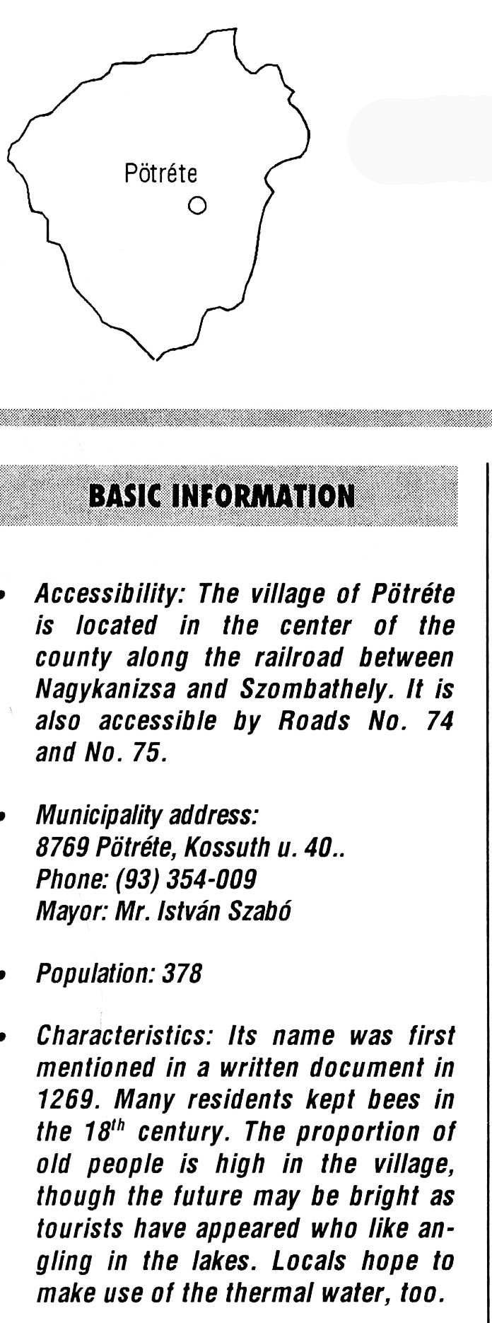 Nyilvános 2321 | 5837 | Pötréte | BASIC INFORMATION Accessibility: The village of Pötréte is located in the center of the county along the railroad between Nagykanizsa and Szombathely. It is also accessible by Roads No. 74 and No. 75. Municipality address: 8769 Pötréte, Kossuth u. 40. Phone: (93) 354-009 Mayor: Mr. István Szabó Population: 378 Characteristics: Its name was first mentioned in a written document in 1269. Many residents kept bees in the 18th century. The proportion of old people is high in the village, though the future may be bright as tourists have appeared who like angling in the lakes. Locals hope to make use of the thermal water, too. This text came from the following book: Title: Handbook of Zala county (Zala megye kézikönyve) Series: County handbooks of Hungary (Magyarország megyei kézikönyvei) Chief editor: Hóbor József Publisher: (Hatvan), CEBA-Hungary Ltd, 1998 ETO: 908.439.121(035) ; 050.8(439.121) ISBN: 963-9089-18-2 Pages: 488-1040 p. Remark: Closed on: 1998. márc. 31. |