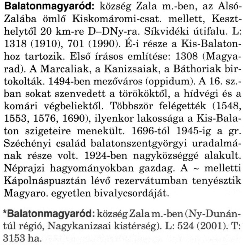Nyilvános 2238 | 6073 | A szócikkek felismertetett szövege: | (A csillag után a kiegészítő kötetből származó szöveg következik) Balatonmagyaród: község Zala m.-ben, az Alsó-Zalába ömlő Kiskomáromi-csat. mellett, Keszthelytől 20 km-re D–DNy-ra. Síkvidéki útifalu. L: 1318 (1910), 701 (1990). É-i része a Kis-Balatonhoz tartozik. Első írásos említése: 1308 (Magya-rad). A Marcaliak, a Kanizsaiak, a Báthoriak birtokolták. 1494-ben mezőváros (oppidum). A 16. sz.-ban sokat szenvedett a törököktől, a hídvégi és a komári végbeliektől. Többször felégették (1548, 1553, 1576, 1690), ilyenkor lakossága a Kis-Balaton szigeteire menekült. 1696-tól 1945-ig a gr. Széchényi család balatonszentgyörgyi uradalmának része volt. 1924-ben nagyközséggé alakult. Néprajzi hagyományokban gazdag. A ~ melletti Kápolnáspusztán lévő rezervátumban tenyésztik Magyaro. egyetlen bivalycsordáját. *Balatonmagyaród: község Zala m.-ben (Ny-Dunán-túl régió, Nagykanizsai kistérség). L: 524 (2001). T: 3153 ha. A szócikkek a következő lexikonból származnak: Cím: Magyar nagylexikon Közreműködő: Élesztős László (1949) (szerk.) ; Barabás Éva (1943) (szerk.) ; Berényi Gábor (1946) (szerk.) ; Bárány Lászlóné (szerk.) ; Adelmann-né Kertész Judit (1945) (közrem.) ; Froemel Károlyné Jáky Éva (1936) (közrem.) ; Akadémiai Kiadó és Nyomda Vállala Szerz. közl.: [... Élesztős László főszerk.] ; [szerk. Barabás Éva et al.] ; [bibliogr. Adelmanné Kertész Judit] ; [kész. az Akadémiai Kiadó Magyar Nagylexikon Szerkesztőségében] Kiadás: Budapest : Akad. K., 1993- Kötetei: 1. köt., A - Anc 2. köt., And - Bag 3. köt., Bah - Bij 4. köt., Bik - Bz 5. köt., C - Csem 6. köt., Csen - Ec 7. köt., Ed - Fe 8. köt., Ff - Gyep 9. köt., Gyer - Iq 10. köt., Ir - Kip 11. köt., Kir - Lem 12. köt., Len - Mep 13. köt., Mer - Nyk 14. köt., Nyl - Pom 15. köt., Pon - Sek 16. köt., Sel - Szö 17. köt., Szp - Ung 18. köt., Unh - Z 19. köt., Kiegészítő kötet, A - Z ETO jelzet: 030=945.11 Szakjelzet: 030 Cutter: M 14 ISBN: 963-05-6611-7 [!ISBN 963-05-6615-X] Nyelv: magyar Megjegyzés: Az 5. kötettől kiad. a Magyar Nagylexikon Kiadó ; A 6. kötettől főszerk. Berényi Gábor ; A 6. kötettől szakszerk. Bárány Lászlóné et al. ; A 6. kötettől bibliogr. Froemel Károlyné ; Bibliogr. a szócikkek végén |