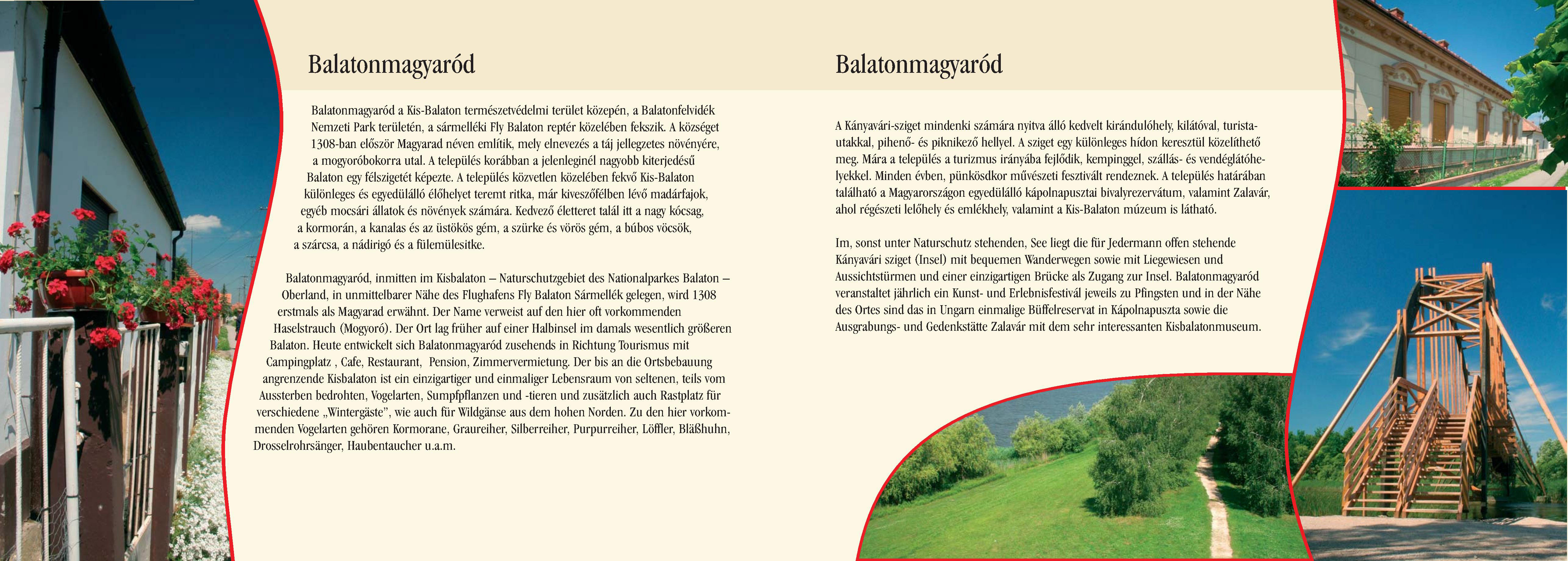 Nyilvános 2239 | 6340 | Balatonmagyaród | Balatonmagyaród, inmitten im Kisbalaton Naturschutzgebiet des Nationalparkes Balaton Oberland, in unmittelbarer Nähe des Flughafens Fly Balaton Sármellék gelegen, wird 1308 erstmals als Magyarad erwähnt. Der Name verweist auf den hier oft vorkommenden Haselstrauch (Mogyoró). Der Ort lag früher auf einer Halbinsel im damals wesentlich größeren Balaton. Heute entwickelt sich Balatonmagyaród zusehends in Richtung Tourismus mit Campingplatz , Cafe, Restaurant, Pension, Zimmervermietung. Der bis an die Ortsbebauung angrenzende Kisbalaton ist ein einzigartiger und einmaliger Lebensraum von seltenen, teils vom Aussterben bedrohten, Vogelarten, Sumpfpflanzen und -tieren und zusätzlich auch Rastplatz für verschiedene ,,Wintergäste", wie auch für Wildgänse aus dem hohen Norden. Zu den hier vorkommenden Vogelarten gehören Kormorane, Graureiher, Silberreiher, Purpurreiher, Löffler, Bläßhuhn, Drosselrohrsänger, Haubentaucher u.a.m. Im, sonst unter Naturschutz stehenden, See liegt die für Jedermann offen stehende Kányavári sziget (Insel) mit bequemen Wanderwegen sowie mit Liegewiesen und Aussichtstürmen und einer einzigartigen Brücke als Zugang zur Insel. Balatonmagyaród veranstaltet jährlich ein Kunst- und Erlebnisfestivál jeweils zu Pfingsten und in der Nähe des Ortes sind das in Ungarn einmalige Büffelreservat in Kápolnapuszta sowie die Ausgrabungs- und Gedenkstätte Zalavár mit dem sehr interessanten Kisbalatonmuseum. Dieses Text stammt von: Pannonhát tájpark prospektus 2006. Web: http://www.pannonhat.hu/ (auch in Deutsch) |