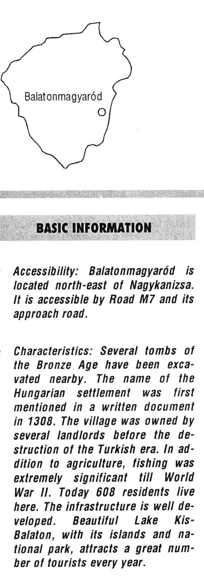 Nyilvános 2138 | 5966 | Balatonmagyaród | BASIC INFORMATION Accessibility: Balatonmagyaród is located north-east of Nagykanizsa. It is accessible by Road M7 and its approach road. Characteristics: Several tombs of the Bronze Age have been excavated nearby. The name of the Hungarian settlement was first mentioned in a written document in 1308. The village was owned by several landlords before the destruction of the Turkish era. In addition to agriculture, fishing was extremely significant till World War II. Today 608 residents live here. The infrastructure is well developed. Beautiful Lake Kis-Balaton, with its islands and national park, attracts a great number of tourists every year. This text came from the following book: Title: Handbook of Zala county (Zala megye kézikönyve) Series: County handbooks of Hungary (Magyarország megyei kézikönyvei) Chief editor: Hóbor József Publisher: (Hatvan), CEBA-Hungary Ltd, 1998 ETO: 908.439.121(035) ; 050.8(439.121) ISBN: 963-9089-18-2 Pages: 488-1040 p. Remark: Closed on: 1998. márc. 31. |