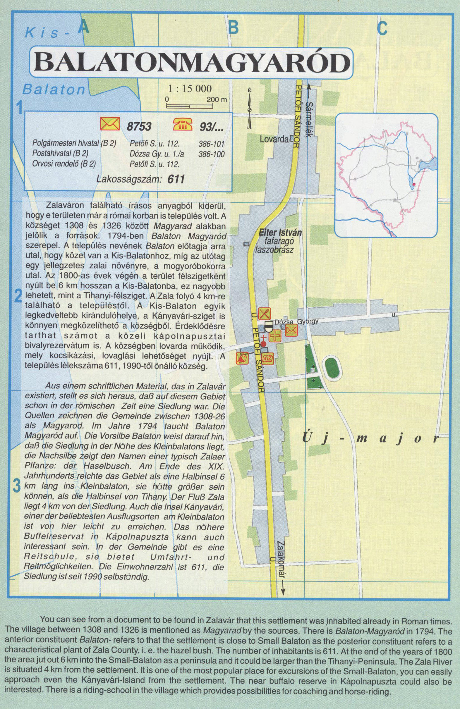 Nyilvános 2275 | 9748 | BALATONMAGYARÓD | Zalaváron található írásos anyagból kiderül, hogy e területen már a római korban is település volt. A községet 1308 és 1326 között Magyaród alakban jelölik a források. 1794-ben Balaton Magyaród szerepel. A település nevének Balaton előtagja arra utal, hogy közel van a Kis-Balatonhoz, míg az utótag egy jellegzetes zalai növényre, a mogyoróbokorra utal. Az 1800-as évek végén a terület félszigetként nyúlt be 6 km hosszan a Kis-Balatonba, ez nagyobb lehetett, mint a Tihanyi-félsziget. A Zala folyó 4 km-re található a településtől. A Kis-Balaton egyik legkedveltebb kirándulóhelye, a Kányayári-sziget is könnyen megközelíthető a községből. Érdeklődésre tarthat számot a közeli kápolnapusztai bivalyrezervátum is. A községben lovarda működik, mely kocsikázási, lovaglási lehetőséget nyújt. A I település lélekszáma 611, 1990-től önálló község. Aus einem schriftlichen Material, das in Zalavár existiert, stellt es sich heraus, daß auf diesem Gebiet schon in der römischen Zeit eine Siedlung war. Die Quellen zeichnen die Gemeinde zwischen 1308-26 als Magyarod. Im Jahre 1794 taucht Balaton Magyaród auf. Die Vorsilbe Balaton weist darauf hin, daß die Siedlung in der Nöhe des Kleinbalatons liegt, die Nachsilbe zeigt den Namen einer typisch Zalaer Plfanze: der Haselbusch. Am Ende des XIX. Jahrhunderts reichte das Gebiet als eine Halbinsel 6 km lang ins Kleinbalaton, sie hätte größer sein können, als die Halbinsel von Tihany. Der Fluß Zala liegt 4 km von der Siedlung. Auch die Insel Kányavári, einer der beliebtesten Ausflugsorten am Kleinbalaton ist von hier leicht zu erreichen. Das nähere Buffelreservat in Kápolnapuszta kann auch interessant sein. In der Gemeinde gibt es eine Reitschule, sie bietet Umfahrt-und Reitmöglichkeiten. Die Einwohnerzahl ist 611, die Siedlung ist seit 1990 selbständig You can see from a document to be found in Zalavár that this settlement was inhabited already in Roman times. The village between 1308 and 1326 is mentioned as Magyarad by the sources. There is Balaton-Magyarod in 1794. The anterior constituent Balaton- refers to that the settlement is close to Small Balaton as the posterior constituent refers to a characteristical plant of Zala County, i. e. the hazel bush. The number of inhabitants is 611. At the end of the years of 1800 the area jut out 6 km into the Small-Balaton as a peninsula and it could be larger than the Tihanyi-Peninsula. The Zala River is situated 4 km from the settlement. It is one of the most popular place for excursions of the Small-Balaton, you can easily approach even the Kányavári-Island from the settlement. The near buffalo reserve in Kápolnapuszta could also be interested. There is a riding-school in the village which provides possibilities for coaching and horse-riding. A részlet a következő kiadványból származik/Die Teile stammen vom volgenden Buch/This text came from the following book: Cím/Titel/Title: Zala megye településeinek atlasza - 257 település részletes térképe/Atlas der Komitat Zala - 257 Detailte Siedlungskarten/Zala county\'s Atlas - 257 settlement maps. Közreműködő/contributor: Lackner László (1943) (fotó) Kiadás/Ausgabe/Publisher: Gyula : HISZI-MAP, 1997 Sorozat/Serie/Series: Indulástól - megérkezésig... ETO: 912(439.121-2) ; 908.439.121 Cutter: Z 19 ISBN: 963-610-025-4 Oldalszám/Seiten/Pages: 323, 81 p. Megjegyzés/Note: Lezárva/Abgeschlossen am/Closed am: 1997. máj. 30. |