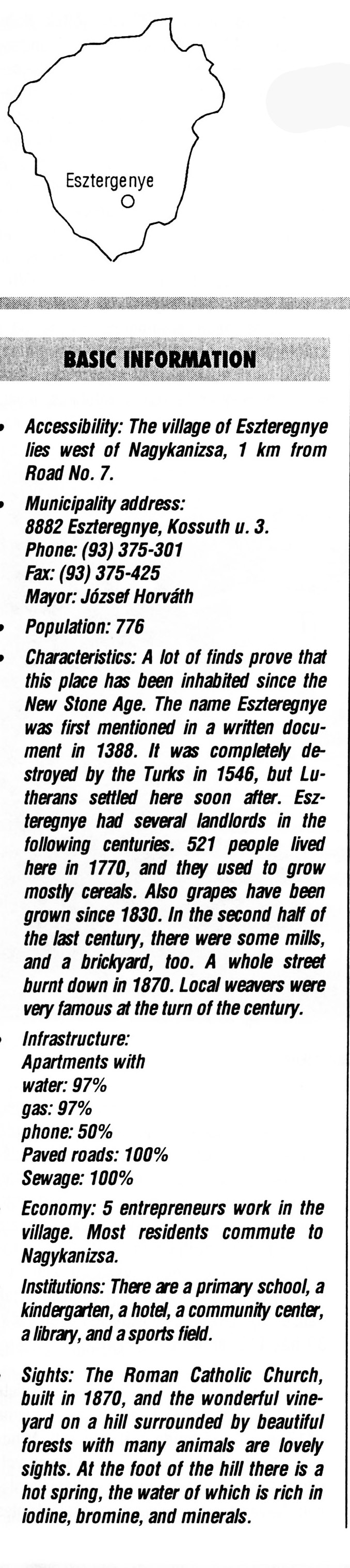 Nyilvános 2508 | 9303 | Eszteregnye | BASIC INFORMATION Accessibility: The village of Eszteregnye lies west of Nagykanizsa, 1 km from Road No. 7. Municipality address: 8882 Eszteregnye, Kossuth u. 3. Phone: (93) 375-301 Fax: (93) 375-425 Mayor: József Horváth Population: 776 Characteristics: A lot of finds prove that this place has been inhabited since the New Stone Age. The name Eszteregnye was first mentioned in a written document in 1388. It was completely destroyed by the Turks in 1546, but Lutherans settled here soon after. Eszteregnye had several landlords in the following centuries. 521 people lived here in 1770, and they used to grow mostly cereals. Also grapes have been grown since 1830. In the second half of the last century, there were some mills, and a brickyard, too. A whole street burnt down in 1870. Local weavers were very famous at the turn of the century. Infrastructure: Apartments with water: 97% gas: 97% phone: 50% Paved roads: 100% Sewage: 100% Economy: 5 entrepreneurs work in the village. Most residents commute to Nagykanizsa. Institutions: There are a primary school, a kindergarten, a hotel, a community center, a library, and a sports field. Sights: The Roman Catholic Church, built in 1870, and the wonderful vineyard on a hill surrounded by beautiful forests with many animals are lovely sights. At the foot of the hill there is a hot spring, the water of which is rich in iodine, bromine, and minerals. This text came from the following book: Title: Handbook of Zala county (Zala megye kézikönyve) Series: County handbooks of Hungary (Magyarország megyei kézikönyvei) Chief editor: Hóbor József Publisher: (Hatvan), CEBA-Hungary Ltd, 1998 ETO: 908.439.121(035) ; 050.8(439.121) ISBN: 963-9089-18-2 Pages: 488-1040 p. Remark: Closed on: 1998. márc. 31. |