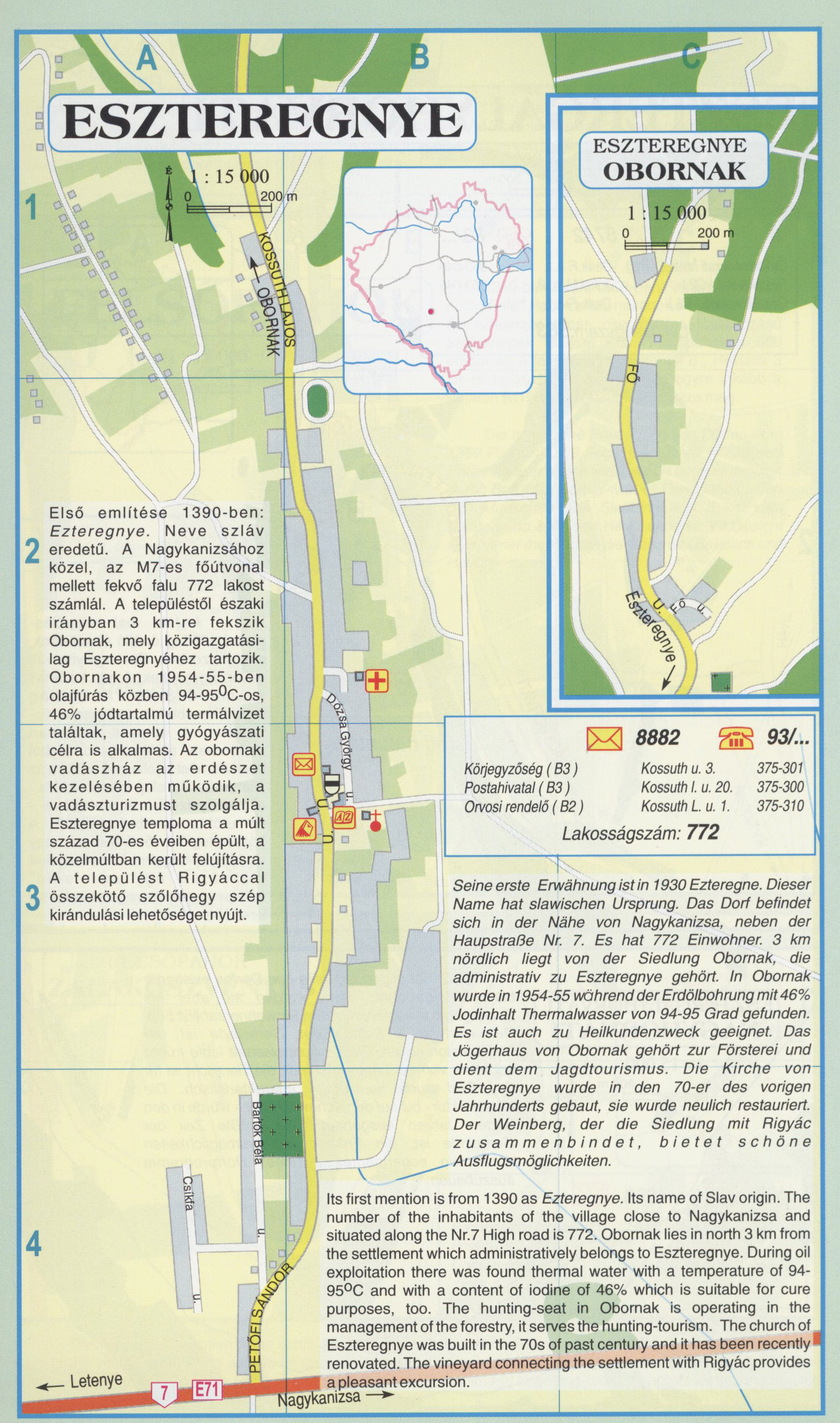 Nyilvános 2567 | 9913 | Eszteregnye | Első említése 1390-ben: Ezteregnye. Neve szláv eredetű. A Nagykanizsához közel, az M7-es főútvonal mellett fekvő falu 772 lakost számlál. A településtől északi irányban 3 km-re fekszik Obornak, mely közigazgatási-lag Eszteregnyéhez tartozik. Obornakon 1954-55-ben olajfúrás közben 94-95°C-os 46% jódtartalmú termálvizet találtak, amely gyógyászati célra is alkalmas. Az obornaki vadászház az erdészet kezelésében működik, a vadászturizmust szolgálja. Eszteregnye temploma a múlt század 70-es éveiben épült, a közelmúltban került felújításra. A települést Rigyáccal összekötő szőlőhegy szép kirándulási lehetőséget nyújt. Seine erste Erwähnung ist in 1930 Ezteregne. Dieser Name hat slawischen Ursprung. Das Dorf befindet sich in der Nähe von Nagykanizsa, neben der Haupstraße Nr. 7. Es hat 772 Einwohner. 3 km nördlich liegt von der Siedlung Obornak, die administrativ zu Eszteregnye gehört. In Obornak wurde in 1954-55 während der Erdölbohrung mit 46% Jodinhalt Thermalwasser von 94-95 Grad gefunden. Es ist auch zu Heilkundenzweck geeignet. Das Jägerhaus von Obornak gehört zur Försterei und dient dem Jagdtourismus. Die Kirche von-Eszteregnye wurde in den 70-er des vorigen Jahrhunderts gebaut, sie wurde neulich restauriert. Der Weinberg, der die Siedlung mit Rigyác zusammenbindet, bietet schöne Ausflugsmöglichkeiten. Its first mention is from 1390 as Ezteregnye. Its name of Slav origin. The number of the inhabitants of the village close to Nagykanizsa and situated along the Nr.7 High road is 772. Obornak lies in north 3 km from the settlement which administratively belongs to Eszteregnye. During oil exploitation there was found thermal water with a temperature of 94-95°C and with a content of iodine of 46% which is suitable for cure purposes, too. The hunting-seat in Obornak is operating in the management of the forestry, it serves the hunting-tourism. The church of. Eszteregnye was built in the 70s of past century and it has been recently\' renovated. The vineyard connecting the settlement with Rigyác provides a pleasant excursion. A részlet a következő kiadványból származik/Die Teile stammen vom volgenden Buch/This text came from the following book: Cím/Titel/Title: Zala megye településeinek atlasza - 257 település részletes térképe/Atlas der Komitat Zala - 257 Detailte Siedlungskarten/Zala county\'s Atlas - 257 settlement maps. Közreműködő/contributor: Lackner László (1943) (fotó) Kiadás/Ausgabe/Publisher: Gyula : HISZI-MAP, 1997 Sorozat/Serie/Series: Indulástól - megérkezésig... ETO: 912(439.121-2) ; 908.439.121 Cutter: Z 19 ISBN: 963-610-025-4 Oldalszám/Seiten/Pages: 323, 81 p. Megjegyzés/Note: Lezárva/Abgeschlossen am/Closed am: 1997. máj. 30. |