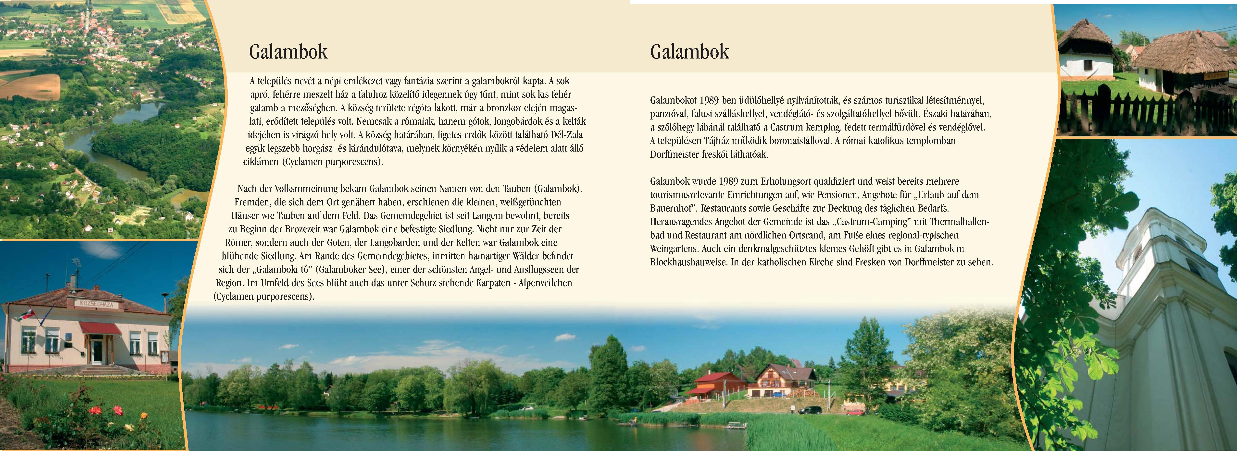 Nyilvános 2448 | 7025 | Galambok | Nach der Volksmmeinung bekam Galambok seinen Namen von den Tauben (Galambok). Fremden, die sich dem Ort genähert haben, erschienen die kleinen, weißgetünchten Häuser wie Tauben auf dem Feld. Das Gemeindegebiet ist seit Langem bewohnt, bereits zu Beginn der Brozezeit war Galambok eine befestigte Siedlung. Nicht nur zur Zeit der Römer, sondern auch der Goten, der Langobarden und der Kelten war Galambok eine blühende Siedlung. Am Rande des Gemeindegebietes, inmitten hainartiger Wälder befindet sich der ,,Galamboki tó" (Galamboker See), einer der schönsten Angel- und Ausflugsseen der Region. Im Umfeld des Sees blüht auch das unter Schutz stehende Karpaten – Alpenveilchen (Cyclamen purporescens). Galambok wurde 1989 zum Erholungsort qualifiziert und weist bereits mehrere tourismusrelevante Einrichtungen auf, wie Pensionen, Angebote für ,,Urlaub auf dem Bauernhof", Restaurants sowie Geschäfte zur Deckung des täglichen Bedarfs. Herausragendes Angebot der Gemeinde ist das ,,Castrum-Camping" mit Thermalhallenbad und Restaurant am nördlichen Ortsrand, am Fuße eines regional-typischen Weingartens. Auch ein denkmalgeschütztes kleines Gehöft gibt es in Galambok in Blockhausbauweise. In der katholischen Kirche sind Fresken von Dorffmeister zu sehen. Dieses Text stammt von: Pannonhát tájpark prospektus 2006. Web: http://www.pannonhat.hu/ (auch in Deutsch) |