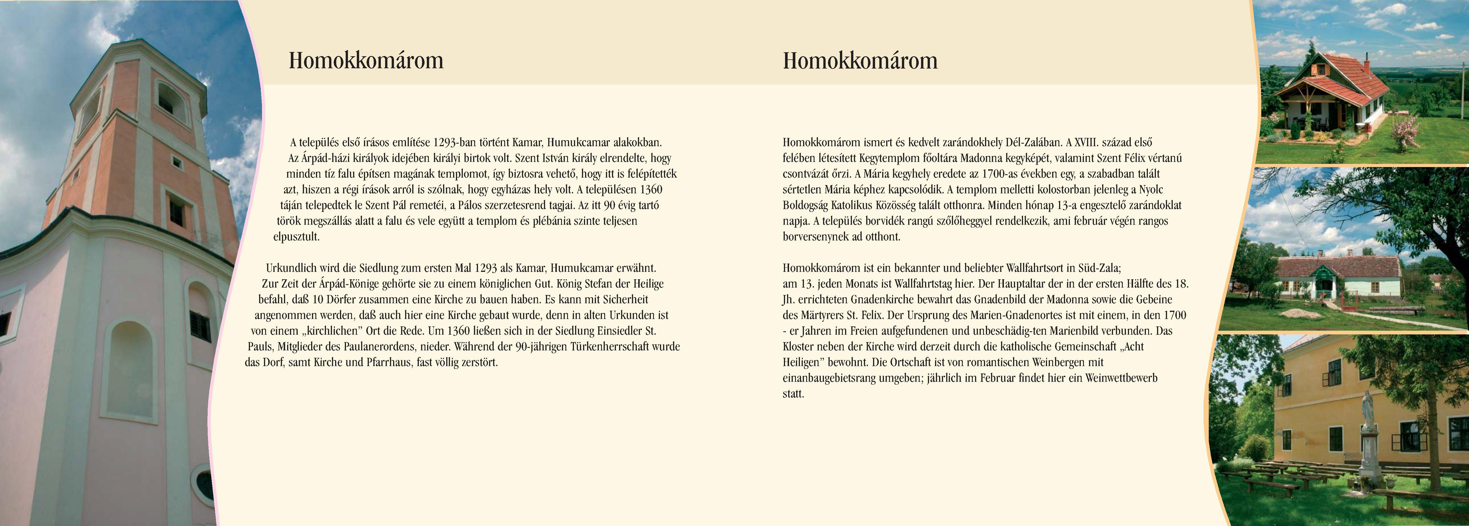 Nyilvános 2457 | 8296 | Homokkomárom | Urkundlich wird die Siedlung zum ersten Mal 1293 als Kamar, Humukcamar erwähnt. Zur Zeit der Árpád-Könige gehörte sie zu einem königlichen Gut. König Stefan der Heilige befahl, daß 10 Dörfer zusammen eine Kirche zu bauen haben. Es kann mit Sicherheit angenommen werden, daß auch hier eine Kirche gebaut wurde, denn in alten Urkunden ist von einem ,,kirchlichen" Ort die Rede. Um 1360 ließen sich in der Siedlung Einsiedler St. Pauls, Mitglieder des Paulanerordens, nieder. Während der 90-jährigen Türkenherrschaft wurde das Dorf, samt Kirche und Pfarrhaus, fast völlig zerstört. Homokkomárom ist ein bekannter und beliebter Wallfahrtsort in Süd-Zala; am 13. jeden Monats ist Wallfahrtstag hier. Der Hauptaltar der in der ersten Hälfte des 18. Jh. errichteten Gnadenkirche bewahrt das Gnadenbild der Madonna sowie die Gebeine des Märtyrers St. Felix. Der Ursprung des Marien-Gnadenortes ist mit einem, in den 1700 - er Jahren im Freien aufgefundenen und unbeschädig-ten Marienbild verbunden. Das Kloster neben der Kirche wird derzeit durch die katholische Gemeinschaft ,,Acht Heiligen" bewohnt. Die Ortschaft ist von romantischen Weinbergen mit einanbaugebietsrang umgeben; jährlich im Februar findet hier ein Weinwettbewerb statt. Dieses Text stammt von: Pannonhát tájpark prospektus 2006. Web: http://www.pannonhat.hu/ (auch in Deutsch) |