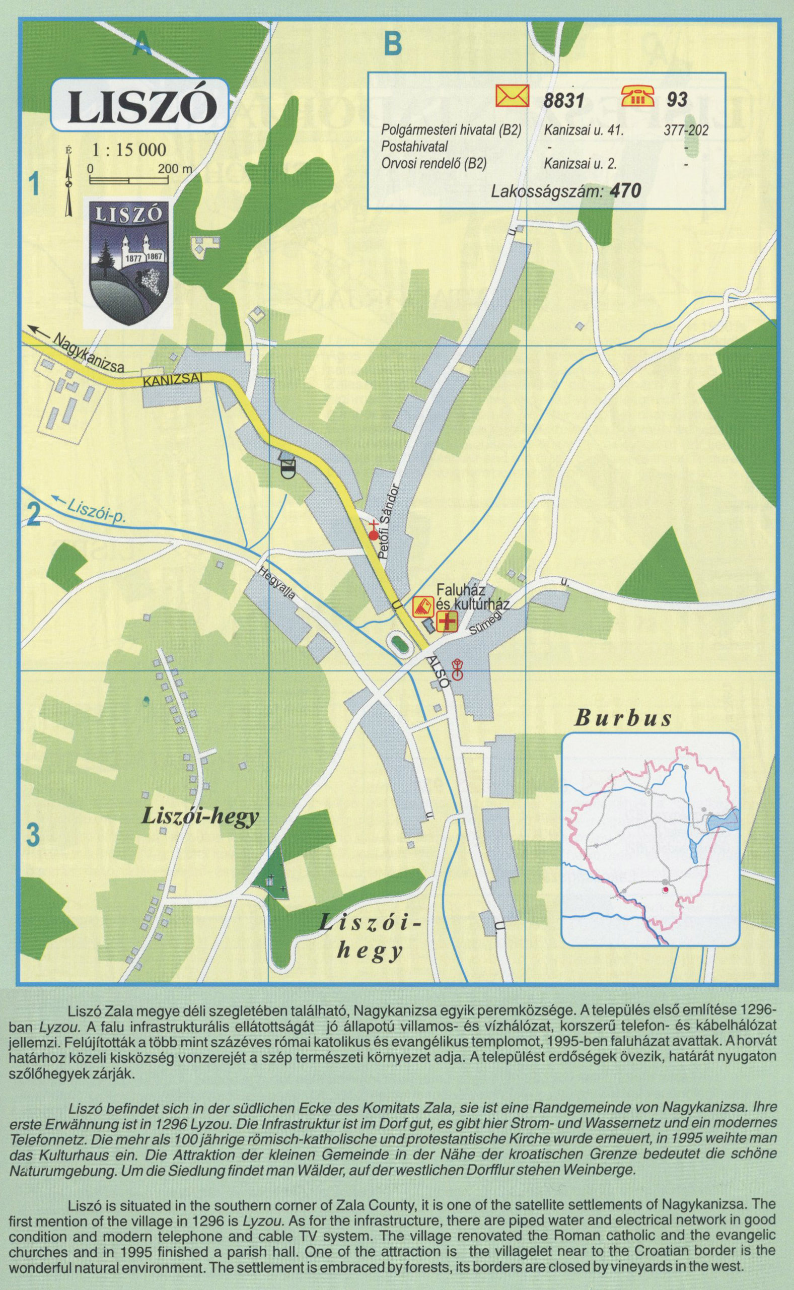 Nyilvános 2572 | 10237 | Liszó | Liszó Zala megye déli szegletében található, Nagykanizsa egyik peremközsége. A település első említése 1296-ban Lyzou. A falu infrastrukturális ellátottságát jó állapotú villamos- és vízhálózat, korszerű telefon- és kábelhálózat jellemzi. Felújították a több mint százéves római katolikus és evangélikus templomot, 1995-ben faluházat avattak. A horvát határhoz közeli kisközség vonzerejét a szép természeti környezet adja. A települést erdőségek övezik, határát nyugaton szőlőhegyek zárják. Liszó befindet sich in der südlichen Ecke des Komitats Zala, sie ist eine Randgemeinde von Nagykanizsa. Ihre erste Erwähnung ist in 1296 Lyzou. Die Infrastruktur ist im Dorf gut, es gibt hier Strom- und Wassernetz und ein modernes Telefonnetz. Die mehr als 100 jährige römisch-katholische und protestantische Kirche wurde erneuert, in 1995 weihte man das Kulturhaus ein. Die Attraktion der kleinen Gemeinde in der Nähe der kroatischen Grenze bedeutet die schöne Naturumgebung. Um die Siedlung findet man Wälder, auf der westlichen Dortflur stehen Weinberge. Liszó is situated in the southern corner of Zala County, it is one of the satellite settlements of Nagykanizsa. The first mention of the village in 1296 is Lyzou. As for the infrastructure, there are piped water and electrical network in good condition and modern telephone and cable TV system. The village renovated the Roman catholic and the evangelic churches and in 1995 finished a parish hall. One of the attraction is the villagelet near to the Croatian border is the wonderful natural environment. The settlement is embraced by forests, its borders are closed by vineyards in the west. A részlet a következő kiadványból származik/Die Teile stammen vom volgenden Buch/This text came from the following book: Cím/Titel/Title: Zala megye településeinek atlasza - 257 település részletes térképe/Atlas der Komitat Zala - 257 Detailte Siedlungskarten/Zala county\'s Atlas - 257 settlement maps. Közreműködő/contributor: Lackner László (1943) (fotó) Kiadás/Ausgabe/Publisher: Gyula : HISZI-MAP, 1997 Sorozat/Serie/Series: Indulástól - megérkezésig... ETO: 912(439.121-2) ; 908.439.121 Cutter: Z 19 ISBN: 963-610-025-4 Oldalszám/Seiten/Pages: 323, 81 p. Megjegyzés/Note: Lezárva/Abgeschlossen am/Closed am: 1997. máj. 30. |