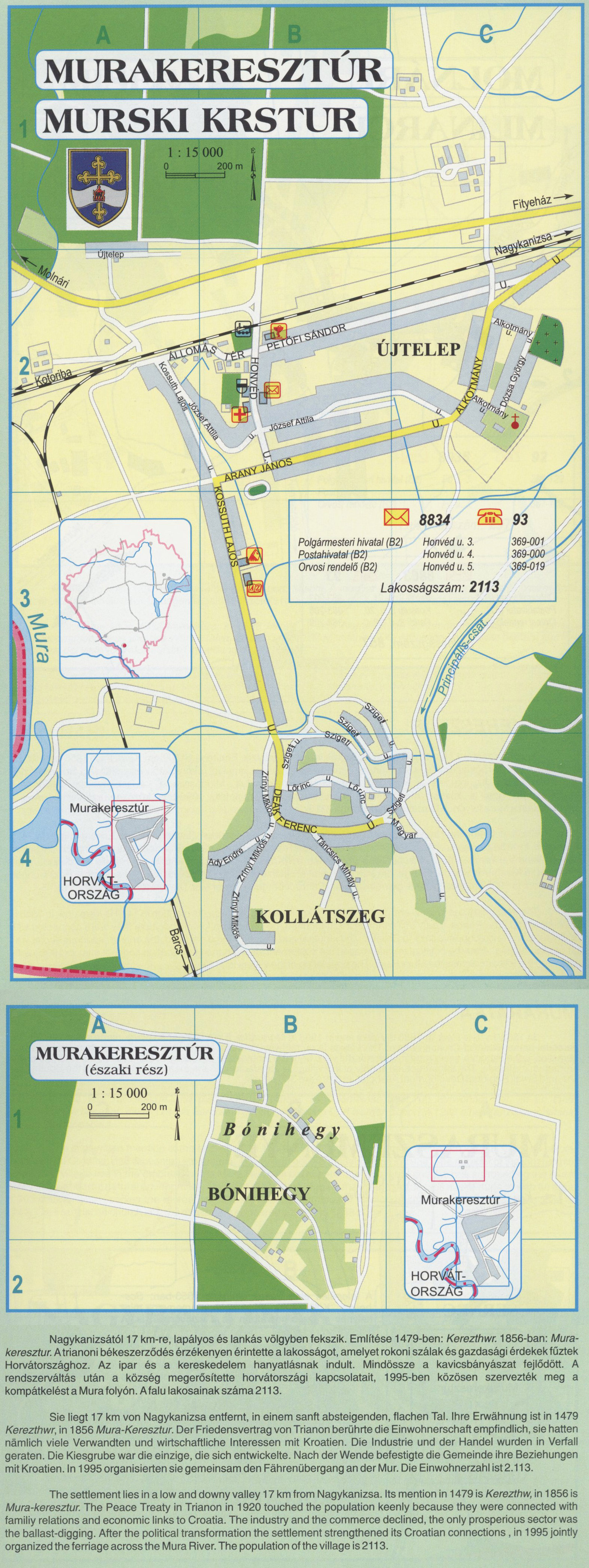 Nyilvános 2018 | 8103 | Rövid leírás | Teljes leírás (2.44 KB) | MURAKERESZTÚR Nagykanizsától 17 km-re, lapályos és lankás völgyben fekszik. Említése 1479-ben: Kerezthwr. 1856-ban: Mura-keresztur. A trianoni békeszerződés érzékenyen érintette a lakosságot, amelyet rokoni szálak és gazdasági érdekek fűztek Horvátországhoz. Az ipar és a kereskedelem hanyatlásnak indult. Mindössze a kavicsbányászat fejlődött. A rendszerváltás után a község megerősítette horvátországi kapcsolatait, 1995-ben közösen szervezték meg a kompátkelést a Mura folyón. A falu lakosainak száma 2113. Sie liegt 17 km von Nagykanizsa entfernt, in einem sanft absteigenden, flachen Tal. Ihre Erwähnung ist in 1479 Kerezthwr, in 1856 Mura-Keresztur. Der Friedensvertrag von Trianon berührte die Einwohnerschaft empfindlich, sie hatten nämlich viele Verwandten und wirtschaftliche Interessen mit Kroatien. Die Industrie und der Handel wurden in Verfall geraten. Die Kiesgrube war die einzige, die sich entwickelte. Nach der Wende befestigte die Gemeinde ihre Beziehungen mit Kroatien. In 1995 organisierten sie gemeinsam den Fährenübergang an der Mur. Die Einwohnerzahl ist2.113. The settlement lies in a low and downy valley 17 km from Nagykanizsa. Its mention in 1479 is Kerezthw, in 1856 is Mura-keresztur. The Peace Treaty in Trianon in 1920 touched the population keenly because they were connected with familiy relations and economic links to Croatia. The industry and the commerce declined, the only prosperious sector was the ballast-digging. After the political transformation the settlement strengthened its Croatian connections , in 1995 jointly organized the ferriage across the Mura River. The population of the village is 2113. A részlet a következő kiadványból származik/Die Teile stammen vom volgenden Buch/This text came from the following book: Cím/Titel/Title: Zala megye településeinek atlasza - 257 település részletes térképe/Atlas der Komitat Zala - 257 Detailte Siedlungskarten/Zala county\'s Atlas - 257 settlement maps. Közreműködő/contributor: Lackner László (1943) (fotó) Kiadás/Ausgabe/Publisher: Gyula : HISZI-MAP, 1997 Sorozat/Serie/Series: Indulástól - megérkezésig... ETO: 912(439.121-2) ; 908.439.121 Cutter: Z 19 ISBN: 963-610-025-4 Oldalszám/Seiten/Pages: 323, 81 p. Megjegyzés/Note: Lezárva/Abgeschlossen am/Closed am: 1997. máj. 30. |