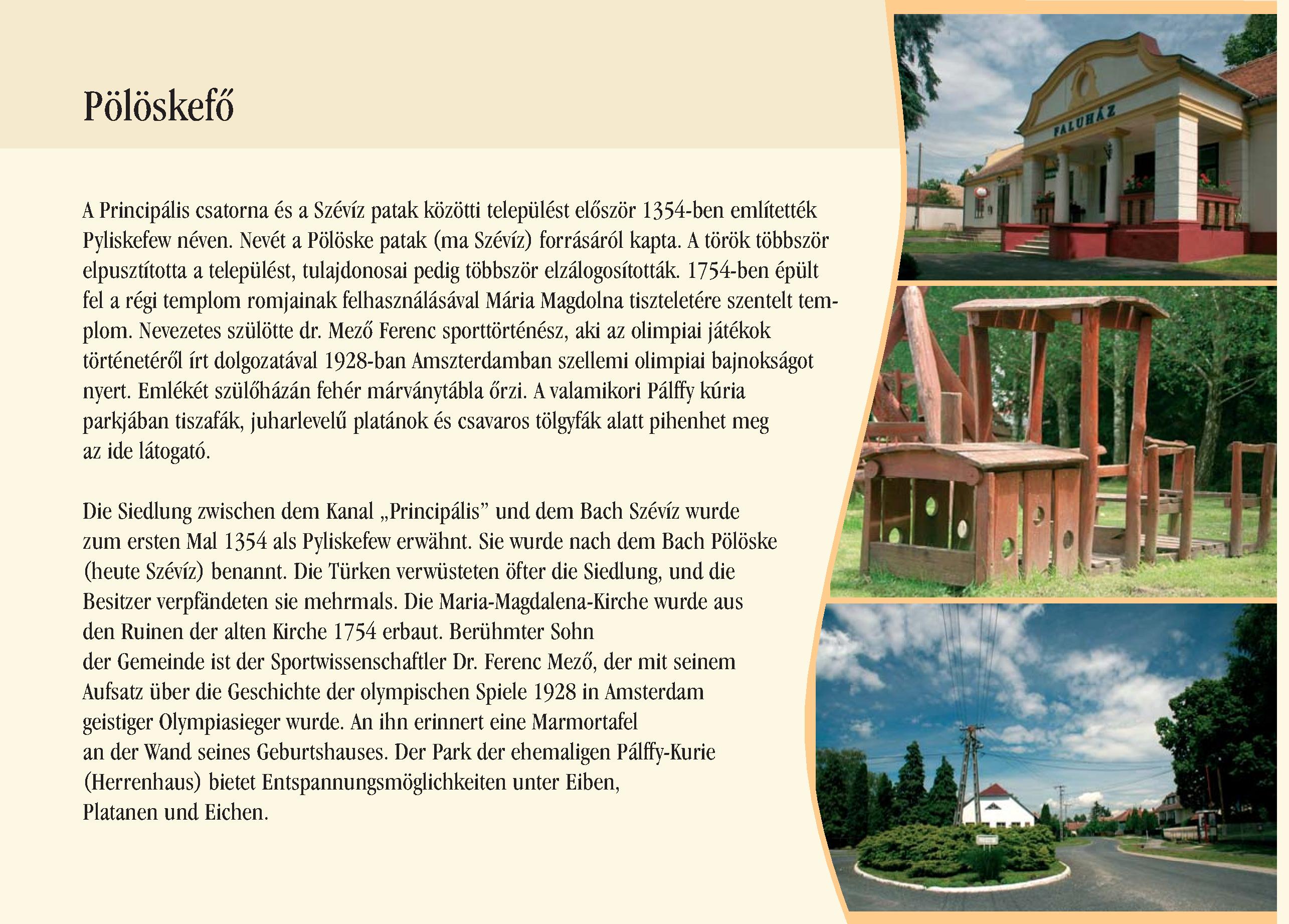 Nyilvános 2827 | 7361 | Pölöskefő | Die Siedlung zwischen dem Kanal ,,Principális" und dem Bach Szévíz wurde zum ersten Mal 1354 als Pyliskefew erwähnt. Sie wurde nach dem Bach Pölöske (heute Szévíz) benannt. Die Türken verwüsteten öfter die Siedlung, und die Besitzer verpfändeten sie mehrmals. Die Maria-Magdalena-Kirche wurde aus den Ruinen der alten Kirche 1754 erbaut. Berühmter Sohn der Gemeinde ist der Sportwissenschaftler Dr. Ferenc Mező, der mit seinem Aufsatz über die Geschichte der olympischen Spiele 1928 in Amsterdam geistiger Olympiasieger wurde. An ihn erinnert eine Marmortafel an der Wand seines Geburtshauses. Der Park der ehemaligen Pálffy-Kurie (Herrenhaus) bietet Entspannungsmöglichkeiten unter Eiben, Platanen und Eichen. Dieses Text stammt von: Pannonhát tájpark prospektus 2006. Web: http://www.pannonhat.hu/ (auch in Deutsch) |