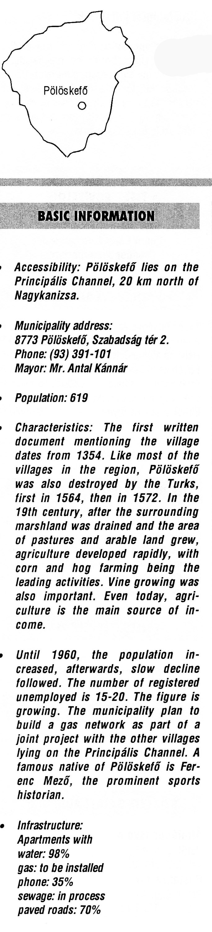 Nyilvános 2840 | 7004 | Pölöskefő | BASIC INFORMATION Accessibility: Pölöskefő lies on the Principális Channel, 20 km north of Nagykanizsa. Municipality address: 8773 Pölöskefő, Szabadság tér 2. Phone: (93) 391-101 Mayor: Mr. Antal Kánnár Population: 619 Characteristics: The first written document mentioning the village dates from 1354. Like most of the villages in the region, Pölöskefő was also destroyed by the Turks, first in 1564, then in 1572. In the 19th century, after the surrounding marshland was drained and the area of pastures and arable land grew, agriculture developed rapidly, with corn and hog farming being the leading activities. Vine growing was also important. Even today, agriculture is the main source of income. Until 1960, the population increased, afterwards, slow decline followed. The number of registered unemployed is 15-20. The figure is growing. The municipality plan to build a gas network as part of a joint project with the other villages lying on the Principális Channel. A famous native of Pölöskefő is Ferenc Mező, the prominent sports historian. Infrastructure: Apartments with water: 98% gas: to be installed phone: 35% sewage: in process paved roads: 70% This text came from the following book: Title: Handbook of Zala county (Zala megye kézikönyve) Series: County handbooks of Hungary (Magyarország megyei kézikönyvei) Chief editor: Hóbor József Publisher: (Hatvan), CEBA-Hungary Ltd, 1998 ETO: 908.439.121(035) ; 050.8(439.121) ISBN: 963-9089-18-2 Pages: 488-1040 p. Remark: Closed on: 1998. márc. 31. |