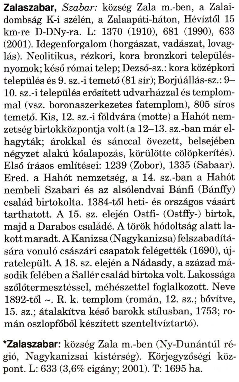 Nyilvános 2294 | 5883 | A szócikkek felismertetett szövege: | (A csillag után a kiegészítő kötetből származó szöveg következik) Zalaszabar, Szabar: község Zala m.-ben, a Zalai-dombság K-i szélén, a Zalaapáti-háton, Hévíztől 15 km-re D-DNy-ra. L: 1370 (1910), 681 (1990), 633 (2001). Idegenforgalom (horgászat, vadászat, lovaglás). Neolitikus, rézkori, kora bronzkori településnyomok; késő római telep; Dezső-sz.: kora középkori település és 9. sz.-i temető (81 sír); Borjúállás-sz.: 9— 10. sz.-i település erősített udvarházzal és templommal (vsz. boronaszerkezetes fatemplom), 805 síros temető. Kis, 12. sz.-i földvára (motte) a Hahót nemzetség birtokközpontja volt (a 12—13. sz.-ban már elhagyták; árokkal és sánccal övezett, belsejében négyzet alakú kőalapozás, körülötte cölöpkerítés). Első írásos említései: 1239 (Zobor), 1335 (Sabaar). Ered. a Hahót nemzetség, a 14. sz.-ban a Hahót nembeli Szabari és az alsólendvai Bánfi (Bánffy) család birtokolta. 1384-től heti- és országos vásárt tarthatott. A 15. sz. elején Ostfi- (Ostffy-) birtok, majd a Darabos családé. A török hódoltság alatt lakott maradt. A Kanizsa (Nagykanizsa) felszabadítására vonuló császári csapatok felégették (1690), újratelepült. A 18. sz. elején a Nádasdy, a század második felében a Sallér család birtoka volt. Lakossága szőlőtermesztéssel, méhészettel foglalkozott. Neve 1892-től ~. R. k. templom (román, 12. sz.; bővítve, 15. sz.; átalakítva késő barokk stílusban, 1753; román oszlopfőből készített szenteltvíztartó). *Zalaszabar: község Zala m.-ben (Ny-Dunántúl régió, Nagykanizsai kistérség). Körjegyzőségi központ. L: 633 (3,6% cigány; 2001). T: 1695 ha. A szócikkek a következő lexikonból származnak: Cím: Magyar nagylexikon Közreműködő: Élesztős László (1949) (szerk.) ; Barabás Éva (1943) (szerk.) ; Berényi Gábor (1946) (szerk.) ; Bárány Lászlóné (szerk.) ; Adelmann-né Kertész Judit (1945) (közrem.) ; Froemel Károlyné Jáky Éva (1936) (közrem.) ; Akadémiai Kiadó és Nyomda Vállala Szerz. közl.: [... Élesztős László főszerk.] ; [szerk. Barabás Éva et al.] ; [bibliogr. Adelmanné Kertész Judit] ; [kész. az Akadémiai Kiadó Magyar Nagylexikon Szerkesztőségében] Kiadás: Budapest : Akad. K., 1993- Kötetei: 1. köt., A - Anc 2. köt., And - Bag 3. köt., Bah - Bij 4. köt., Bik - Bz 5. köt., C - Csem 6. köt., Csen - Ec 7. köt., Ed - Fe 8. köt., Ff - Gyep 9. köt., Gyer - Iq 10. köt., Ir - Kip 11. köt., Kir - Lem 12. köt., Len - Mep 13. köt., Mer - Nyk 14. köt., Nyl - Pom 15. köt., Pon - Sek 16. köt., Sel - Szö 17. köt., Szp - Ung 18. köt., Unh - Z 19. köt., Kiegészítő kötet, A - Z ETO jelzet: 030=945.11 Szakjelzet: 030 Cutter: M 14 ISBN: 963-05-6611-7 [!ISBN 963-05-6615-X] Nyelv: magyar Megjegyzés: Az 5. kötettől kiad. a Magyar Nagylexikon Kiadó ; A 6. kötettől főszerk. Berényi Gábor ; A 6. kötettől szakszerk. Bárány Lászlóné et al. ; A 6. kötettől bibliogr. Froemel Károlyné ; Bibliogr. a szócikkek végén |