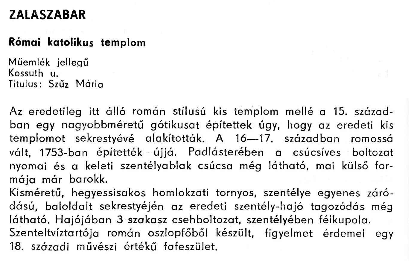 Nyilvános 2135 | 5617 | Zalaszabar - Zala megye műemlékei 1979 119-120old | A részlet szövege: ZALASZABAR Római katolikus templom Műemlék jellegű Kossuth u. Titulus: Szűz Mária Az eredetileg itt álló román stílusú kis templom mellé a 15. században egy nagyobbméretű gótikusat építettek úgy, hogy az eredeti kis templomot sekrestyévé alakították. A 16–17. században romossá vált, 1753-ban építették újjá. Padlásterében a csúcsíves boltozat nyomai és a keleti szentélyablak csúcsa még látható, mai külső formája már barokk. Kisméretű, hegyessisakos homlokzati tornyos, szentélye egyenes záródású, baloldalt sekrestyéjén az eredeti szentély-hajó tagozódás még látható. Hajójában 3 szakasz csehboltozat, szentélyében félkupola. Szenteltvíztartója román oszlopfőből készült, figyelmet érdemel egy 18. századi művészi értékű fafeszület. A részlet a következő könyvből származik: Cím: Zala megye műemlékei Szerző: Németh József (1928) Közreműködő: Vándor László (szerk.) ; Szabóky Zsolt (1941) (fotó) Szerz. közl.: Németh József ; [szerk. Vándor László] ; [fotók... Szabóky Zsolt] Kiadás jelzés: 2. bőv. kiad. Kiadás: Zalaegerszeg : Zalai Ny., 1979 ETO jelzet: 72(439.121) ; 7.025.3/.4(439.121) ; 908.439.121 Tárgyszó: Zala Szakjelzet: 908 Cutter: N 53 Nyelv: magyar Oldalszám: 134 p. |