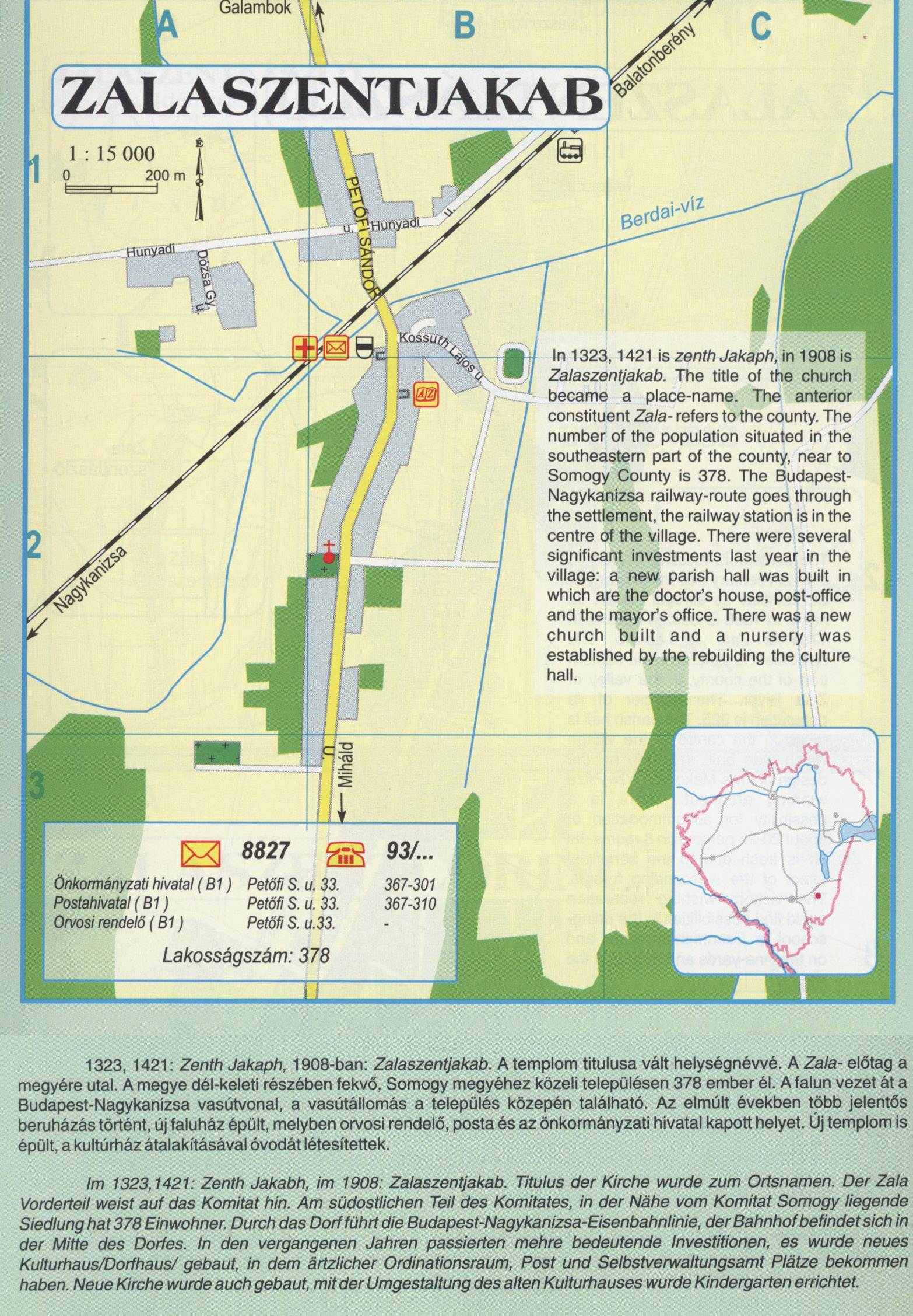 Nyilvános 2008 | 6788 | ZALASZENTJAKAB | 1323, 1421: Zenth Jakaph, 1908-ban: Zalaszentjakab. A templom titulusa vált helységnévvé. A Zala- előtag a megyére utal. A megye dél-keleti részében fekvő, Somogy megyéhez közeli településen 378 ember él. A falun vezet át a Budapest-Nagykanizsa vasútvonal, a vasútállomás a település közepén található. Az elmúlt években több jelentős beruházás történt, új faluház épült, melyben orvosi rendelő, posta és az önkormányzati hivatal kapott helyet. Új templom is épült, a kultúrház átalakításával óvodát létesítettek. lm 1323,1421: Zenth Jakabh, im 1908: Zalaszentjakab. Titulus der Kirche wurde zum Ortsnamen. Der Zala Vorderteil weist auf das Komitat hin. Am südostlichen Teil des Komitates, in der Nähe vom Komitat Somogy liegende Siedlung hat 378 Einwohner. Durch das Dorf führt die Budapest-Nagykanizsa-Eisenbahnlinie, der Bahnhof befindet sich in der Mitte des Dorfes. In den vergangenen Jahren passierten mehre bedeutende Investitionen, es wurde neues Kulturhaus/Dorfhaus/ gebaut, in dem ärtzlicher Ordinationsraum, Post und Selbstverwaltungsamt Plätze bekommen haben. Neue Kirche wurde auch gebaut, mit der Umgestaltung des alten Kulturhauses wurde Kindergarten errichtet. In 1323,1421 is zenth Jakaph, in 1908 is Zalaszentjakab. The title of the church became a place-name. The anterior constituent Zala- refers to the county. The number of the population situated in the southeastern part of the county, near to Somogy County is 378. The Budapest-Nagykanizsa railway-route goes through the settlement, the railway station is in the centre of the village. There were several significant investments last year in the village: a new parish hall was built in which are the doctor\'s house, post-office and the mayor\'s office. There was a new church built and a nursery was established by the rebuilding the culture hall. A részlet a következő kiadványból származik/Die Teile stammen vom volgenden Buch/This text came from the following book: Cím/Titel/Title: Zala megye településeinek atlasza - 257 település részletes térképe/Atlas der Komitat Zala - 257 Detailte Siedlungskarten/Zala county\'s Atlas - 257 settlement maps. Közreműködő/contributor: Lackner László (1943) (fotó) Kiadás/Ausgabe/Publisher: Gyula : HISZI-MAP, 1997 Sorozat/Serie/Series: Indulástól - megérkezésig... ETO: 912(439.121-2) ; 908.439.121 Cutter: Z 19 ISBN: 963-610-025-4 Oldalszám/Seiten/Pages: 323, 81 p. Megjegyzés/Note: Lezárva/Abgeschlossen am/Closed am: 1997. máj. 30. |