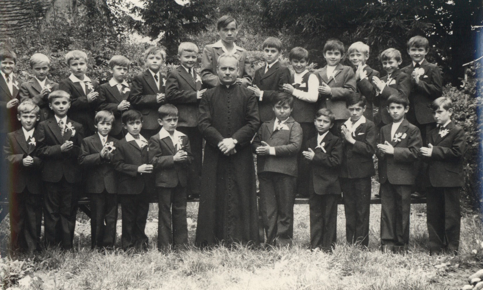 Nyilvános 1710 | 4228 | A régi iskola 1976-ban. A középen látható pap családi neve: Tihanyi. Személyek: | Hátsó sor balról jobbra: 1. ismeretlen 2. Pfeifer István 3-5. ismeretlen 6. Zsovár László 7. Dudli József 8. ismeretlen 9. Horváth László 10. Marton László 11. Csöndör László 12-13. ismeretlen Első sor balról jobbra: 1. Gulyás Ervin 2-3. ismeretlen 4. Baranyai László 5. Tömöri Ferenc 6. pap 7. Bognár József 8. ismeretlen 9. Tolnai Jenő 10-11. ismeretlen. |