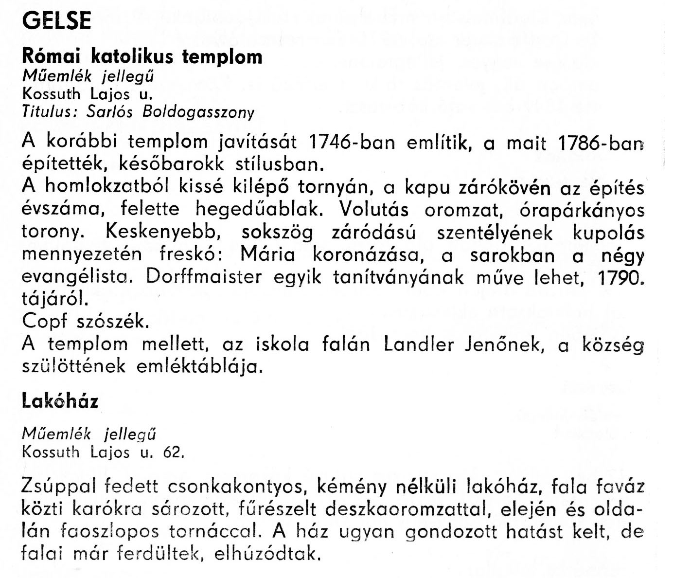 Nyilvános 1845 | 4085 | Gelse - Zala megye műemlékei 1977 058old | A részlet szövege: GELSE Római katolikus templom Műemlék jellegű Kossuth Lajos u. Titulus: Sarlós Boldogasszony A korábbi templom javítását 1746-ban említik, a mait 1786-ban építették, későbarokk stílusban. A homlokzatból kissé kilépő tornyán, a kapu zárókövén az építés évszáma, felette hegedűablak. Volutás oromzat, órapárkányos torony. Keskenyebb, sokszög záródású szentélyének kupolás mennyezetén freskó: Mária koronázása, a sarokban a négy evangélista. Dorffmaister egyik tanítványának műve lehet, 1790. tájáról. Copf szószék. A templom mellett, az iskola falán Landler Jenőnek, a község szülöttének emléktáblája. Lakóház Műemlék jellegű Kossuth Lajos u. 62. Zsúppal fedett csonkakontyos, kémény nélküli lakóház, fala faváz közti karókra sározott, fűrészelt deszkaoromzattal, elején és oldalán faoszlopos tornáccal. A ház ugyan gondozott hatást kelt, de falai már ferdültek, elhúzódtak. A részlet a következő könyvből származik: Cím: Zala megye műemlékei Szerző: Németh József (1928) Közreműködő: Lantos Miklós (fotó) Szerz. közl.: Németh József ; [fotók... Lantos Miklós] Kiadás: Zalaegerszeg : Zalai Ny., 1977 ETO jelzet: 72(439.121) ; 7.025.3/.4 ; 908.439.121 Tárgyszó: Zala megye Szakjelzet: 908 Cutter: N 53 Nyelv: magyar Oldalszám: 109 p. |
