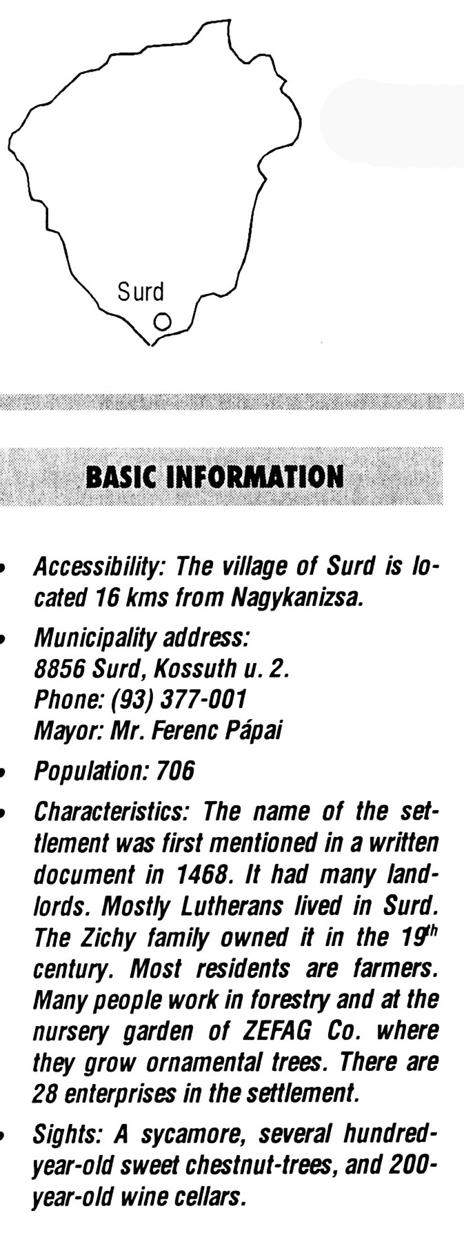 Nyilvános 2411 | 6411 | Surd | BASIC INFORMATION Accessibility: The village of Surd is located 16 kms from Nagykanizsa. Municipality address: 8856 Surd, Kossuth u. 2. Phone: (93) 377-001 Mayor: Mr. Ferenc Pápai Population: 706 Characteristics: The name of the settlement was first mentioned in a written document in 1468. It had many landlords. Mostly Lutherans lived in Surd. The Zichy family owned it in the 19th century. Most residents are farmers. Many people work in forestry and at the nursery garden of ZEFAG Co. where they grow ornamental trees. There are 28 enterprises in the settlement. Sights: A sycamore, several hundred-year-old sweet chestnut-trees, and 200-year-old wine cellars. This text came from the following book: Title: Handbook of Zala county (Zala megye kézikönyve) Series: County handbooks of Hungary (Magyarország megyei kézikönyvei) Chief editor: Hóbor József Publisher: (Hatvan), CEBA-Hungary Ltd, 1998 ETO: 908.439.121(035) ; 050.8(439.121) ISBN: 963-9089-18-2 Pages: 488-1040 p. Remark: Closed on: 1998. márc. 31. |