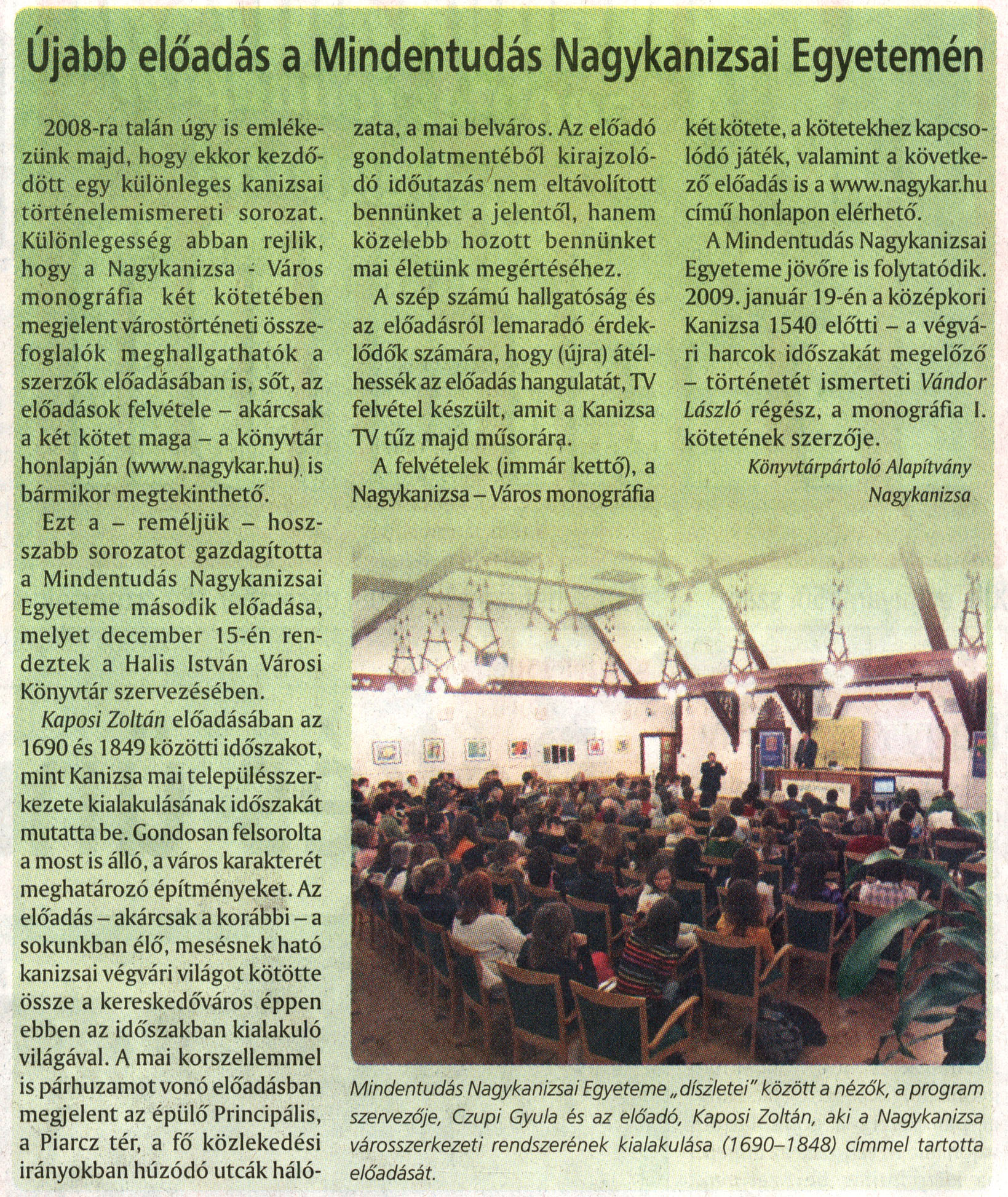 Nyilvános 2278 | 4101 | Nagykanizsai Maraton 2008. december 18. 50. szám 2. oldal | Újabb előadás a Mindentudás Nagykanizsai Egyetemén A cikk szövege: Újabb előadás a Mindentudás Nagykanizsai Egyetemén 2008-ra talán úgy is emlékezünk majd, hogy ekkor kezdődött egy különleges kanizsai történelemismereti sorozat. Különlegesség abban rejlik, hogy a Nagykanizsa - Város monográfia két kötetében megjelent várostörténeti összefoglalók meghallgathatók a szerzők előadásában is, sőt, az előadások felvétele - akárcsak a két kötet maga - a könyvtár honlapján (www.nagykar.hu). is bármikor megtekinthető. Ezt a - reméljük - hosszabb sorozatot gazdagította a Mindentudás Nagykanizsai Egyeteme második előadása, melyet december 15-én rendeztek a Halis István Városi Könyvtár szervezésében. Kaposi Zoltán előadásában az 1690 és 1849 közötti időszakot, mint Kanizsa mai településszerkezete kialakulásának időszakát mutatta be. Gondosan felsorolta a most is álló, a város karakterét meghatározó építményeket. Az előadás - akárcsak a korábbi - a sokunkban élő, mesésnek ható kanizsai végvári világot kötötte össze a kereskedőváros éppen ebben az időszakban kialakuló világával. A mai korszellemmel is párhuzamot vonó előadásban megjelent az épülő Principális, a Piarcz tér, a fő közlekedési irányokban húzódó utcák hálózata, a mai belváros. Az előadó gondolatmentéből kirajzolódó időutazás nem eltávolított bennünket a jelentől, hanem közelebb hozott bennünket mai életünk megértéséhez. A szép számú hallgatóság és az előadásról lemaradó érdeklődők számára, hogy (újra) átélhessék az előadás hangulatát, TV felvétel készült, amit a Kanizsa TV tűz majd műsorára. A felvételek (immár kettő), a Nagykanizsa - Város monográfia két kötete, a kötetekhez kapcsolódó játék, valamint a következő előadás is a www.nagykar.hu című honlapon elérhető. A Mindentudás Nagykanizsai Egyeteme jövőre is folytatódik. 2009. január 19-én a középkori Kanizsa 1540 előtti - a végvári harcok időszakát megelőző - történetét ismerteti Vándor László régész, a monográfia I. kötetének szerzője. Könyvtárpártoló Alapítvány Nagykanizsa Mindentudás Nagykanizsai Egyeteme „ díszletei" között a nézők, a program szervezője, Czupi Gyula és az előadó, Kaposi Zoltán, aki a Nagykanizsa városszerkezeti rendszerének kialakulása (1690-1848) címmel tartotta előadását. |