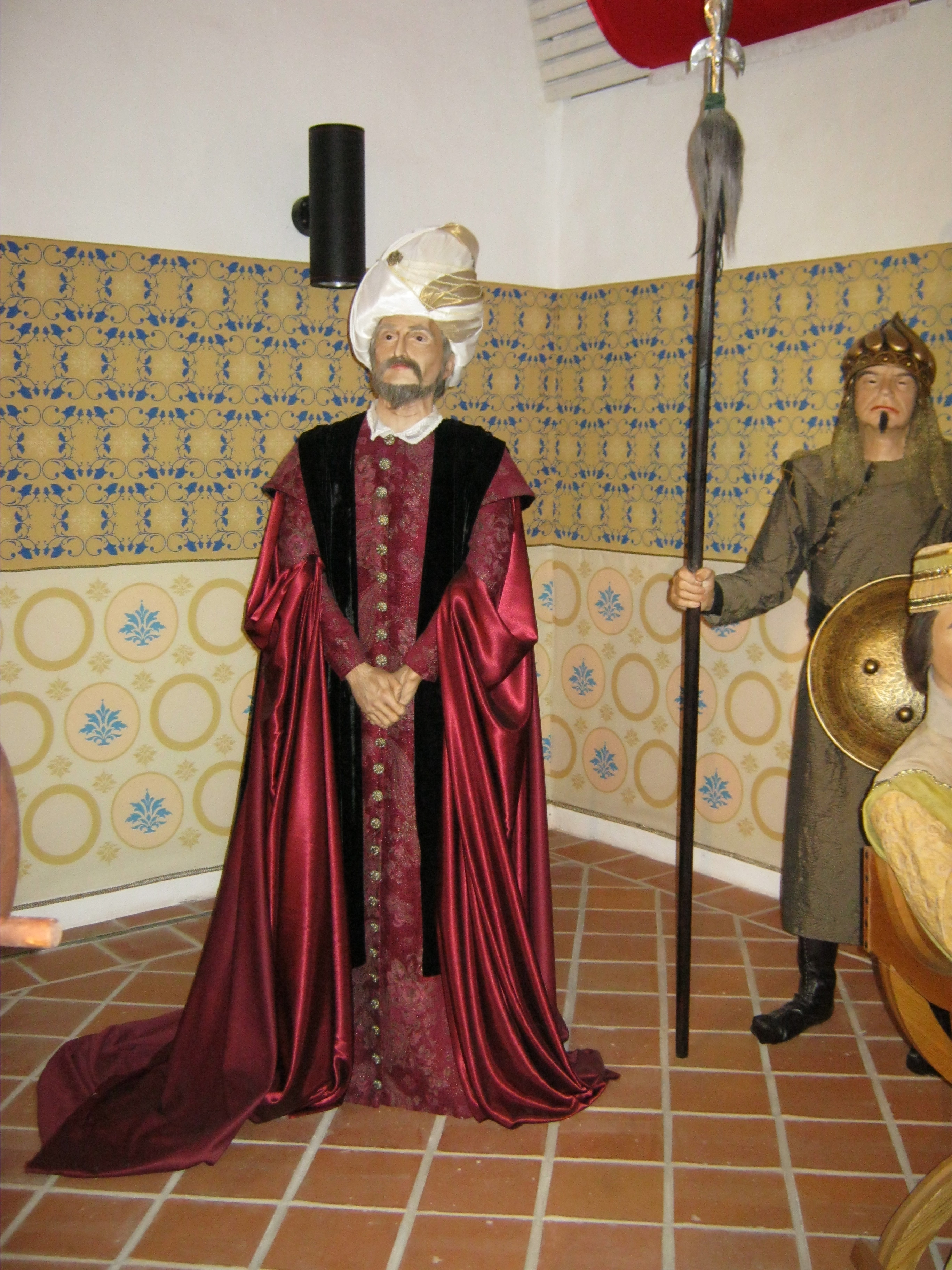 Nyilvános 1043 | 1384 | Nyírbátor, Vár utca 1. Báthori várkastély | A Báthoriak várkastélyának többször átalakított egyetlen megmaradt épületét a közelmúltban állították helyre. Pincéjében reneszánsz étterem látogatható, földszintjén és emeletén a Báthori Panoptikum 45 élethű és korhű viaszfigurában mutatja be érzékletesen a jeles nemesi család és Nyírbátor történetét. A figurák tervezője és készítője Megyeri János szobrászművész. A megtekintést olvasható és hallgatható kalauzolás kíséri. A kiállítást a kenyérmezei csata 530. évfordulóján, 2009.október 13-án adták át. Az 1479-ben a törökkel vívott csata egyik hőse Báthori István volt. A képen Szulejmán szultán viaszfigurája. Felh. irod.: Látnivalók Szabolcs-Szatmár-Bereg megyében. Miskolc, Well-PRess, 1999 www.bathorivarkastely.hu A fénykép 2010 augusztus elején készült. |