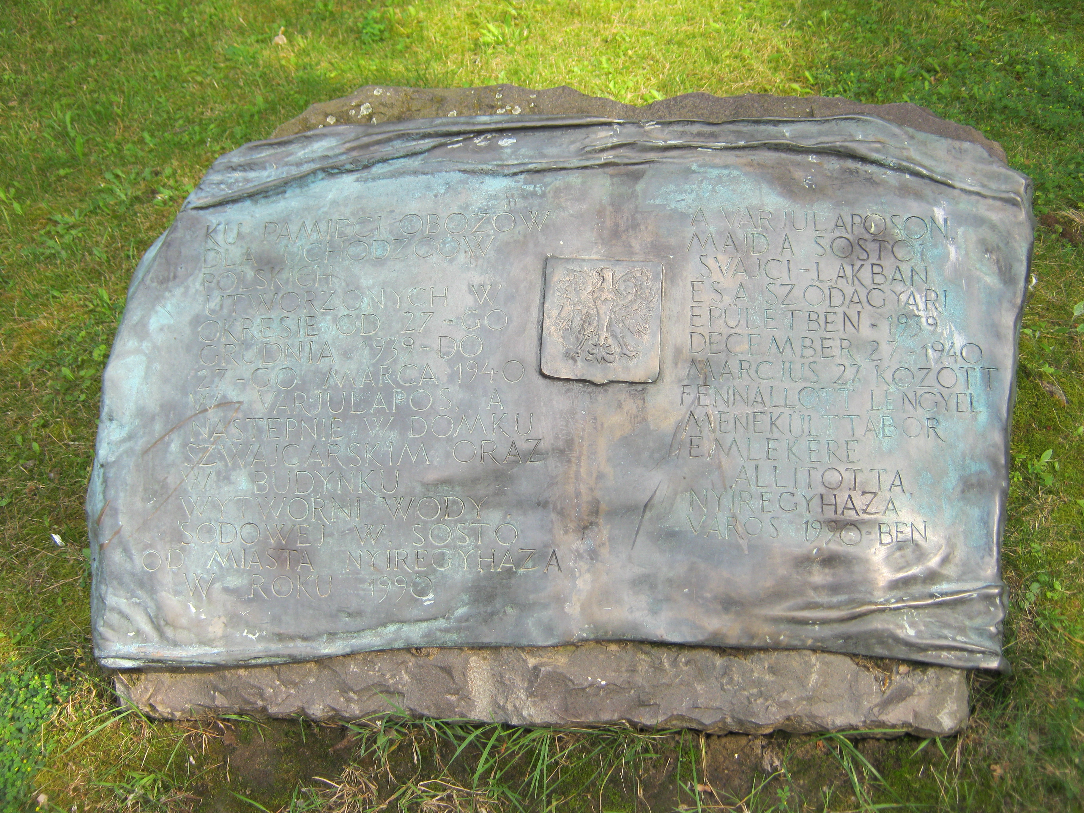 Nyilvános 1030 | 1388 | Nyíregyháza-Sóstó, Svájci lak | A Svájci lak előtt kétnyelvű emlékkő idézi azt az időszakot, amikor a szálloda és a környező épületek 1939/40-ben lengyel menekülttábornak adtak helyet. A fénykép 2010 augusztus elején készült |