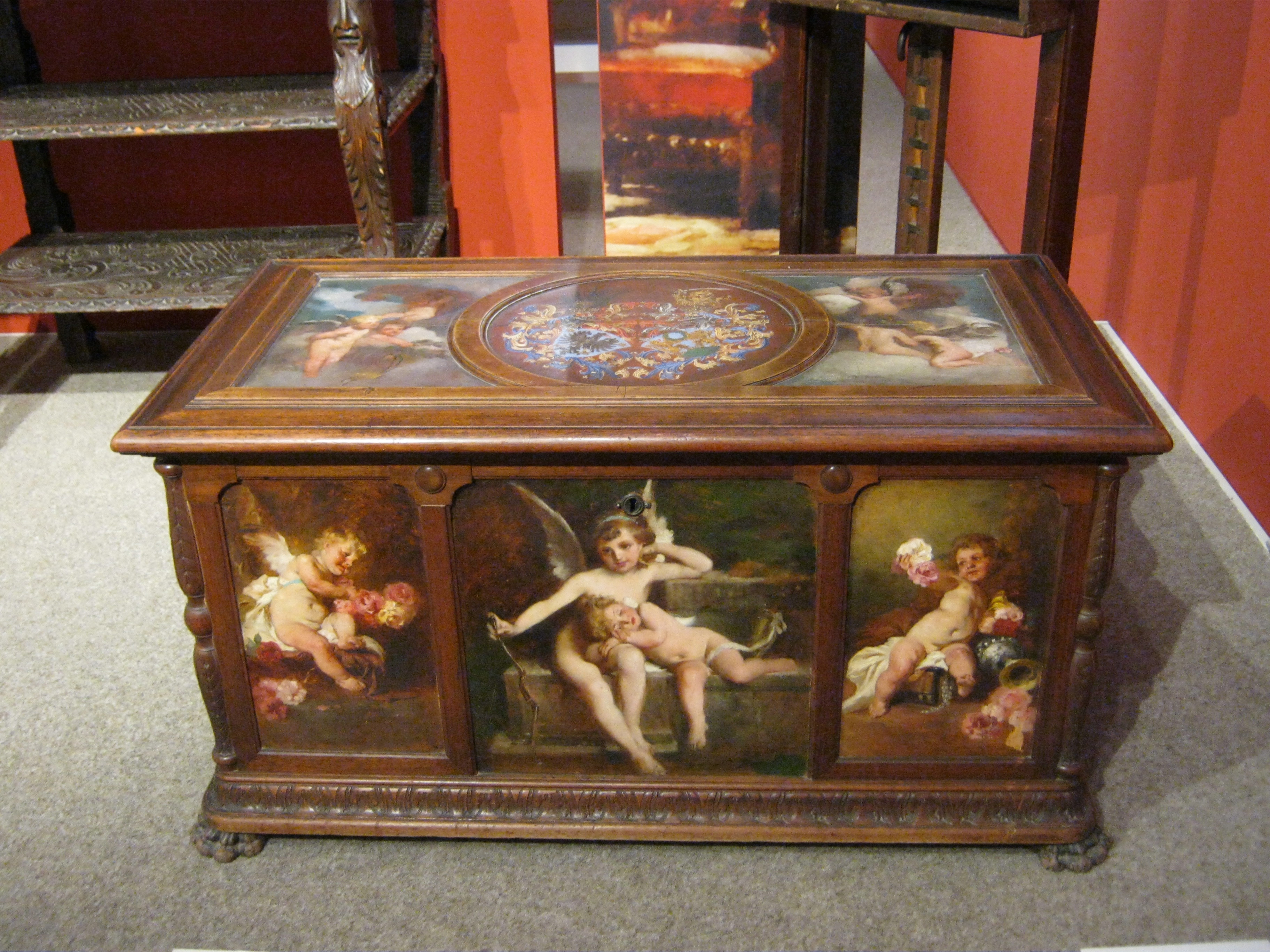 Nyilvános 1058 | 1532 | Nyíregyháza, Benczúr tér 21. Jósa András Múzeum | Magyarország egyik legrégibb múzeumát Dr. Jósa András alapította 1868-ban, akinek ma nevét viseli. A képen Benczúr Gyula emlékszobájának részlete. A nagy magyar festőművész 1844-ben Nyíregyházán született (lásd: Nyíregyháza, Kossuth tér 8.), apja gyógyszerész volt. A Benczúr-emlékszobában alkotásai mellett eredeti bútorok, s a festőművész több használati tárgya is megtekinthető, mint például ez a díszes láda, amelyet ő maga díszített festményekkel. Felh. irod.: Látnivalók Szabolcs-Szatmár-Bereg megyében. Miskolc, Well-PRess, 1999 http://jam.nyirbone.hu A fénykép 2010 augusztus elején készült. |