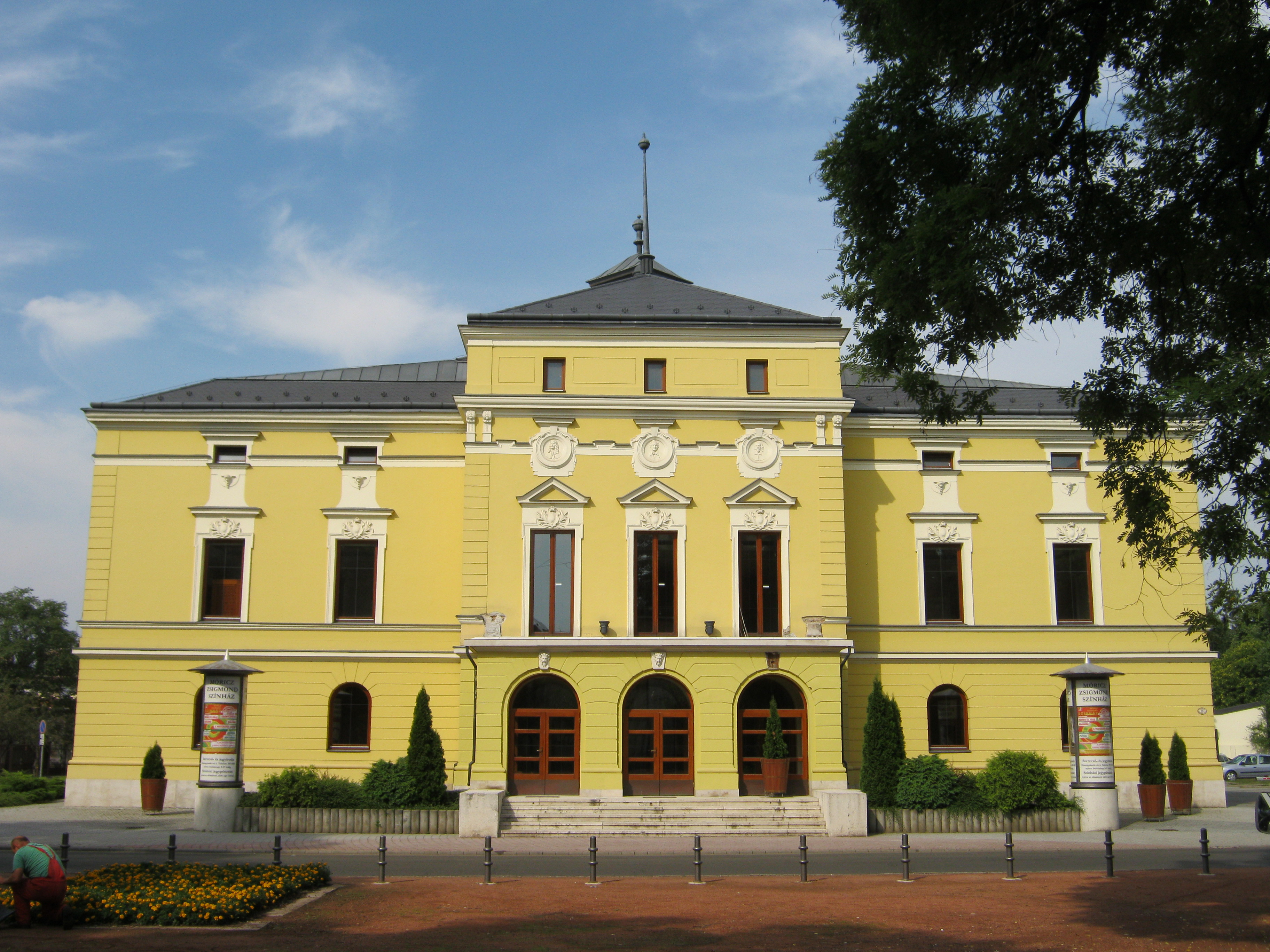 Nyilvános 1052 | 1468 | Nyíregyháza, Bessenyei tér 13. | Nyíregyháza első állandó kőszínháza 1894-ben épült Alpár Ignác tervei szerint eklektikus stílusban. 1955-ben teljesen felújították, csak a színpadi nyílás körüli négy fal maradt meg a régiekből, az épület minden irányban kitágult. Saját társulattal 1981 óta rendelkezik. Felh. irod.: Látnivalók Szabolcs-Szatmár-Bereg megyében. Miskolc. Well-PRess, 1999 www.moriczszinhaz.hu A fénykép 2010 augusztus elején készült. |