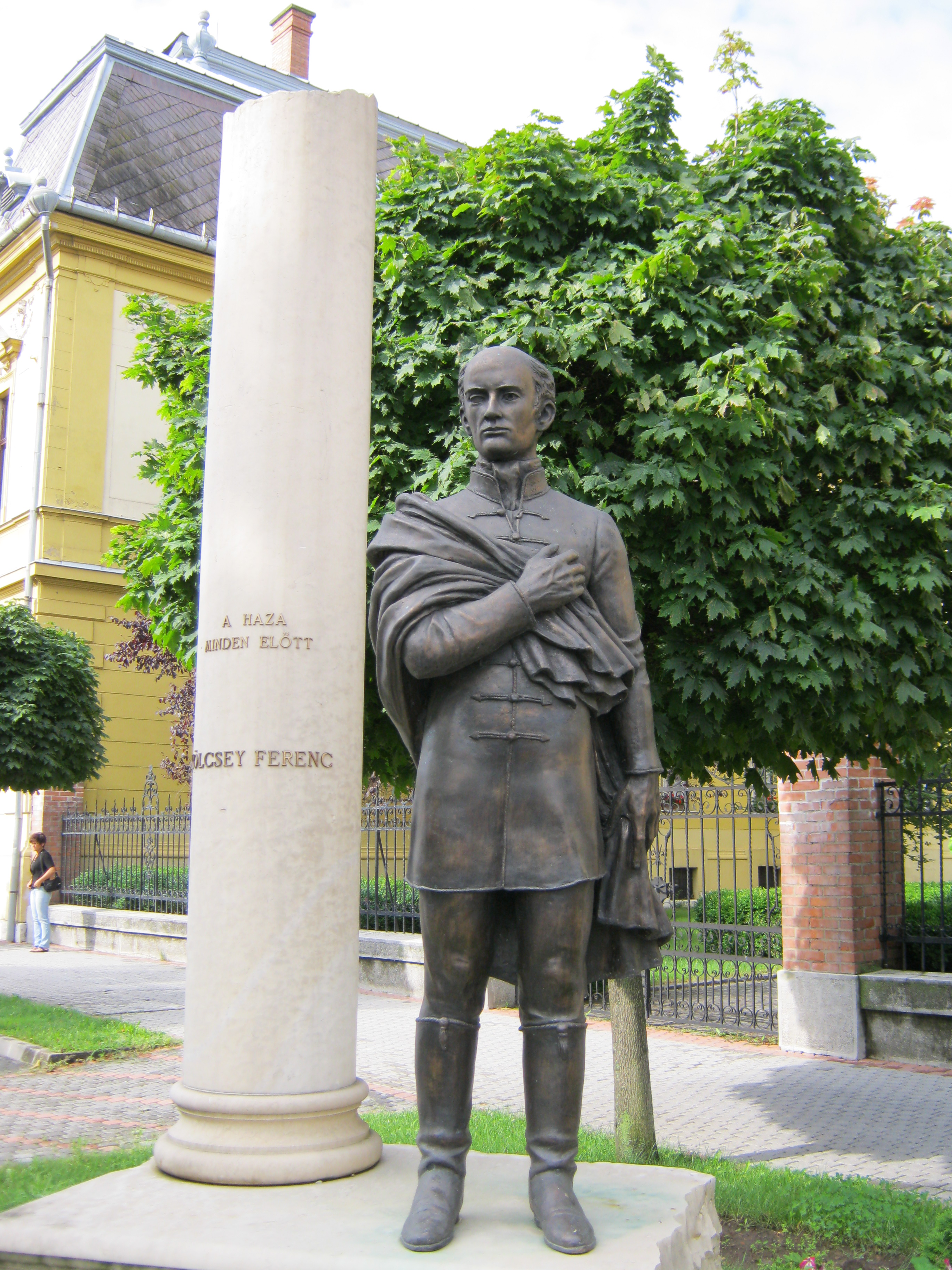 Nyilvános 1090 | 1512 | Nyíregyháza, Hősök tere 5. Megyeháza | Az eklektikus stílusú megyeháza 1891-1892-ben, Alpár Ignác tervei szerint épült. Homlokzatát Szabolcs vezér és az államalapító István király szobrai díszítik. Az épületplasztikák és díszítmények Verán József munkái. Nyíregyháza 1876-ban lett megyeszékhely, korábban Nagykálló töltötte be ezt a szerepet. Az épület előtt 2008-ban állították fel Bíró Lajos Kölcsey Ferencet megjelenítő szoborkompozícióját. A költőt szívre tett kézzel ábrázoló köztéri alkotást a Himnusz születésének 185. és Kölcsey halálának 170. évfordulójára emlékezve emelték. Az oszlop felirata: A haza minden előtt. Kölcsey Szatmár vármegye főjegyzője és országgyűlési követe volt. Szabadelvű politikusként a nemzeti függetlenségért, a polgári és emberi jogokért, a jobbágyfelszabadításért, a nemzeti egységért, a vallási egyenjogúságért és türelemért, a magyar nyelv hivatalossá tételéért dolgozott. Tiltakozásul a vármegye felszólítására, hogy az örökváltság ellen szavazzon, képes volt lemondani politikai karrierjéről. Felh. irod.: Látnivalók Szabolcs-Szatmár-Bereg megyében. Miskolc, Well-PRess, 1999 www.szoborlap.hu A fénykép 2010 augusztus elején készült. |
