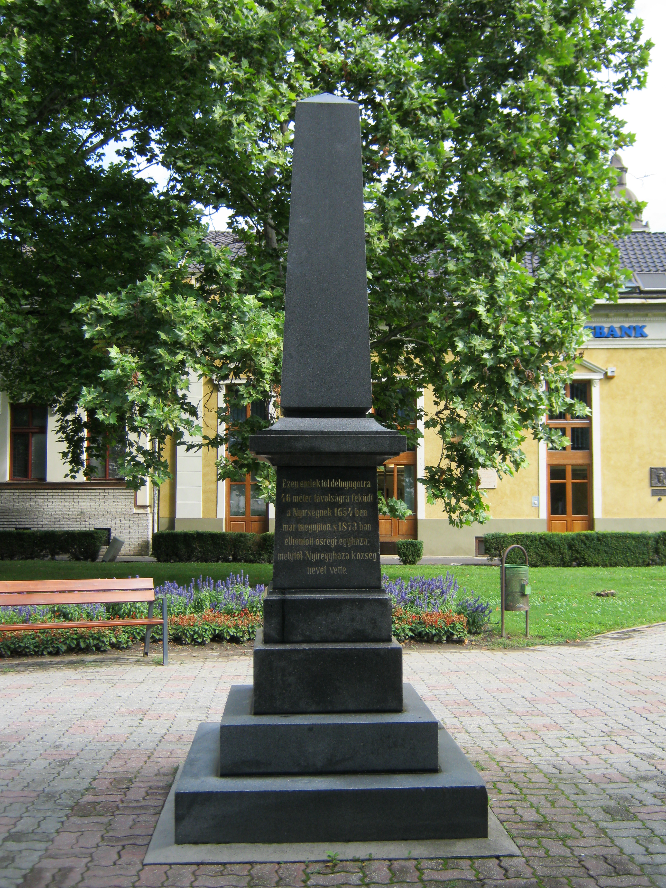 Nyilvános 1025 | 1835 | Nyíregyháza, Kálvin tér: A református templom emlékoszlopa | Nyíregyháza legrégibb történetére a 'honfoglalás ezredéves ünneplése alkalmából' emelt obeliszk emlékeztet a Kálvin téren, a mai református templom közelében. Az oszlop egyik feliratából kiderül, hogy 'ezen emléktől délnyugatra 46 méter távolságra feküdt a Nyírségnek 1654-ben már megújított s 1873-ban elbontott ősrégi egyháza, melytől Nyíregyháza község nevét vette'. Az obeliszket a vármegye díszközgyűlése keretében, 1896. május 11-én Mikecz János alispán ünnepi beszédét követően leplezték le, majd a város nevében Bencs László polgármester vette át. A harmadik feliratot a honfoglalás 1100. évfordulóján a város elöljárói vésették az obeliszkre. Felh. irod.: www.beszelamarvany.lapunk.hu A felvétel 2010 augusztus elején készült |