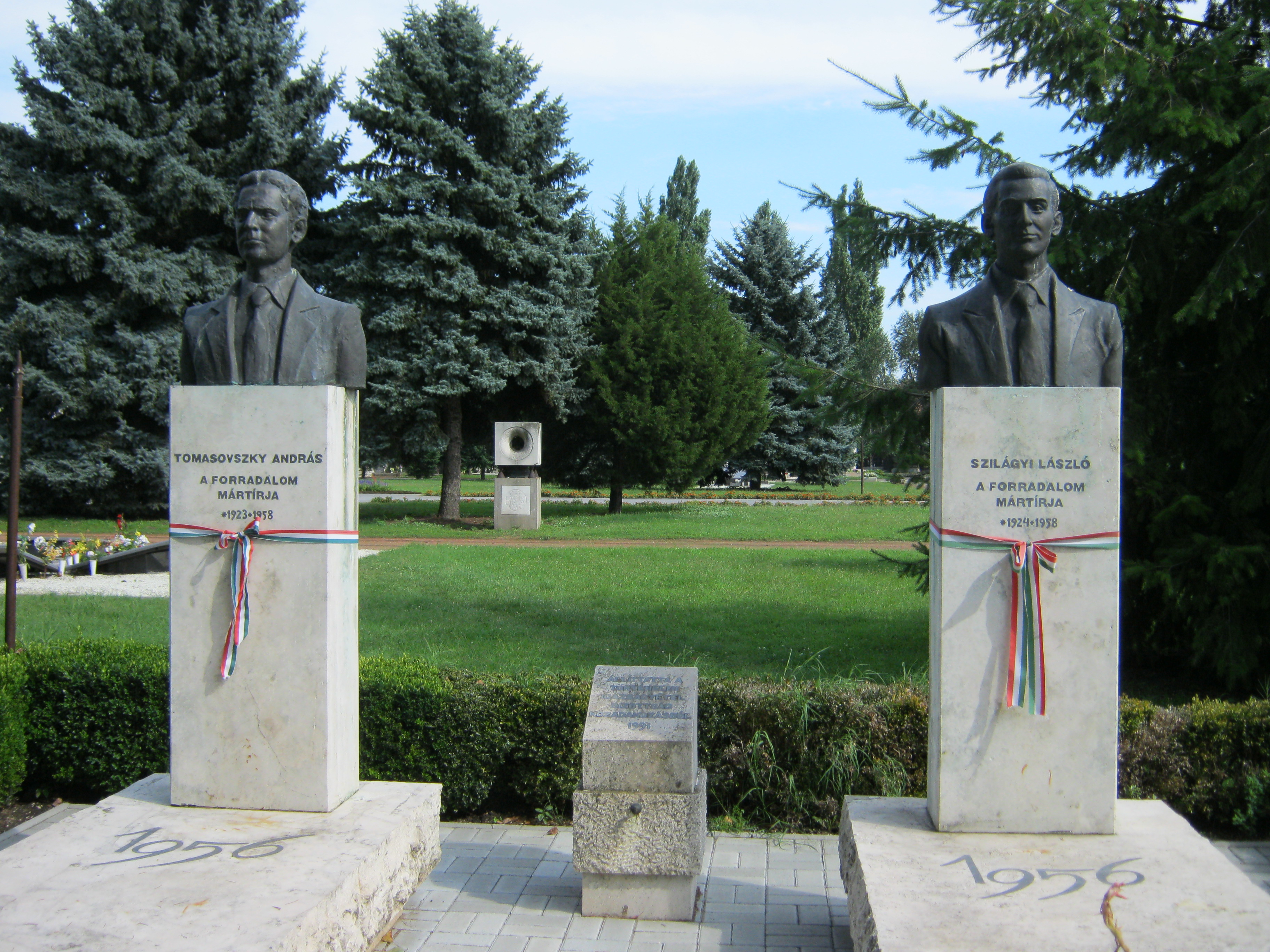 Nyilvános 1141 | 2828 | Nyíregyháza, Pazonyi tér, Északi temető: Tomasovszky András és Szilágyi László | A Dózsa György út vezet Nyíregyháza Északi temetőjébe. Központi részén temették újra az 1956-os forradalom két mártírját, Tomasovszky Andrást és Szilágyi Lászlót. Tomasovszky András (Alma-Ata, 1923. 12. 22. - Nyíregyháza, 1958. 05. 06.) 1956-ban villanyszerelőként dolgozott. Október 26-án az Irodaház tetején a levert vörös csillag helyére kitűzte a nemzeti lobogót, majd egy másik zászlóval a Kossuth Gimnáziumba induló tömeg élére állt. Jelen volt a szovjet hősi emlékmű, Malinovszkij lovasszobrának a ledöntésénél is. A szobor talapzatán fölolvasta a miskolci forradalmárok ötpontos követelését, melyet aztán tízezer példányban kinyomtattak. Az ennek alapján Szilágyi László által megfogalmazott táviratot ő adta föl Nagy Imrének. Délután jelen volt a munkástanács megválasztásánál. Szilágyi László őt bízta meg a hírszerző csoport vezetésével. A határmenti községekkel állandó telefonos összeköttetést tartott, így tájékoztatta a szovjet csapatmozgásokról a forradalmi szerveket. 1957-ben a nyíregyházi járásbíróság fegyverrejtegetés vádjával három hónap börtönbüntetésre ítélte. Két testvére, a szovjet hadsereg tisztjei, hiába jártak közben az érdekében. 1957. áprilisában újra letartóztatták. A Debreceni Katonai Bíróság tanácsa szervezkedés kezdeményezése vádjával 1957. decemberében első fokon halálra ítélte, majd az ítéletet 1958 április végén jogerőre emelték. Május 6-án Nyíregyházán végezték ki Szilágyi Lászlóval együtt. Szilágyi László (Gégény, 1924. 11. 20. - Nyíregyháza, 1958. 05. 06.) 1956-ban vállalati tervelőadóként dolgozott Nyíregyházán. Október 26-án választották meg a Munkástanács elnökének, majd 29-én a Megyei Munkástanács elnökének. Szervezőkészségének, higgadt magatartásának volt nagyrészt köszönhető, hogy a megyében sikerült megőrizni a nyugalmat, hogy nem folyt vér. Ezt 1956 novemberében szovjet letartóztatói is elismerték, s elengedték. A magyar hatóságok 1957. február 21-én tartóztatták le. Ekkortól kezdve sorsa egybefonódott Tomasovszky Andráséval, egyazon tárgyaláson ítélték őket halálra első, majd másodfokon, s egyszerre végezték ki őket a nyíregyházai börtön udvarán. A mártírokat eredetileg e temető 28-as parcellájában jeltelen sírba helyezték. Mai síremléküket Tóth Sándor készítette 1991-ben. Felh. irod.: http://beszelamarvany.lapunk.hu/?modul=oldal&tartalom=1034286 A fénykép 2010 augusztus elején készült |