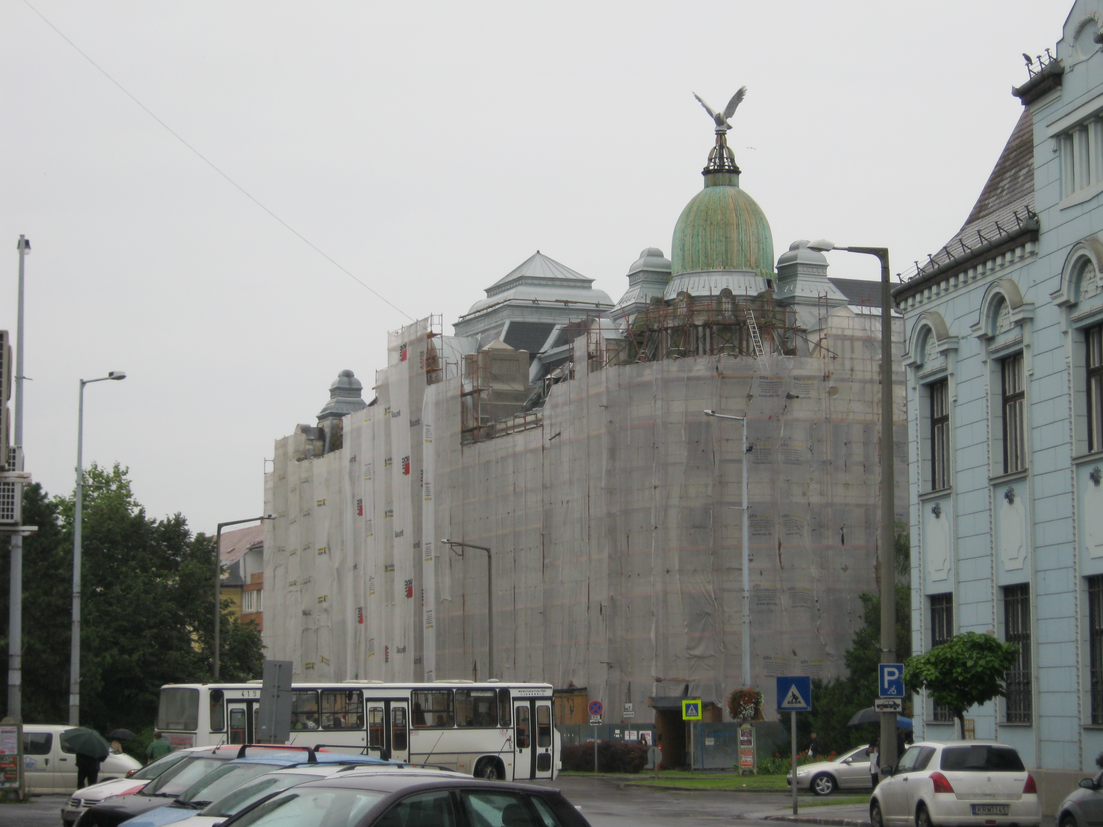 Nyilvános 1056 | 1528 | Nyíregyháza, Széchenyi utca 1. Nyírvíz-palota | Az Országzászló tér nyugati oldalán indul a város egykori főútvonala, a Széchenyi utca. Itt van a bejárata a hatalmas tömböt elfoglaló Nyírvíz-palotának, amely 1913-ban épült a Nyírvíz-szabályozó Társulat székházának Papp Gyula és Szabolcs Ferenc tervei alapján. A városban mind építészetileg, mind városképileg meghatározó épület szecessziós és eklektikus jegyeket visel magán. A lépcsőház díszes ablakai (87 négyzetméter), a lift és a függőfolyosó lengő ajtajainak maratott üvegei (43 négyzetméter), valamint a homlokzat gyönyörű díszei Róth Miksa műhelyében (lásd: Budapest, 07. Nefelejcs u. 26.) készültek. Eredetileg a földszinten üzletek, szolgálati lakások, az emeleteken bérlakások, hivatal helyiségek nyertek elhelyzést. Személy- és teherfelvonóval, házi vízvezetékrendszerrel és központi fűtéssel rendelkezett. Két kapubejárata lett a Széchenyi utca és az Országzászló tér felől nyílik, amelyek ikerlépcsőházban találkoznak. Kupoláján rétisas látható, amely az eltűnt eredeti másolata. (Ottjártamkor felállványozva találtam, de mivel fontos épület, ebben az állapotában is lefényképeztem. KK.) Felh. irod.: www.nyirviz.hu A fénykép 2010 augusztus elején készült |
