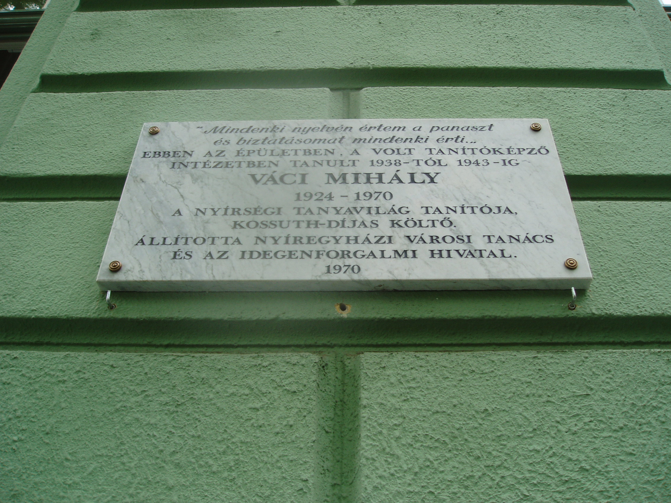 Nyilvános 1023 | 1399 | Nyíregyháza, Széchenyi utca 6. Kölcsey Ferenc Gimnázium | Épületét 1901-ben, Barzó Mihály tervei alapján, pénzügyigazgatósági székháznak emelték. 1925-től, 1957-ben történt megszűnéséig középfokú tanítóképző intézetként működött. Azóta a Kölcsey gimnázium otthona. Az első gimnáziumi osztály 1954/55-ben még egy korábbi épületben kezdte meg a tanulást, de már itt érettségizett 1959-ben. Az iskolaépület homlokzatán több emléktábla idézi az egykori tanítóképző, majd gimnázium neves tanárainak és diákjainak alakját. Váci Mihály (1924-1971) költő 1938 és 1943 között volt ebben az épületben a tanítóképző intézet diákja. Felh. irod.: www.kolcsey-nyh.sulinet.hu A fénykép 2010 augusztus elején készült |