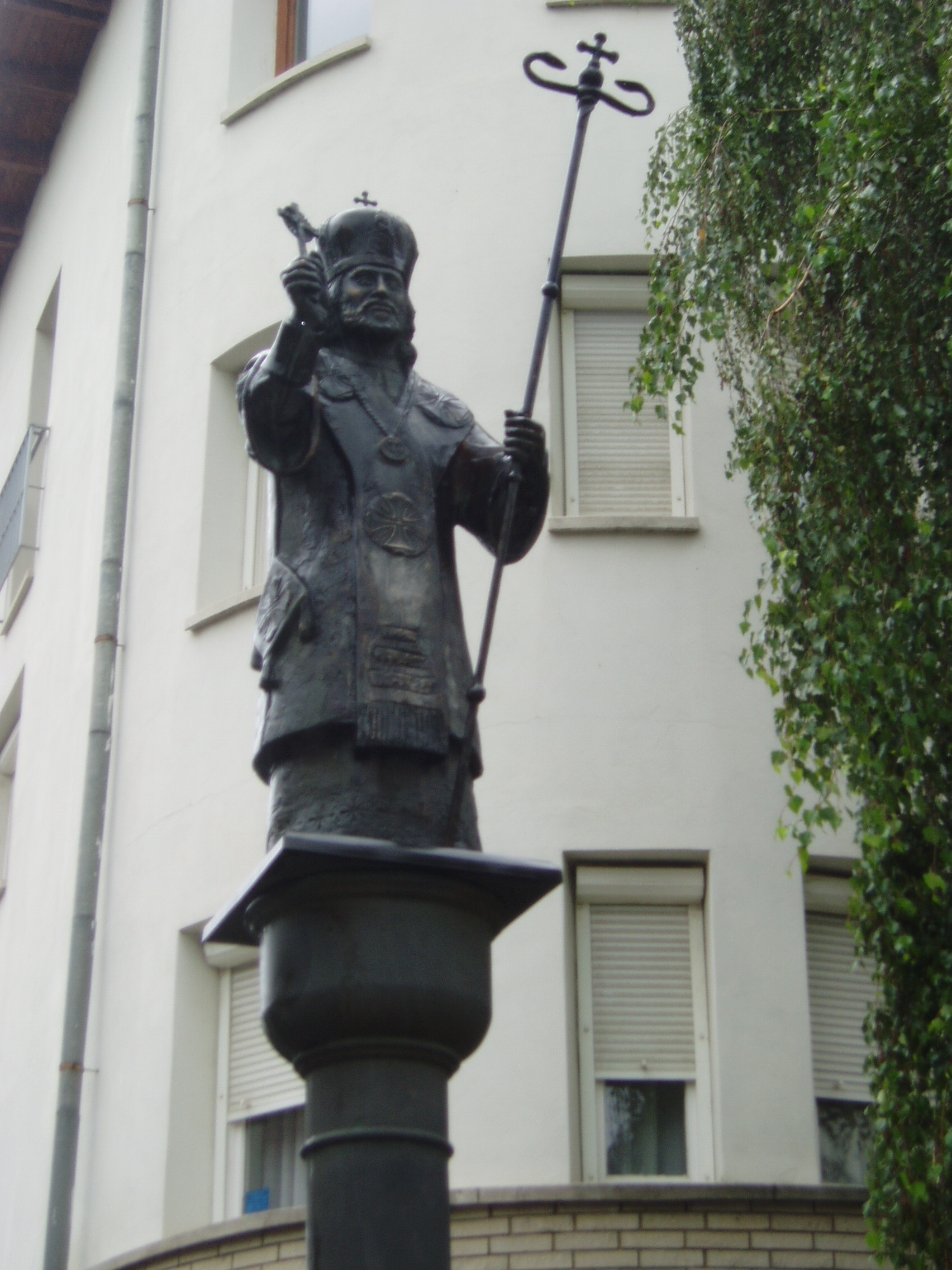 Nyilvános 1091 | 2191 | Nyíregyháza, Szent Miklós tér: Szent Miklós szobra | A város központjában levő, de csöndes és hangulatos kis téren 1996-ban állították fel a kiváló nyíregyházi szobrászművész, Tóth Sándor Szent Miklóst megjelenítő szobrát. A fénykép 2010 augusztus elején készült |