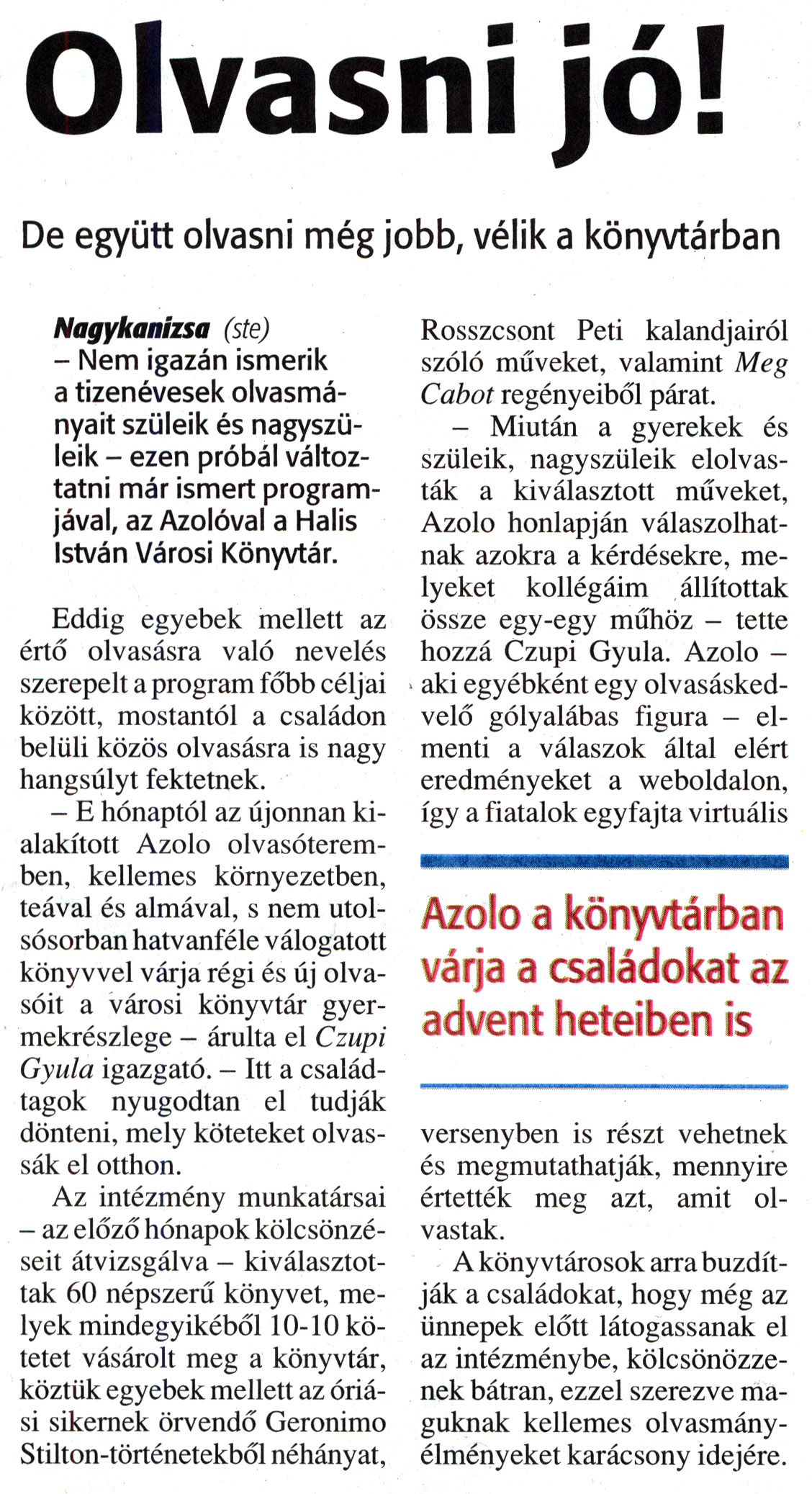 Nyilvános 1740 | 4457 | Zalai Hírlap 2012. december 6. 285. szám 11. oldal - Olvasni jó | Olvasni jó! De együtt olvasni még jobb, vélik a könyvtárban Azolo a könyvtárban várja a családokat az advent heteiben is Nagykanizsa (ste) - Nem igazán ismerik a tizenévesek olvasmányait szüleik és nagyszüleik - ezen próbál változtatni már ismert programjával, az Azolóval a Halis István Városi Könyvtár. Eddig egyebek mellett az értő olvasásra való nevelés szerepelt a program főbb céljai között, mostantól a családon belüli közös olvasásra is nagy hangsúlyt fektetnek. - E hónaptól az újonnan kialakított Azolo olvasóteremben, kellemes környezetben, teával és almával, s nem utolsósorban hatvanféle válogatott könyvvel várja régi és új olvasóit a városi könyvtár gyermekrészlege - árulta el Czupi Gyula igazgató. - Itt a családtagok nyugodtan el tudják dönteni, mely köteteket olvassák el otthon. Az intézmény munkatársai - az előző hónapok kölcsönzéseit átvizsgálva - kiválasztottak 60 népszerű könyvet, melyek mindegyikéből 10-10 kötetet vásárolt meg a könyvtár, köztük egyebek mellett az óriási sikernek örvendő Geronimo Stilton-történetekből néhányat, Rosszcsont Peti kalandjairól szóló műveket, valamint Meg Cabot regényeiből párat. - Miután a gyerekek és szüleik, nagyszüleik elolvasták a kiválasztott műveket, Azolo honlapján válaszolhatnak azokra a kérdésekre, melyeket kollégáim állítottak össze egy-egy műhöz - tette hozzá Czupi Gyula. Azolo -aki egyébként egy olvasáskedvelő gólyalábas figura - elmenti a válaszok által elért eredményeket a weboldalon, így a fiatalok egyfajta virtuális versenyben is részt vehetnek és megmutathatják, mennyire értették meg azt, amit olvastak. A könyvtárosok arra buzdítják a családokat, hogy még az ünnepek előtt látogassanak el az intézménybe, kölcsönözzenek bátran, ezzel szerezve maguknak kellemes olvasmányélményeket karácsony idejére. |