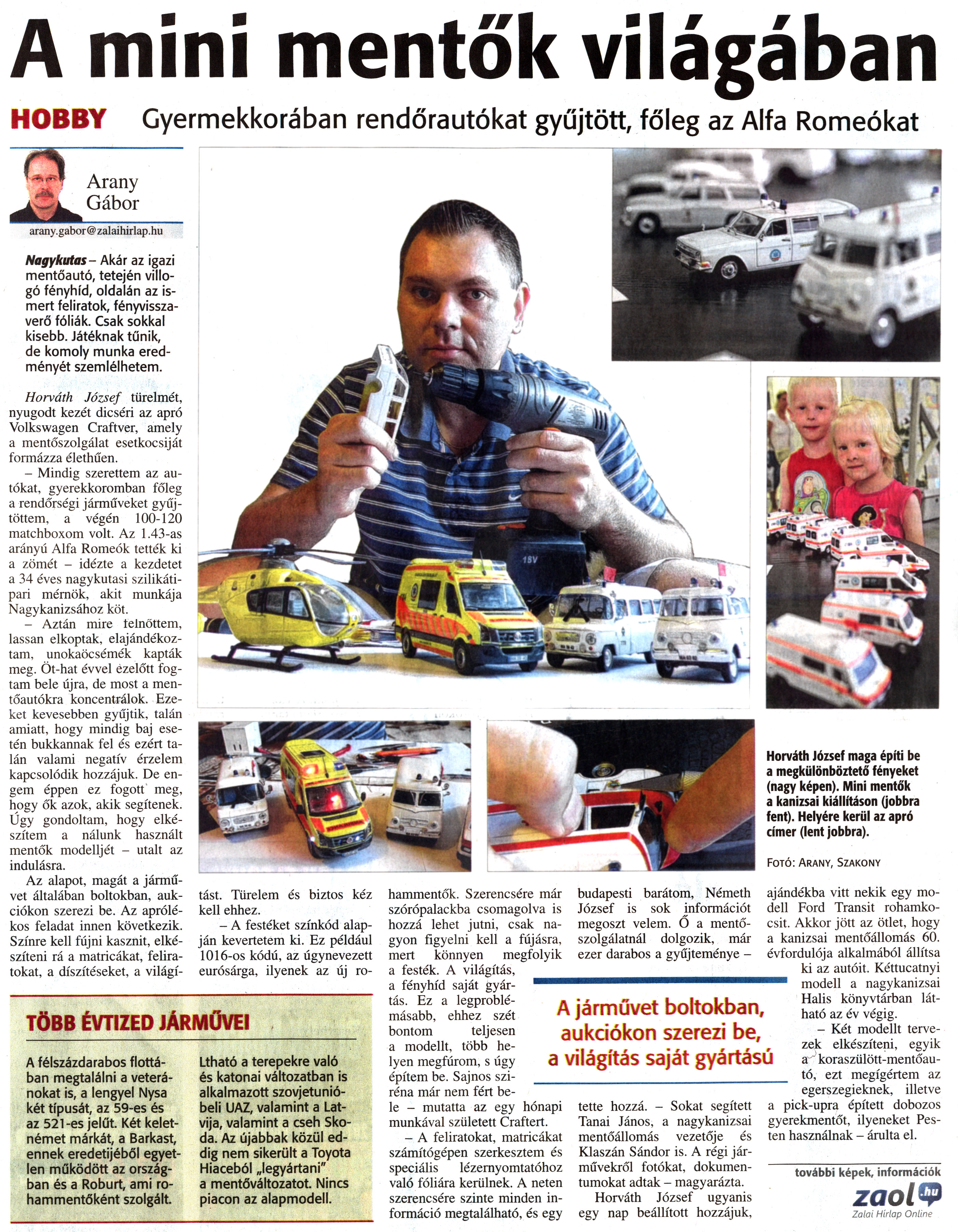Nyilvános 1762 | 4650 | Zalai Hírlap 2013. július 19. 167. szám 8. oldal - A mini mentők világában | A cikk internetes változata a következő link alatt tekinthető meg: http://zaol.hu/loero/a-mini-mentok-vilagaban-1553058 A mini mentők világában HOBBY Gyermekkorában rendőrautókat gyűjtött, főleg az Alfa Romeókat Nagykutas- Akár az igazi mentőautó, tetején villogó fényhíd, oldalán az ismert feliratok, fényvisszaverő fóliák. Csak sokkal kisebb. Játéknak tűnik, de komoly munka eredményét szemlélhetem. Horváth József türelmét, nyugodt kezét dicséri az apró Volkswagen Craftver, amely a mentőszolgálat esetkocsiját formázza élethűen. - Mindig szerettem az autókat, gyerekkoromban főleg a rendőrségi járműveket gyűjtöttem, a végén 100-120 matchboxom volt. Az 1.43-as arányú Alfa Romeók tették ki a zömét - idézte a kezdetet a 34 éves nagykutasi szilikátipari mérnök, akit munkája Nagykanizsához köt. - Aztán mire felnőttem, lassan elkoptak, elajándékoztam, unokaöcsémék kapták meg. Öt-hat évvel ezelőtt fogtam bele újra, de most a mentőautókra koncentrálok. Ezeket kevesebben gyűjtik, talán amiatt, hogy mindig baj esetén bukkannak fel és ezért talán valami negatív érzelem kapcsolódik hozzájuk. De engem éppen ez fogott meg, hogy ők azok, akik segítenek. Úgy gondoltam, hogy elkészítem a nálunk használt mentők modelljét - utalt az indulásra. Az alapot, magát a járművet általában boltokban, aukciókon szerezi be. Az aprólékos feladat innen következik. Színre kell fújni kasznit, elkészíteni rá a matricákat, feliratokat, a díszítéseket, a világítást. Türelem és biztos kéz kell ehhez. - A festéket színkód alapján kevertetem ki. Ez például 1016-os kódú, az úgynevezett eurósárga, ilyenek az új rohammentők. Szerencsére már szórópalackba csomagolva is hozzá lehet jutni, csak nagyon figyelni kell a fújásra, mert könnyen megfolyik a festék. A világítás, a fényhíd saját gyártás. Ez a legproblémásabb, ehhez szét bontom teljesen a modellt, több helyen megfúrom, s úgy építem be. Sajnos sziréna már nem fért bele - mutatta az egy hónapi munkával született Craftert. - A feliratokat, matricákat számítógépen szerkesztem és speciális lézernyomtatóhoz való fóliára kerülnek. A neten szerencsére szinte minden információ megtalálható, és egy budapesti barátom, Németh József is sok információt megoszt velem. Ő a mentőszolgálatnál dolgozik, már ezer darabos a gyűjteménye - tette hozzá. - Sokat segített Tanai János, a nagykanizsai mentőállomás vezetője és Klaszán Sándor is. A régi járművekről fotókat, dokumentumokat adtak - magyarázta. Horváth József ugyanis egy nap beállított hozzájuk, ajándékba vitt nekik egy modell Ford Transit rohamkocsit. Akkor jött az ötlet, hogy a kanizsai mentőállomás 60. évfordulója alkalmából állítsa ki az autóit. Kéttucatnyi modell a nagykanizsai Halis könyvtárban látható az év végig. - Két modellt tervezek elkészíteni, egyik a koraszülött-mentőautó, ezt megígértem az egerszegieknek, illetve a pickupra épített dobozos gyerekmentőt, ilyeneket Pesten használnak - árulta el. Arany Gábor arany.gabor@zalaihirlap.hu TÖBB ÉVTIZED JÁRMŰVEI A félszázdarabos flottában megtalálni a veteránokat is, a lengyel Nysa két típusát, az 59-es és az 521-es jelűt. Két keletnémet márkát, a Barkast, ennek eredetijéből egyetlen működött az országban és a Roburt, ami rohammentőként szolgált. Látható a terepekre való és katonai változatban is alkalmazott szovjetunióbeli UAZ, valamint a Lat-vija, valamint a cseh Skoda. Az újabbak közül eddig nem sikerült a Toyota Hiaceból „legyártani" a mentőváltozatot. Nincs piacon az alapmodell. Fotó: Arany, Szakony A járművet boltokban, aukciókon szerezi be, a világítás saját gyártású további képek, információk zaol.hu Zalai Hírlap Online Horváth József maga építi be a megkülönböztető fényeket (nagy képen). Mini mentők a kanizsai kiállításon (jobbra fent). Helyére kerül az apró címer (lent jobbra). |