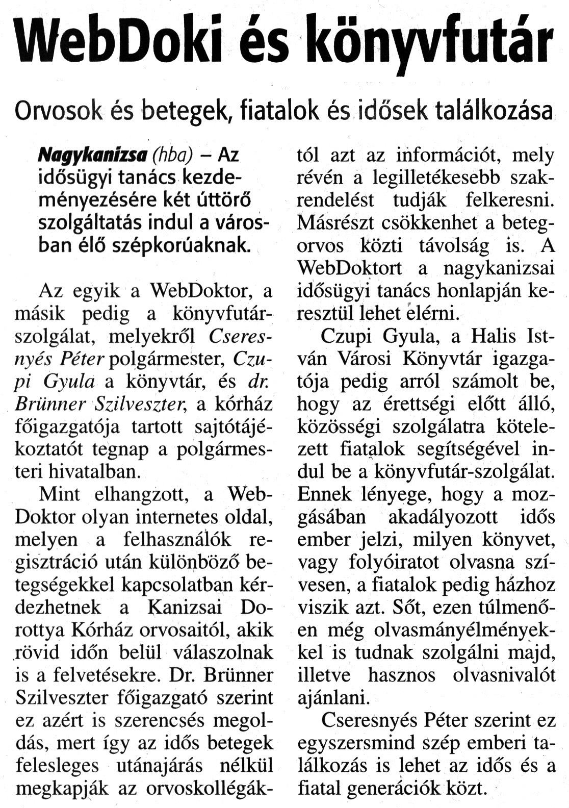 Nyilvános 1848 | 4565 | Zalai Hírlap 2014. április 19 92. szám 3. oldal - WebDoki és könyvfutár | WebDoki és könyvfutár Orvosok és betegek, fiatalok és idősek találkozása Nagykanizsa (hba) - Az idősügyi tanács kezdeményezésére két úttörő szolgáltatás indul a városban élő szépkorúaknak. Az egyik a WebDoktor, a másik pedig a könyvfutárszolgálat, melyekről Cseresnyés Péter polgármester, Czupi Gyula a könyvtár, és dr. Brünner Szilveszter, a kórház főigazgatója tartott sajtótájékoztatót tegnap a polgármesteri hivatalban. Mint elhangzott, a WebDoktor olyan internetes oldal, melyen a felhasználók regisztráció után különböző betegségekkel kapcsolatban kérdezhetnek a Kanizsai Dorottya Kórház orvosaitól, akik rövid időn belül válaszolnak is a felvetésekre. Dr. Brünner Szilveszter főigazgató szerint ez azért is szerencsés megoldás, mert így az idős betegek felesleges utánajárás nélkül megkapják az orvoskollégáktól azt az információt, mely révén a legilletékesebb szakrendelést tudják felkeresni. Másrészt csökkenhet a betegorvos közti távolság is. A WebDoktort a nagykanizsai idősügyi tanács honlapján keresztül lehet elérni. Czupi Gyula, a Halis István Városi Könyvtár igazgatója pedig arról számolt be, hogy az érettségi előtt álló, közösségi szolgálatra kötelezett fiatalok segítségével indul be a könyvfutár-szolgálat. Ennek lényege, hogy a mozgásában akadályozott idős ember jelzi, milyen könyvet, vagy folyóiratot olvasna szívesen, a fiatalok pedig házhoz viszik azt. Sőt, ezen túlmenően még olvasmányélményekkel is tudnak szolgálni majd, illetve hasznos olvasnivalót ajánlani. Cseresnyés Péter szerint ez egyszersmind szép emberi találkozás is lehet az idős és a fiatal generációk közt. |