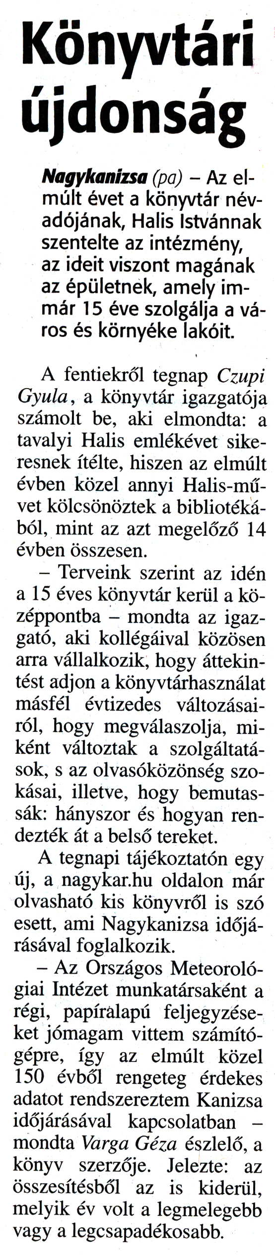 Nyilvános 1750 | 3600 | Zalai Hírlap 2016. január 6. 4. szám 3. oldal - Könyvtári újdonság | Könyvtári újdonság Nagykanizsa (pa) - Az elmúlt évet a könyvtár névadójának, Halis Istvánnak szentelte az intézmény, az ideit viszont magának az épületnek, amely immár 15 éve szolgálja a város és környéke lakóit. A fentiekről tegnap Czupi Gyula, a könyvtár igazgatója számolt be, aki elmondta: a tavalyi Halis emlékévet sikeresnek ítélte, hiszen az elmúlt évben közel annyi Halis-művet kölcsönöztek a bibliotékából, mint az azt megelőző 14 évben összesen. - Terveink szerint az idén a 15 éves könyvtár kerül a középpontba - mondta az igazgató, aki kollégáival közösen arra vállalkozik, hogy áttekintést adjon a könyvtárhasználat másfél évtizedes változásairól, hogy megválaszolja, miként változtak a szolgáltatások, s az olvasóközönség szokásai, illetve, hogy bemutassák: hányszor és hogyan rendezték át a belső tereket. A tegnapi tájékoztatón egy új, a nagykar.hu oldalon már olvasható kis könyvről is szó esett, ami Nagykanizsa időjárásával foglalkozik. - Az Országos Meteorológiai Intézet munkatársaként a régi, papíralapú feljegyzéseket jómagam vittem számítógépre, így az elmúlt közel 150 évből rengeteg érdekes adatot rendszereztem Kanizsa időjárásával kapcsolatban - mondta Varga Géza észlelő, a könyv szerzője. Jelezte: az összesítésből az is kiderül, melyik év volt a legmelegebb vagy a legcsapadékosabb. |