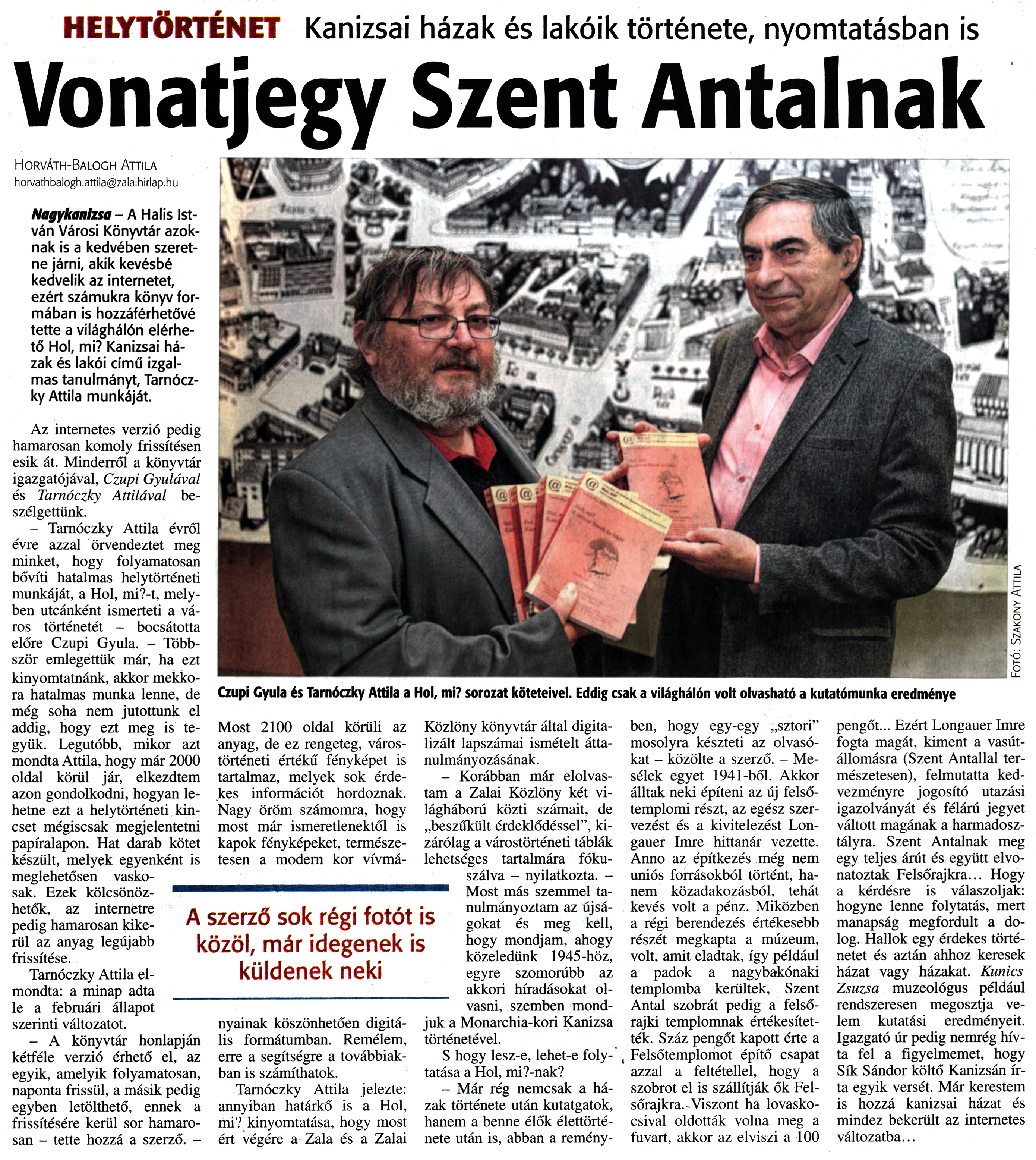 Nyilvános 1804 | 3995 | Zalai Hírlap 2016. február 26. 48. szám 5. oldal | HELYTÖRTÉNET Kanizsai házak és lakóik története, nyomtatásban is Vonatjegy Szent Antalnak Horváth-Balogh Attila horvathbalogh.attila@zalaihirlap.hu Nagykanizsa - A Halis István Városi Könyvtár azoknak is a kedvében szeretne járni, akik kevésbé kedvelik az internetet, ezért számukra könyv formában is hozzáférhetővé tette a világhálón elérhető Hol, mi? Kanizsai házak és lakói című izgalmas tanulmányt, Tarnóczky Attila munkáját. Az internetes verzió pedig hamarosan komoly frissítésen esik át. Minderről a könyvtár igazgatójával, Czupi Gyulával és Tarnóczky Attilával beszélgettünk. - Tarnóczky Attila évről évre azzal örvendeztet meg minket, hogy folyamatosan bővíti hatalmas helytörténeti munkáját, a Hol, mi?-t, melyben utcánként ismerteti a város történetét - bocsátotta előre Czupi Gyula. - Többször emlegettük már, ha ezt kinyomtatnánk, akkor mekkora hatalmas munka lenne, de még soha nem jutottunk el addig, hogy ezt meg is tegyük. Legutóbb, mikor azt mondta Attila, hogy már 2000 oldal körül jár, elkezdtem azon gondolkodni, hogyan lehetne ezt a helytörténeti kincset mégiscsak megjelentetni papíralapon. Hat darab kötet készült, melyek egyenként is meglehetősen vaskosak. Ezek kölcsönözhetők, az internetre pedig hamarosan kikerül az anyag legújabb frissítése. Tarnóczky Attila elmondta: a minap adta le a februári állapot szerinti változatot. - A könyvtár honlapján kétféle verzió érhető el, az egyik, amelyik folyamatosan, naponta frissül, a másik pedig egyben letölthető, ennek a frissítésére kerül sor hamarosan - tette hozzá a szerző. - Czupi Gyula és Tarnóczky Attila a Hol, mi? sorozat köteteivel. Eddig csak a világhálón volt olvasható a kutatómunka eredménye Most 2100 oldal körüli az anyag, de ez rengeteg, várostörténeti értékű fényképet is tartalmaz, melyek sok érdekes információt hordoznak. Nagy öröm számomra, hogy most már ismeretlenektől is kapok fényképeket, természetesen a modern kor vívmányainak köszönhetően digitális formátumban. Remélem, erre a segítségre a továbbiakban is számíthatok. Tarnóczky Attila jelezte: annyiban határkő is a Hol, mi? kinyomtatása, hogy most ért végére a Zala és a Zalai Közlöny könyvtár által digitalizált lapszámai ismételt áttanulmányozásának. - Korábban már elolvastam a Zalai Közlöny két világháború közti számait, de „beszűkült érdeklődéssel", kizárólag a várostörténeti táblák lehetséges tartalmára fókuszálva - nyilatkozta. -Most más szemmel tanulmányoztam az újságokat és meg kell, hogy mondjam, ahogy közeledünk 1945-höz, egyre szomorúbb az akkori híradásokat olvasni, szemben mondjuk a Monarchia-kori Kanizsa történetével. S hogy lesz-e, lehet-e folytatása a Hol, mi?-nak? - Már rég nemcsak a házak története után kutatgatok, hanem a benne élők élettörténete után is, abban a reményben, hogy egy-egy „sztori" mosolyra készteti az olvasókat - közölte a szerző. - Mesélek egyet 1941-ből. Akkor álltak neki építeni az új felsőtemplomi részt, az egész szervezést és a kivitelezést Longauer Imre hittanár vezette. Anno az építkezés még nem uniós forrásokból történt, hanem közadakozásból, tehát kevés volt a pénz. Miközben a régi berendezés értékesebb részét megkapta a múzeum, volt, amit eladtak, így például a padok a nagybakónaki templomba kerültek, Szent Antal szobrát pedig a felső-rajki templomnak értékesítették. Száz pengőt kapott érte a Felsőtemplomot építő csapat azzal a feltétellel, hogy a szobrot el is szállítják ők Fel-sőrajkra. Viszont ha lovaskocsival oldották volna meg a fuvart, akkor az elviszi a 100 pengőt... Ezért Longauer Imre fogta magát, kiment a vasútállomásra (Szent Antallal természetesen), felmutatta kedvezményre jogosító utazási igazolványát és félárú jegyet váltott magának a harmadosztályra. Szent Antalnak meg egy teljes árút és együtt elvonatoztak Felsőrajkra... Hogy a kérdésre is válaszoljak: hogyne lenne folytatás, mert manapság megfordult a dolog. Hallok egy érdekes történetet és aztán ahhoz keresek házat vagy házakat. Kunics Zsuzsa muzeológus például rendszeresen megosztja velem kutatási eredményeit. Igazgató úr pedig nemrég hívta fel a figyelmemet, hogy Sík Sándor költő Kanizsán írta egyik versét. Már kerestem is hozzá kanizsai házat és mindez bekerült az internetes változatba... |