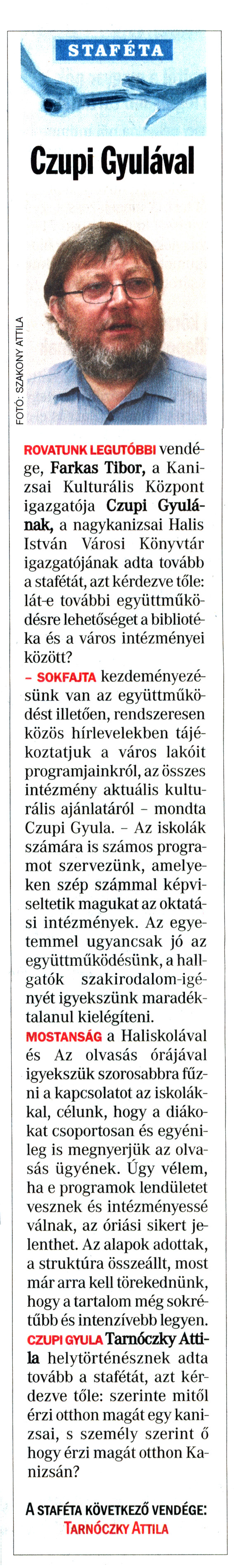 Nyilvános 1524 | 2529 | Vasárnapi Zalai Hírlap 2010. július 11. 28. szám 5. oldal | Czupi Gyulával rovatunk legutóbbi Vendége, Farkas Tibor, a Kanizsai Kulturális Központ igazgatója Czupi Gyulának, a nagykanizsai Halis István Városi Könyvtár igazgatójának adta tovább a stafétát, azt kérdezve tőle: lát-e további együttműködésre lehetőséget a bibliotéka és a város intézményei között? - sokfajta kezdeményezésünk van az együttműködést illetően, rendszeresen közös hírlevelekben tájékoztatjuk a város lakóit programjainkról, az összes intézmény aktuális kulturális ajánlatáról - mondta Czupi Gyula. - Az iskolák számára is számos programot szervezünk, amelyeken szép számmal képviseltetik magukat az oktatási intézmények. Az egyetemmel ugyancsak jó az együttműködésünk, a hallgatók szakirodalom-igényét igyekszünk maradéktalanul kielégíteni. mostanság a Haliskolával és Az olvasás órájával igyekszük szorosabbra fűzni a kapcsolatot az iskolákkal, célunk, hogy a diákokat csoportosan és egyénileg is megnyerjük az olvasás ügyének. Úgy vélem, ha e programok lendületet vesznek és intézményessé válnak, az óriási sikert jelenthet. Az alapok adottak, a struktúra összeállt, most már arra kell törekednünk, hogy a tartalom még sokrétűbb és intenzívebb legyen. czupi gyula Tarnóczky Attila helytörténésznek adta tovább a stafétát, azt kérdezve tőle: szerinte mitől érzi otthon magát egy kanizsai, s személy szerint ő hogy érzi magát otthon Kanizsán? a staféta következő vendége: Tarnóczky Attila |