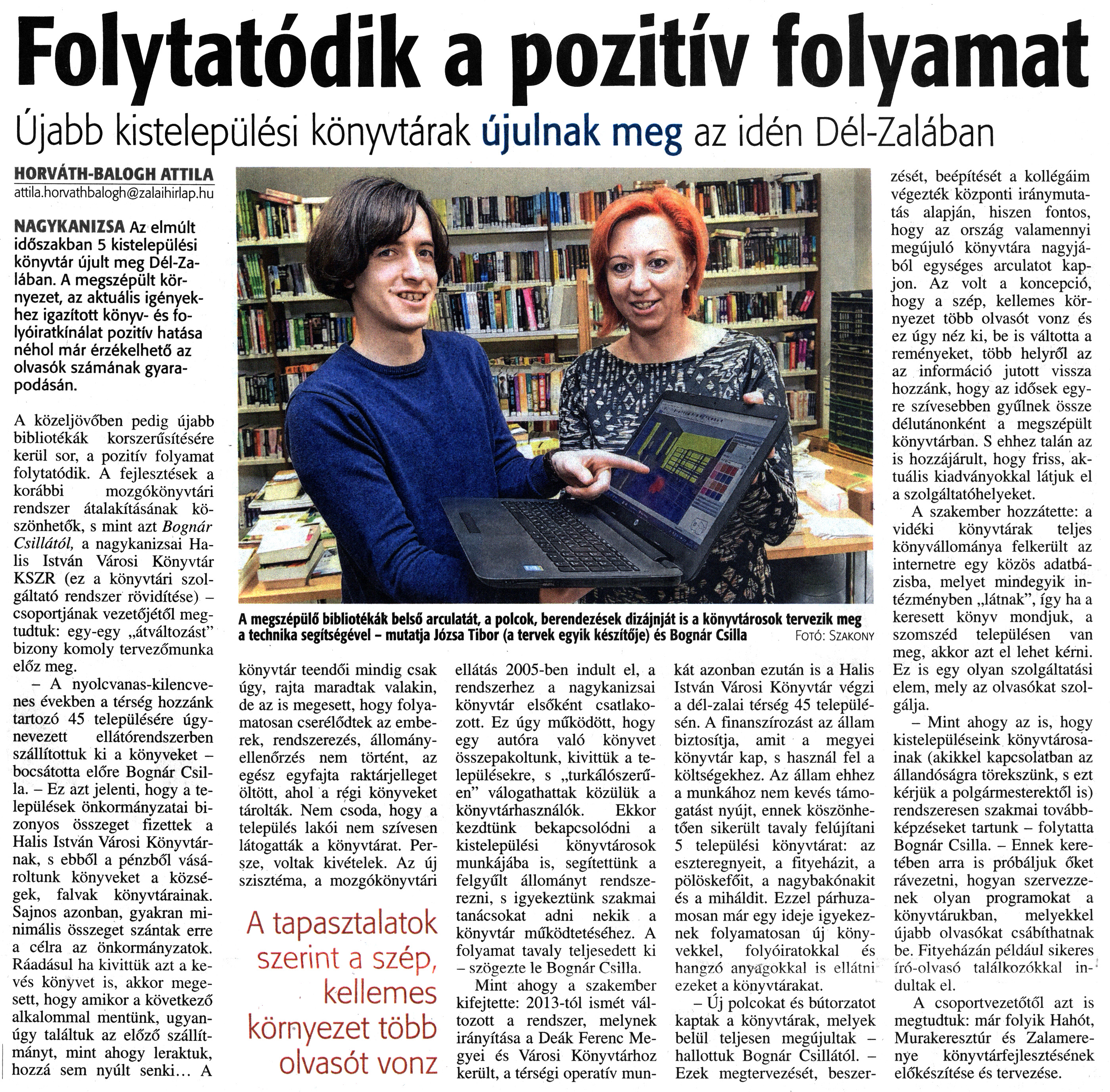 Nyilvános 1528 | 2932 | Zalai Hírlap 2018. február 15. 39. szám 6. oldal | Folytatódik a pozitív folyamat Újabb kistelepülési könyvtárak újulnak meg az idén Dél-Zalában A megszépülő bibliotékák belső arculatát, a polcok, berendezések dizájnját is a könyvtárosok tervezik meg a technika segítségével - mutatja Józsa Tibor (a tervek egyik készítője) és Bognár Csilla Fotó: Szakony HORVÁTH-BALOGH ATTILA attila.horvathbalogh@zalaihirlap.hu NAGYKANIZSA Az elmúlt időszakban 5 kistelepülési könyvtár újult meg Dél-Zalában. A megszépült környezet, az aktuális igényekhez igazított könyv- és folyóiratkínálat pozitív hatása néhol már érzékelhető az olvasók számának gyarapodásán. A közeljövőben pedig újabb bibliotékák korszerűsítésére kerül sor, a pozitív folyamat folytatódik. A fejlesztések a korábbi mozgókönyvtári rendszer átalakításának köszönhetők, s mint azt Bognár Csillától, a nagykanizsai Ha-lis István Városi Könyvtár KSZR (ez a könyvtári szolgáltató rendszer rövidítése) -csoportjának vezetőjétől megtudtuk: egy-egy „átváltozást" bizony komoly tervezőmunka előz meg. - A nyolcvanas-kilencvenes években a térség hozzánk tartozó 45 településére úgynevezett ellátórendszerben szállítottuk ki a könyveket -bocsátotta előre Bognár Csilla. - Ez azt jelenti, hogy a települések önkormányzatai bizonyos összeget fizettek a Halis István Városi Könyvtárnak, s ebből a pénzből vásároltunk könyveket a községek, falvak könyvtárainak. Sajnos azonban, gyakran minimális összeget szántak erre a célra az önkormányzatok. Ráadásul ha kivittük azt a kevés könyvet is, akkor megesett, hogy amikor a következő alkalommal mentünk, ugyanúgy találtuk az előző szállítmányt, mint ahogy leraktuk, hozzá sem nyúlt senki... A könyvtár teendői mindig csak úgy, rajta maradtak valakin, de az is megesett, hogy folyamatosan cserélődtek az emberek, rendszerezés, állományellenőrzés nem történt, az egész egyfajta raktárjelleget öltött, ahol a régi könyveket tárolták. Nem csoda, hogy a település lakói nem szívesen látogatták a könyvtárat. Persze, voltak kivételek. Az új szisztéma, a mozgókönyvtári A tapasztalatok szerint a szép, kellemes környezet több olvasót vonz ellátás 2005-ben indult el, a rendszerhez a nagykanizsai könyvtár elsőként csatlakozott. Ez úgy működött, hogy egy autóra való könyvet összepakoltunk, kivittük a településekre, s „turkálószerűen" válogathattak közülük a könyvtárhasználók. Ekkor kezdtünk bekapcsolódni a kistelepülési könyvtárosok munkájába is, segítettünk a felgyűlt állományt rendszerezni, s igyekeztünk szakmai tanácsokat adni nekik a könyvtár működtetéséhez. A folyamat tavaly teljesedett ki - szögezte le Bognár Csilla. Mint ahogy a szakember kifejtette: 2013-tól ismét változott a rendszer, melynek irányítása a Deák Ferenc Megyei és Városi Könyvtárhoz került, a térségi operatív mun- kát azonban ezután is a Halis István Városi Könyvtár végzi a dél-zalai térség 45 településén. A finanszírozást az állam biztosítja, amit a megyei könyvtár kap, s használ fel a költségekhez. Az állam ehhez a munkához nem kevés támogatást nyújt, ennek köszönhetően sikerült tavaly felújítani 5 települési könyvtárat: az eszteregnyeit, a fityeházit, a pölöskefőit, a nagybakónakit és a miháldit. Ezzel párhuzamosan már egy ideje igyekeznek folyamatosan új könyvekkel, folyóiratokkal és hangzó anyagokkal is ellátni ezeket a könyvtárakat. - Új polcokat és bútorzatot kaptak a könyvtárak, melyek belül teljesen megújultak -hallottuk Bognár Csillától. - Ezek megtervezését, beszerzését, beépítését a kollégáim végezték központi iránymutatás alapján, hiszen fontos, hogy az ország valamennyi megújuló könyvtára nagyjából egységes arculatot kapjon. Az volt a koncepció, hogy a szép, kellemes környezet több olvasót vonz és ez úgy néz ki, be is váltotta a reményeket, több helyről az az információ jutott vissza hozzánk, hogy az idősek egyre szívesebben gyűlnek össze délutánonként a megszépült könyvtárban. S ehhez talán az is hozzájárult, hogy friss, aktuális kiadványokkal látjuk el a szolgáltatóhelyeket. A szakember hozzátette: a vidéki könyvtárak teljes könyvállománya felkerült az internetre egy közös adatbázisba, melyet mindegyik intézményben „látnak", így ha a keresett könyv mondjuk, a szomszéd településen van meg, akkor azt el lehet kérni. Ez is egy olyan szolgáltatási elem, mely az olvasókat szolgálja. - Mint ahogy az is, hogy kistelepüléseink könyvtárosainak (akikkel kapcsolatban az állandóságra törekszünk, s ezt kérjük a polgármesterektől is) rendszeresen szakmai továbbképzéseket tartunk - folytatta Bognár Csilla. - Ennek keretében arra is próbáljuk őket rávezetni, hogyan szervezzenek olyan programokat a könyvtárukban, melyekkel újabb olvasókat csábíthatnak be. Fityeházán például sikeres író-olvasó találkozókkal indultak el. A csoportvezetőtől azt is megtudtuk: már folyik Hahót, Murakeresztúr és Zalamerenye könyvtárfejlesztésének előkészítése és tervezése. |