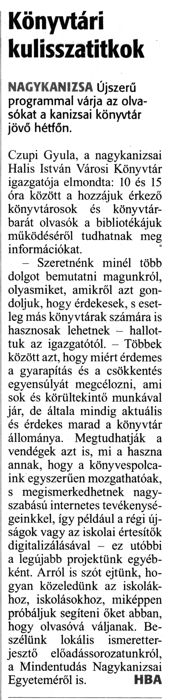 Nyilvános 2186 | 3087 | Zalai Hírlap 2018. október 5. 232. szám 7. oldal - Könyvtári kulisszatitkok | Könyvtári kulisszatitkok NAGYKANIZSA Újszerű programmal várja az olvasókat a kanizsai könyvtár jövő hétfőn. Czupi Gyula, a nagykanizsai Halis István Városi Könyvtár igazgatója elmondta: 10 és 15 óra között a hozzájuk érkező könyvtárosok és könyvtárbarát olvasók a bibliotékájuk működéséről tudhatnak meg információkat. - Szeretnénk minél több dolgot bemutatni magunkról, olyasmiket, amikről azt gondoljuk, hogy érdekesek, s esetleg más könyvtárak számára is hasznosak lehetnek - hallottuk az igazgatótól. - Többek között azt, hogy miért érdemes a gyarapítás és a csökkentés egyensúlyát megcélozni, ami sok és körültekintő munkával jár, de általa mindig aktuális és érdekes marad a könyvtár állománya. Megtudhatják a vendégek azt is, mi a haszna annak, hogy a könyvespolcaink egyszerűen mozgathatóak, s megismerkedhetnek nagyszabású internetes tevékenységeinkkel, így például a régi újságok vagy az iskolai értesítők digitalizálásával - ez utóbbi a legújabb projektünk egyébként. Arról is szót ejtünk, hogyan közeledünk az iskolákhoz, iskolásokhoz, miképpen próbáljuk segíteni őket abban, hogy olvasóvá váljanak. Beszélünk lokális ismeretterjesztő előadássorozatunkról, a Mindentudás Nagykanizsai Egyeteméről is. HBA |