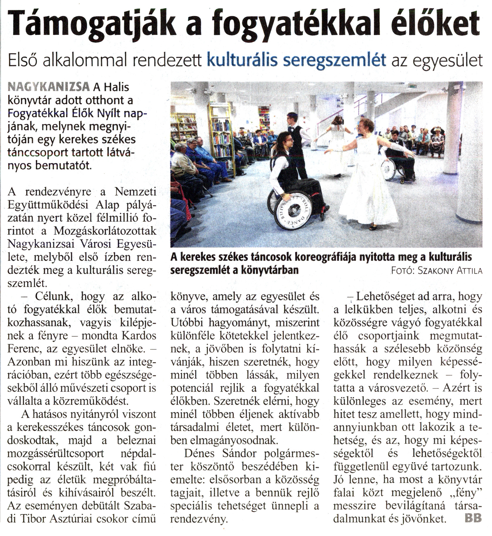Nyilvános 1544 | 2590 | Zalai Hírlap 2018. november 22. 271. szám 6. oldal | Támogatják a fogyatékkal élőket Első alkalommal rendezett kulturális seregszemlét az egyesület A kerekes székes táncosok koreográfiája nyitotta meg a kulturális seregszemlét a könyvtárban Fotó: Szakony Attila A Halis könyvtár adott otthont a Fogyatékkal Élők Nyílt napjának, melynek megnyitóján egy kerekes székes tánccsoport tartott látványos bemutatót. A rendezvényre a Nemzeti Együttműködési Alap pályázatán nyert közel félmillió forintot a Mozgáskorlátozottak Nagykanizsai Városi Egyesülete, melyből első ízben rendezték meg a kulturális seregszemlét. - Célunk, hogy az alkotó fogyatékkal élők bemutatkozhassanak, vagyis kilépjenek a fényre - mondta Kardos Ferenc, az egyesület elnöke. -Azonban mi hiszünk az integrációban, ezért több egészségesekből álló művészeti csoport is vállalta a közreműködést. A hatásos nyitányról viszont a kerekesszékes táncosok gondoskodtak, majd a beleznai mozgássérültcsoport népdalcsokorral készült, két vak fiú pedig az életük megpróbáltatásiról és kihívásairól beszélt. Az eseményen debütált Szabadi Tibor Asztúriai csokor című könyve, amely az egyesület és a város támogatásával készült. Utóbbi hagyományt, miszerint különféle kötetekkel jelentkeznek, a jövőben is folytatni kívánják, hiszen szeretnék, hogy minél többen lássák, milyen potenciál rejlik a fogyatékkal élőkben. Szeretnék elérni, hogy minél többen éljenek aktívabb társadalmi életet, mert különben elmagányosodnak. Dénes Sándor polgármester köszöntő beszédében kiemelte: elsősorban a közösség tagjait, illetve a bennük rejlő speciális tehetséget ünnepli a rendezvény. - Lehetőséget ad arra, hogy a lelkükben teljes, alkotni és közösségre vágyó fogyatékkal élő csoportjaink megmutathassák a szélesebb közönség előtt, hogy milyen képességekkel rendelkeznek - folytatta a városvezető. - Azért is különleges az esemény, mert hitet tesz amellett, hogy mindannyiunkban ott lakozik a tehetség, és az, hogy mi képességektől és lehetőségektől függetlenül együvé tartozunk. Jó lenne, ha most a könyvtár falai közt megjelenő „fény" messzire bevilágítaná társadalmunkat és jövőnket. BB |