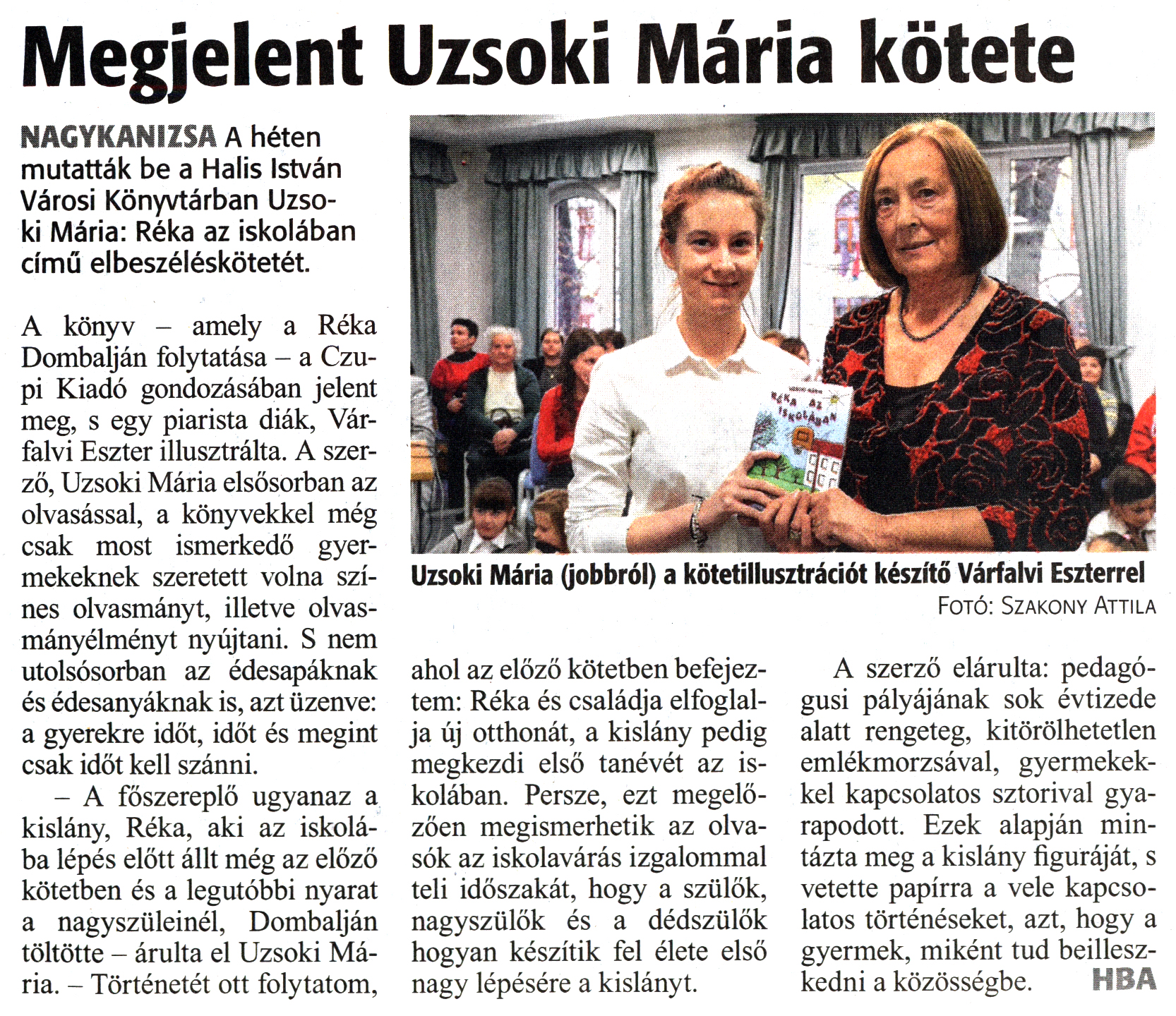 Nyilvános 1564 | 2753 | Zalai Hírlap 2018. december 20. 295. szám 6. oldal | Megjelent Uzsoki Mária kötete NAGYKANIZSA A héten mutatták be a Halis István Városi Könyvtárban Uzsoki Mária: Réka az iskolában című elbeszéléskötetét. A könyv - amely a Réka Dombalján folytatása - a Czupi Kiadó gondozásában jelent meg, s egy piarista diák, Várfalvi Eszter illusztrálta. A szerző, Uzsoki Mária elsősorban az olvasással, a könyvekkel még csak most ismerkedő gyermekeknek szeretett volna színes olvasmányt, illetve olvasmányélményt nyújtani. S nem utolsósorban az édesapáknak és édesanyáknak is, azt üzenve: a gyerekre időt, időt és megint csak időt kell szánni. - A főszereplő ugyanaz a kislány, Réka, aki az iskolába lépés előtt állt még az előző kötetben és a legutóbbi nyarat a nagyszüleinél, Dombalján töltötte - árulta el Uzsoki Mária. - Történetét ott folytatom, ahol az előző kötetben befejeztem: Réka és családja elfoglalja új otthonát, a kislány pedig megkezdi első tanévét az iskolában. Persze, ezt megelőzően megismerhetik az olvasók az iskolavárás izgalommal teli időszakát, hogy a szülők, nagyszülők és a dédszülők hogyan készítik fel élete első nagy lépésére a kislányt. A szerző elárulta: pedagógusi pályájának sok évtizede alatt rengeteg, kitörölhetetlen emlékmorzsával, gyermekekkel kapcsolatos sztorival gyarapodott. Ezek alapján mintázta meg a kislány figuráját, s vetette papírra a vele kapcsolatos történéseket, azt, hogy a gyermek, miként tud beilleszkedni a közösségbe. HBA Uzsoki Mária (jobbról) a kötetillusztrációt készítő Várfalvi Eszterrel Fotó: Szakony Attila |