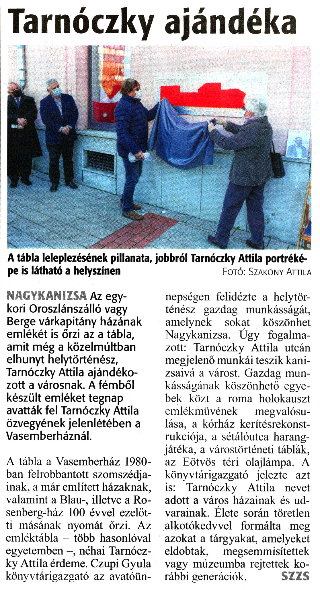 Nyilvános 1349 | 1772 | Zalai Hírlap 2020. november 7. 261. szám 1. oldal | Tarnóczky ajándéka A tábla leleplezésének pillanata, jobbról Tarnóczky Attila portréképe is látható a helyszínen Fotó: Szakony Attila NAGYKANIZSA Az egykori Oroszlánszálló vagy Berge várkapitány házának emlékét is őrzi az a tábla, amit még a közelmúltban elhunyt helytörténész, Tarnóczky Attila ajándékozott a városnak. A fémből készült emléket tegnap avatták fel Tarnóczky Attila özvegyének jelenlétében a Vasemberháznál. A tábla a Vasemberház 1980-ban felrobbantott szomszédjainak, a már említett házaknak, valamint a Blau-, illetve a Rosenberg-ház 100 évvel ezelőtti másának nyomát őrzi. Az emléktábla - több hasonlóval egyetemben -, néhai Tarnóczky Attila érdeme. Czupi Gyula könyvtárigazgató az avatóünnepségen felidézte a helytörténész gazdag munkásságát, amelynek sokat köszönhet Nagykanizsa. Úgy fogalmazott: Tarnóczky Attila utcán megjelenő munkái teszik kanizsaivá a várost. Gazdag munkásságának köszönhető egyebek közt a roma holokauszt emlékmüvének megvalósulása, a kórház kerítésrekonstrukciója, a sétálóutca harangjátéka, a várostörténeti táblák, az Eötvös téri olajlámpa. A könyvtárigazgató jelezte azt is: Tarnóczky Attila nevet adott a város házainak és udvarainak. Elete során töretlen alkotókedvvel formálta meg azokat a tárgyakat, amelyeket eldobtak, megsemmisítettek vagy múzeumba rejtettek korábbi generációk. SZZS |