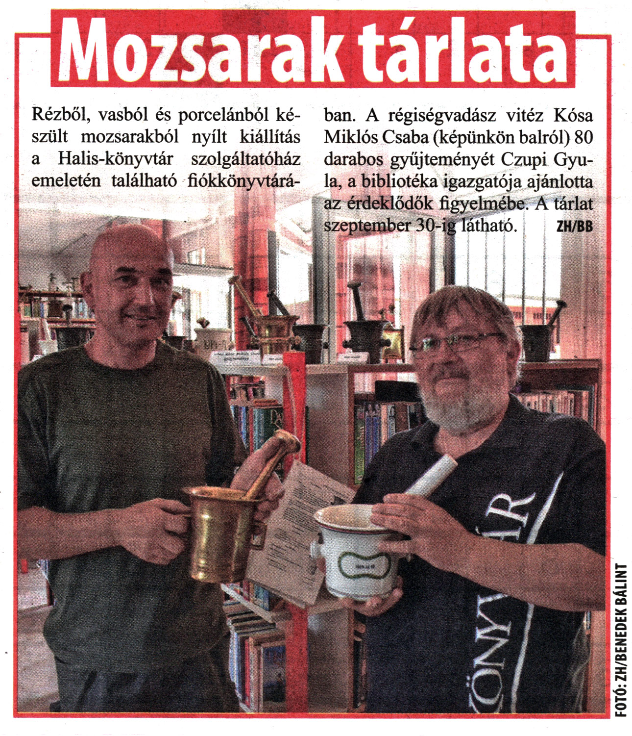 Nyilvános 1679 | 2728 | City7 2021. augusztus 20. 22. szám 20. oldal | Mozsarak tárlata Rézből, vasból és porcelánból készült mozsarakból nyílt kiállítás a Halis-könyvtár szolgáltatóház emeletén található fiókkönyvtárában. A régiségvadász vitéz Kósa Miklós Csaba (képünkön balról) 80 darabos gyűjteményét Czupi Gyula, a bibliotéka igazgatója ajánlotta az érdeklődők figyelmébe. A tárlat szeptember 30-ig látható. ZH/BB |