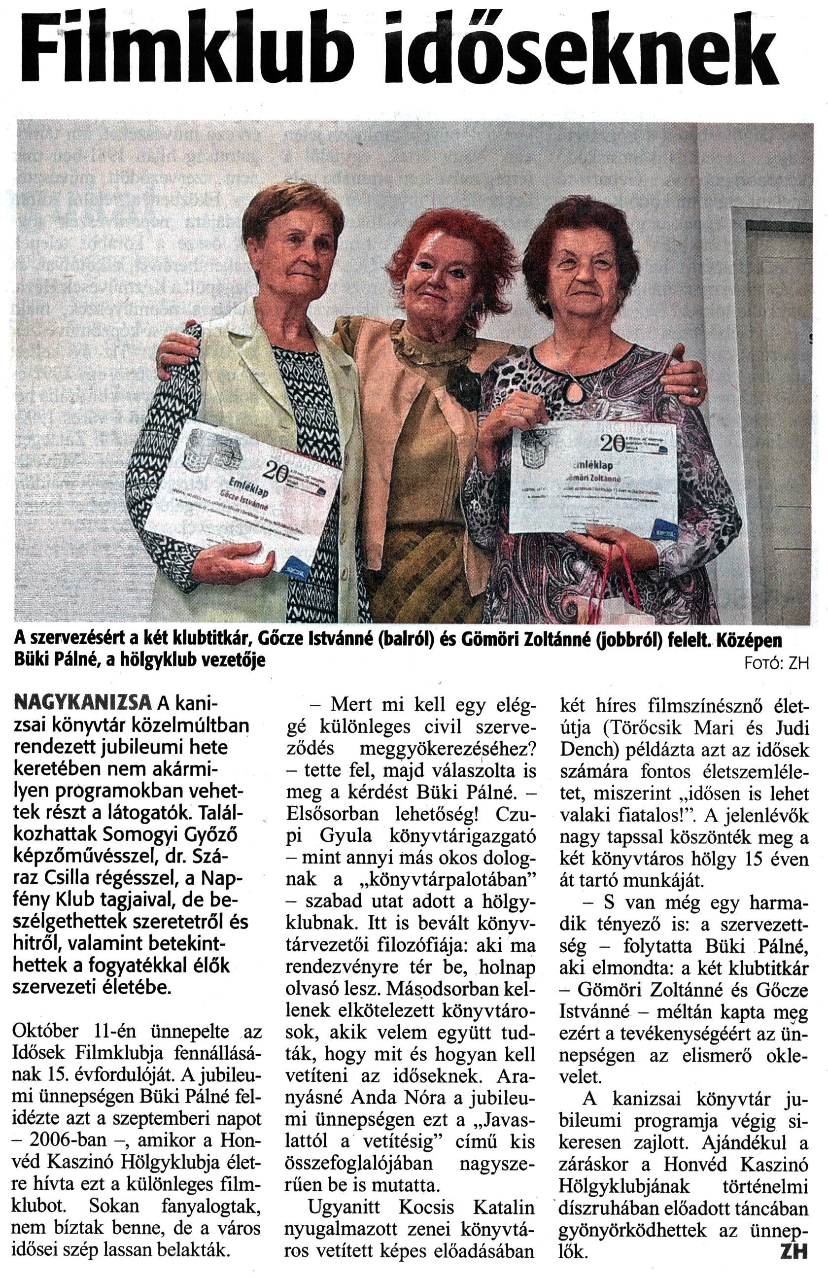 Nyilvános 1221 | 1719 | Zalai Hírlap 2021. október 15. 240. szám 12. oldal | Filmklub időseknek A szervezésért a két klubtitkár, Gőcze Istvánné (balról) és Gömöri Zoltánné (jobbról) felelt. Középen Büki Pálné, a hölgyklub vezetője Fotó: ZH NAGYKANIZSA A kanizsai könyvtár közelmúltban rendezett jubileumi hete keretében nem akármilyen programokban vehettek részt a látogatók. Találkozhattak Somogyi Győző képzőművésszel, dr. Száraz Csilla régésszel, a Napfény Klub tagjaival, de beszélgethettek szeretetről és hitről, valamint betekinthettek a fogyatékkal élők szervezeti életébe. Október 11-én ünnepelte az Idősek Filmklubja fennállásának 15. évfordulóját. A jubileumi ünnepségen Büki Pálné felidézte azt a szeptemberi napot - 2006-ban -, amikor a Honvéd Kaszinó Hölgyklubja életre hívta ezt a különleges filmklubot. Sokan fanyalogtak, nem bíztak benne, de a város idősei szép lassan belakták. - Mert mi kell egy eléggé különleges civil szerveződés meggyökerezéséhez? - tette fel, majd válaszolta is meg a kérdést Büki Pálné. - Elsősorban lehetőség! Czupi Gyula könyvtárigazgató - mint annyi más okos dolognak a „könyvtárpalotában" - szabad utat adott a hölgyklubnak. Itt is bevált könyvtárvezetői filozófiája: aki ma rendezvényre tér be, holnap olvasó lesz. Másodsorban kellenek elkötelezett könyvtárosok, akik velem együtt tudták, hogy mit és hogyan kell vetíteni az időseknek. Aranyásné Anda Nóra a jubileumi ünnepségen ezt a „Javaslattól a vetítésig" című kis összefoglalójában nagyszerűen be is mutatta. Ugyanitt Kocsis Katalin nyugalmazott zenei könyvtáros vetített képes előadásában két híres filmszínésznő életútja (Törőcsik Mari és Judi Dench) példázta azt az idősek számára fontos életszemléletet, miszerint „idősen is lehet valaki fiatalos!". A jelenlévők nagy tapssal köszönték meg a két könyvtáros hölgy 15 éven át tartó munkáját. - S van még egy harmadik tényező is: a szervezettség - folytatta Büki Pálné, aki elmondta: a két klubtitkár - Gömöri Zoltánné és Gőcze Istvánné - méltán kapta meg ezért a tevékenységéért az ünnepségen az elismerő oklevelet. A kanizsai könyvtár jubileumi programja végig sikeresen zajlott. Ajándékul a záráskor a Honvéd Kaszinó Hölgyklubjának történelmi díszruhában előadott táncában gyönyörködhettek az ünneplők. ZH |