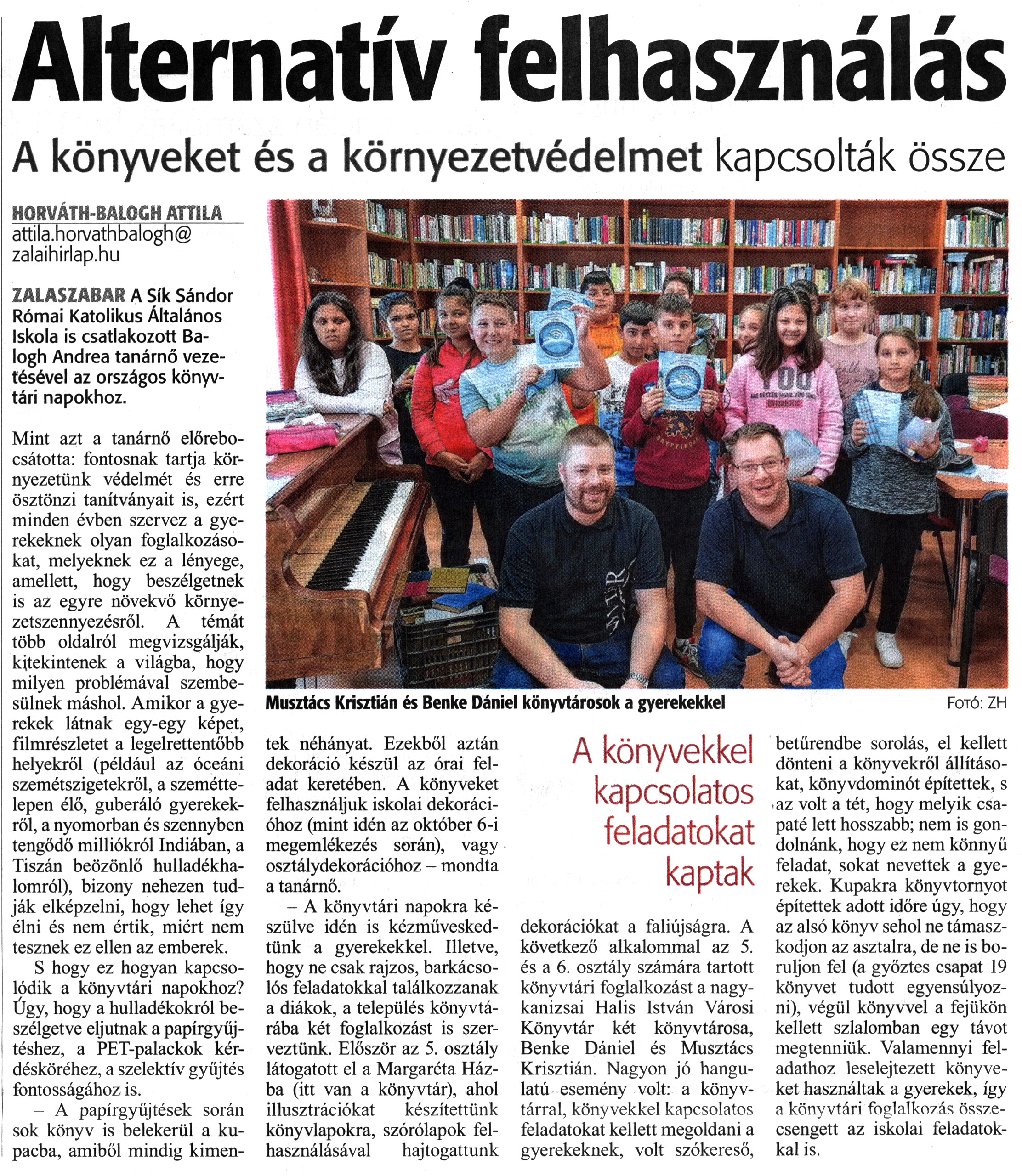 Nyilvános 1172 | 1565 | Zalai Hírlap 2021. október 21. 245. szám 4. oldal | Alternatív felhasználás A könyveket és a környezetvédelmet kapcsolták össze HORVÁTH-BALOGH ATTILA attila.horvathbalogh@ zalaihirlap.hu ZALASZABAR A Sík Sándor Római Katolikus Általános Iskola is csatlakozott Balogh Andrea tanárnő vezetésével az országos könyvtári napokhoz. Mint azt a tanárnő előrebocsátotta: fontosnak tartja környezetünk védelmét és erre ösztönzi tanítványait is, ezért minden évben szervez a gyerekeknek olyan foglalkozásokat, melyeknek ez a lényege, amellett, hogy beszélgetnek is az egyre növekvő környezetszennyezésről. A témát több oldalról megvizsgálják, kitekintenek a világba, hogy milyen problémával szembesülnek máshol. Amikor a gyerekek látnak egy-egy képet, filmrészletet a legelrettentőbb helyekről (például az óceáni szemétszigetekről, a szeméttelepen élő, guberáló gyerekekről, a nyomorban és szennyben tengődő milliókról Indiában, a Tiszán beözönlő hulladékhalomról), bizony nehezen tudják elképzelni, hogy lehet így élni és nem értik, miért nem tesznek ez ellen az emberek. S hogy ez hogyan kapcsolódik a könyvtári napokhoz? Úgy, hogy a hulladékokról beszélgetve eljutnak a papírgyűjtéshez, a PET-palackok kérdésköréhez, a szelektív gyűjtés fontosságához is. - A papírgyűjtések során sok könyv is belekerül a kupacba, amiből mindig kimentek néhányat. Ezekből aztán dekoráció készül az órai feladat keretében. A könyveket felhasználjuk iskolai dekorációhoz (mint idén az október 6-i megemlékezés során), vagy osztálydekorációhoz - mondta a tanárnő. - A könyvtári napokra készülve idén is kézműveskedtünk a gyerekekkel. Illetve, hogy ne csak rajzos, barkácsolós feladatokkal találkozzanak a diákok, a település könyvtárába két foglalkozást is szerveztünk. Először az 5. osztály látogatott el a Margaréta Házba (itt van a könyvtár), ahol illusztrációkat készítettünk könyvlapokra, szórólapok felhasználásával hajtogattunk dekorációkat a faliújságra. A következő alkalommal az 5. és a 6. osztály számára tartott könyvtári foglalkozást a nagykanizsai Halis István Városi Könyvtár két könyvtárosa, Benke Dániel és Musztács Krisztián. Nagyon jó hangulatú esemény volt: a könyvtárral, könyvekkel kapcsolatos feladatokat kellett megoldani a gyerekeknek, volt szókereső, betűrendbe sorolás, el kellett dönteni a könyvekről állításokat, könyvdominót építettek, s az volt a tét, hogy melyik csapaté lett hosszabb; nem is gondolnánk, hogy ez nem könnyű feladat, sokat nevettek a gyerekek. Kupakra könyvtornyot építettek adott időre úgy, hogy az alsó könyv sehol ne támaszkodjon az asztalra, de ne is boruljon fel (a győztes csapat 19 könyvet tudott egyensúlyozni), végül könyvvel a fejükön kellett szlalomban egy távot megtenniük. Valamennyi feladathoz leselejtezett könyveket használtak a gyerekek, így a könyvtári foglalkozás összecsengett az iskolai feladatokkal is. Musztács Krisztián és Benke Dániel könyvtárosok a gyerekekkel |