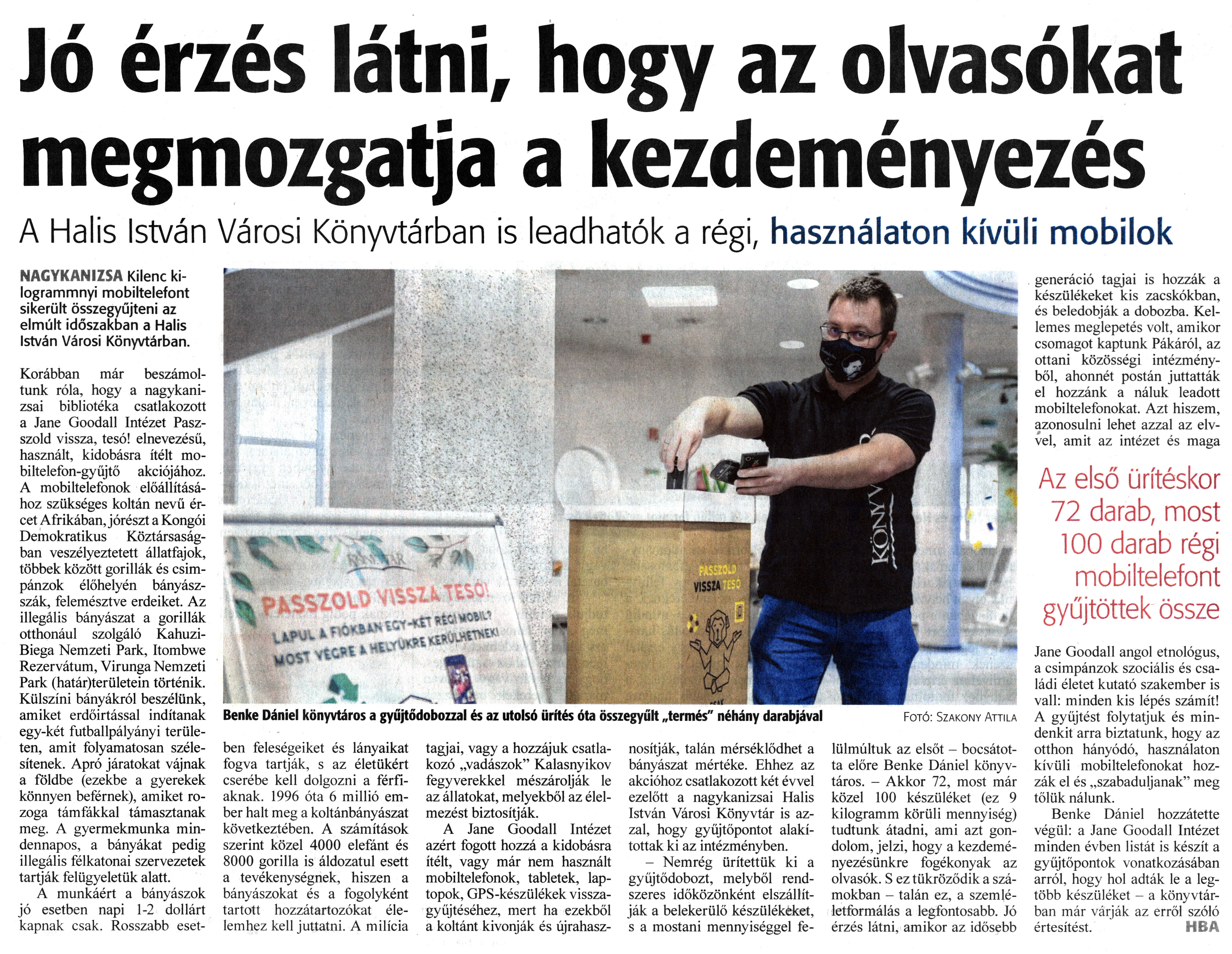 Nyilvános 1200 | 2244 | Zalai Hírlap 2021. december 21. 295. szám 5. oldal | Jó érzés látni, hogy az olvasókat megmozgatja a kezdeményezés A Halis István Városi Könyvtárban is leadhatók a régi, használaton kívüli mobilok NAGYKANIZSA Kilenc kilogrammnyi mobiltelefont sikerült összegyűjteni az elmúlt időszakban a Halis István Városi Könyvtárban. Korábban már beszámoltunk róla, hogy a nagykanizsai bibliotéka csatlakozott a Jane Goodall Intézet Passzold vissza, tesó! elnevezésű, használt, kidobásra ítélt mobiltelefon-gyűjtő akciójához. A mobiltelefonok előállításához szükséges koltán nevű ércet Afrikában, jórészt a Kongói Demokratikus Köztársaságban veszélyeztetett állatfajok, többek között gorillák és csimpánzok élőhelyén bányászszák, felemésztve erdeiket. Az illegális bányászat a gorillák otthonául szolgáló Kahuzi-Biega Nemzeti Park, Itombwe Rezervátum, Virunga Nemzeti Park határterületein történik. Külszíni bányákról beszélünk, amiket erdőirtással indítanak egy-két futballpályányi területen, amit folyamatosan szélesítenek. Apró járatokat vájnak a földbe (ezekbe a gyerekek könnyen beférnek), amiket rozoga támfákkal támasztanak meg. A gyermekmunka mindennapos, a bányákat pedig illegális félkatonai szervezetek tartják felügyeletük alatt. A munkáért a bányászok jó esetben napi 1-2 dollárt kapnak csak. Rosszabb esetben feleségeiket és lányaikat fogva tartják, s az életükért cserébe kell dolgozni a férfiaknak. 1996 óta 6 millió ember halt meg a koltánbányászat következtében. A számítások szerint közel 4000 elefánt és 8000 gorilla is áldozatul esett a tevékenységnek, hiszen a bányászokat és a fogolyként tartott hozzátartozókat élelemhez kell juttatni. A milícia tagjai, vagy a hozzájuk csatlakozó „vadászok" Kalasnyikov fegyverekkel mészárolják le az állatokat, melyekből az élelmezést biztosítják. A Jane Goodall Intézet azért fogott hozzá a kidobásra ítélt, vagy már nem használt mobiltelefonok, tabletek, laptopok, GPS-készülékek visszagyűjtéséhez, mert ha ezekből a koltánt kivonják és újrahasznosítják, talán mérséklődhet a bányászat mértéke. Ehhez az akcióhoz csatlakozott két évvel ezelőtt a nagykanizsai Halis István Városi Könyvtár is azzal, hogy gyűjtőpontot alakítottak ki az intézményben. - Nemrég ürítettük ki a gyűjtődobozt, melyből rendszeres időközönként elszállítják a belekerülő készülékeket, s a mostani mennyiséggel felülmúltuk az elsőt - bocsátotta előre Benke Dániel könyvtáros. - Akkor 72, most már közel 100 készüléket (ez 9 kilogramm körüli mennyiség) tudtunk átadni, ami azt gondolom, jelzi, hogy a kezdeményezésünkre fogékonyak az olvasók. S ez tükröződik a számokban - talán ez, a szemléletformálás a legfontosabb. Jó érzés látni, amikor az idősebb generáció tagjai is hozzák a készülékeket kis zacskókban, és beledobják a dobozba. Kellemes meglepetés volt, amikor csomagot kaptunk Pákáról, az ottani közösségi intézményből, ahonnét postán juttatták el hozzánk a náluk leadott mobiltelefonokat. Azt hiszem, azonosulni lehet azzal az elvvel, amit az intézet és maga Jane Goodall angol etnológus, a csimpánzok szociális és családi életet kutató szakember is vall: minden kis lépés számít! A gyűjtést folytatjuk és mindenkit arra biztatunk, hogy az otthon hányódó, használaton kívüli mobiltelefonokat hozzák el és „szabaduljanak" meg tőlük nálunk. Benke Dániel hozzátette végül: a Jane Goodall Intézet minden évben listát is készít a gyűjtőpontok vonatkozásában arról, hogy hol adták le a legtöbb készüléket - a könyvtárban már várják az erről szóló értesítést. HBA Benke Dániel könyvtáros a gyűjtődobozzal és az utolsó ürítés óta összegyűlt „termés" néhány darabjával Fotó: Szakony Attila |