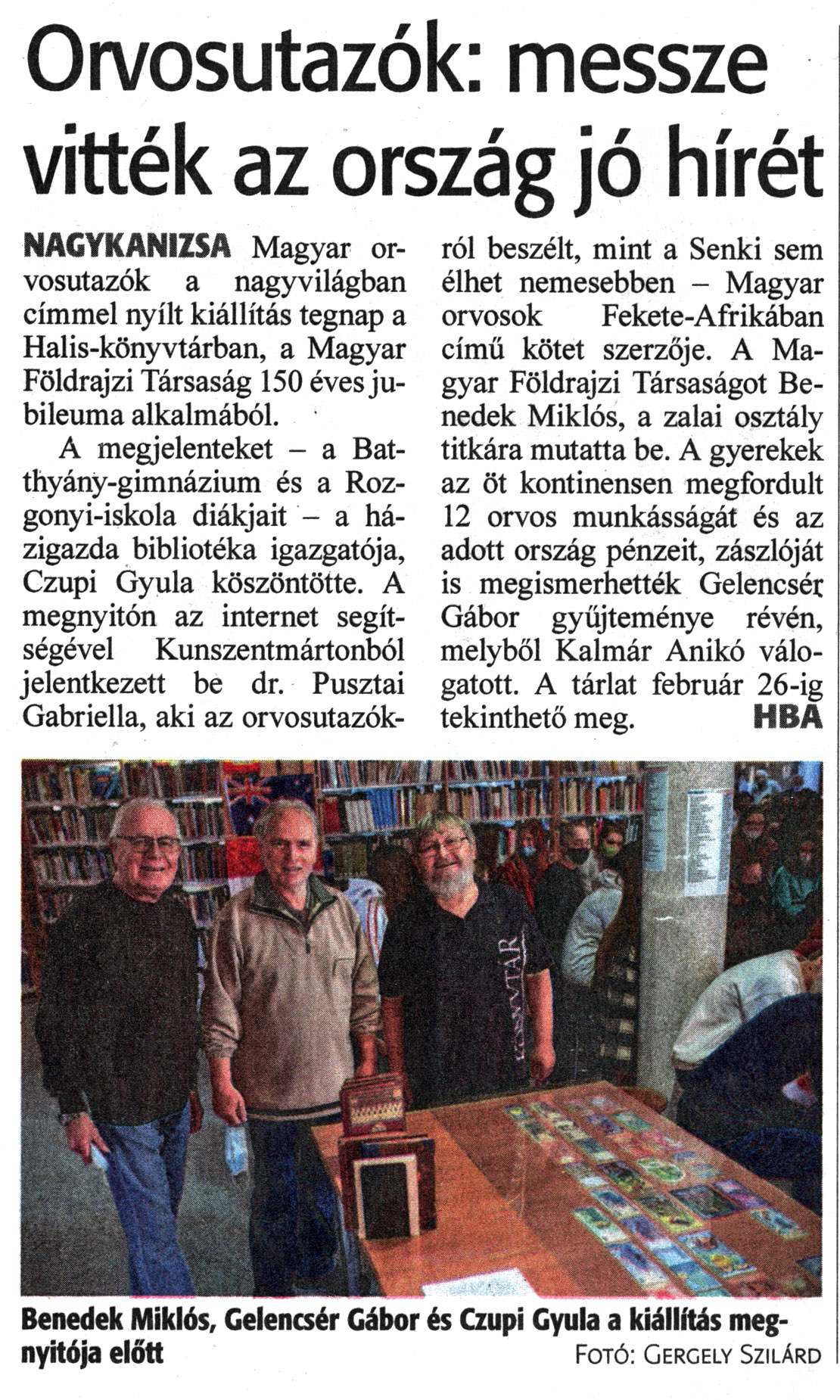 Nyilvános 1230 | 1881 | Zalai Hírlap 2022. január 15. 12. szám 2. oldal | Orvosutazók: messze vitték az ország jó hírét NAGYKANIZSA Magyar orvosutazók a nagyvilágban címmel nyílt kiállítás tegnap a Halis-könyvtárban, a Magyar Földrajzi Társaság 150 éves jubileuma alkalmából. A megjelenteket - a Batthyány-gimnázium és a Rozgonyi-iskola diákjait - a házigazda bibliotéka igazgatója, Czupi Gyula köszöntötte. A megnyitón az internet segítségével Kunszentmártonból jelentkezett be dr. Pusztai Gabriella, aki az orvosutazókról beszélt, mint a Senki sem élhet nemesebben - Magyar orvosok Fekete-Afrikában című kötet szerzője. A Magyar Földrajzi Társaságot Benedek Miklós, a zalai osztály titkára mutatta be. A gyerekek az öt kontinensen megfordult 12 orvos munkásságát és az adott ország pénzeit, zászlóját is megismerhették Gelencsér Gábor gyűjteménye révén, melyből Kalmár Anikó válogatott. A tárlat február 26-ig tekinthető meg. HBA Benedek Miklós, Gelencsér Gábor és Czupi Gyula a kiállítás megnyitója előtt Fotó: Gergely Szilárd |