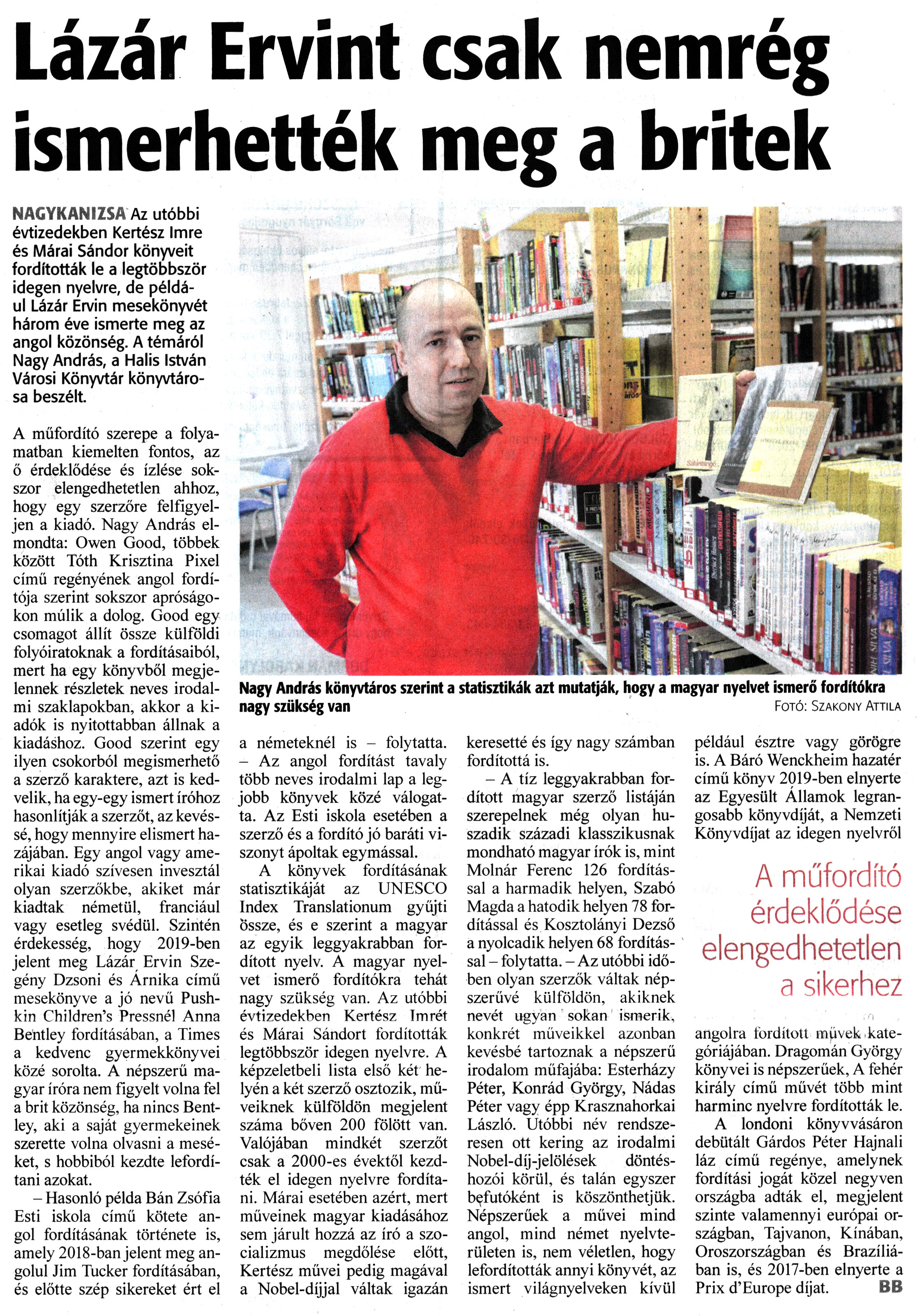 Nyilvános 1587 | 2037 | Zalai Hírlap 2022. február 9. 33. szám 12. oldal | Lázár Ervint csak nemrég ismerhették meg a britek NAGYKANIZSA Az utóbbi évtizedekben Kertész Imre és Márai Sándor könyveit fordították le a legtöbbször idegen nyelvre, de például Lázár Ervin mesekönyvét három éve ismerte meg az angol közönség. A témáról Nagy András, a Halis István Városi Könyvtár könyvtárosa beszélt. A műfordító szerepe a folyamatban kiemelten fontos, az ő érdeklődése és ízlése sokszor elengedhetetlen ahhoz, hogy egy szerzőre felfigyeljen a kiadó. Nagy András elmondta: Owen Good, többek között Tóth Krisztina Pixel című regényének angol fordítója szerint sokszor apróságokon múlik a dolog. Good egy csomagot állít össze külföldi folyóiratoknak a fordításaiból, mert ha egy könyvből megjelennek részletek neves irodalmi szaklapokban, akkor a kiadók is nyitottabban állnak a kiadáshoz. Good szerint egy ilyen csokorból megismerhető a szerző karaktere, azt is kedvelik, ha egy-egy ismert íróhoz hasonlítják a szerzőt, az kevéssé, hogy mennyire elismert hazájában. Egy angol vagy amerikai kiadó szívesen invesztál olyan szerzőkbe, akiket már kiadtak németül, franciául vagy esetleg svédül. Szintén érdekesség, hogy 2019-ben jelent meg Lázár Ervin Szegény Dzsoni és Árnika című mesekönyve a jó nevű Push-kin Children''s Pressnél Anna Bentley fordításában, a Times a kedvenc gyermekkönyvei közé sorolta. A népszerű magyar íróra nem figyelt volna fel a brit közönség, ha nincs Bentley, aki a saját gyermekeinek szerette volna olvasni a meséket, s hobbiból kezdte lefordítani azokat. - Hasonló példa Bán Zsófia Esti iskola című kötete angol fordításának története is, amely 2018-ban jelent meg angolul Jim Tucker fordításában, és előtte szép sikereket ért el a németeknél is - folytatta. - Az angol fordítást tavaly több neves irodalmi lap a legjobb könyvek közé válogatta. Az Esti iskola esetében a szerző és a fordító jó baráti viszonyt ápoltak egymással. A könyvek fordításának statisztikáját az UNESCO Index Translationum gyűjti Össze, és e szerint a magyar az egyik leggyakrabban fordított nyelv. A magyar nyelvet ismerő fordítókra tehát nagy szükség van. Az utóbbi évtizedekben Kertész Imrét és Márai Sándort fordították legtöbbször idegen nyelvre. A képzeletbeli lista első két helyén a két szerző osztozik, műveiknek külföldön megjelent száma bőven 200 fölött van. Valójában mindkét szerzőt csak a 2000-es évektől kezdték el idegen nyelvre fordítani. Márai esetében azért, mert műveinek magyar kiadásához sem járult hozzá az író a szocializmus megdőlése előtt, Kertész művei pedig magával a Nobel-díjjal váltak igazán keresetté és így nagy számban fordítottá is. - A tíz leggyakrabban fordított magyar szerző listáján szerepelnek még olyan huszadik századi klasszikusnak mondható magyar írók is, mint Molnár Ferenc 126 fordítással a harmadik helyen, Szabó Magda a hatodik helyen 78 fordítással és Kosztolányi Dezső a nyolcadik helyen 68 fordítással - folytatta. - Az utóbbi időben olyan szerzők váltak népszerűvé külföldön, akiknek nevét ugyan sokan ismerik, konkrét műveikkel azonban kevésbé tartoznak a népszerű irodalom műfajába: Esterházy Péter, Konrád György, Nádas Péter vagy épp Krasznahorkai László. Utóbbi név rendszeresen ott kering az irodalmi Nobel-díj-jelölések döntéshozói körül, és talán egyszer befutóként is köszönthetjük. Népszerűek a művei mind angol, mind német nyelvterületen is, nem véletlen, hogy lefordították annyi könyvét, az ismert világnyelveken kívül például észtre vagy görögre is. A Báró Wenckheim hazatér című könyv 2019-ben elnyerte az Egyesült Államok legrangosabb könyvdíját, a Nemzeti Könyvdíjat az idegen nyelvről angolra fordított müvek kategóriájában. Dragomán György könyvei is népszerűek, A fehér király című művét több mint harminc nyelvre fordították le. A londoni könyvvásáron debütált Gárdos Péter Hajnali láz című regénye, amelynek fordítási jogát közel negyven országba adták el, megjelent szinte valamennyi európai országban, Tajvanon, Kínában, Oroszországban és Brazíliában is, és 2017-ben elnyerte a Prix d''Europe díjat. BB Nagy András könyvtáros szerint a statisztikák azt mutatják, hogy a magyar nyelvet ismerő fordítókra nagy szükség van Fotó: Szakony Attila |