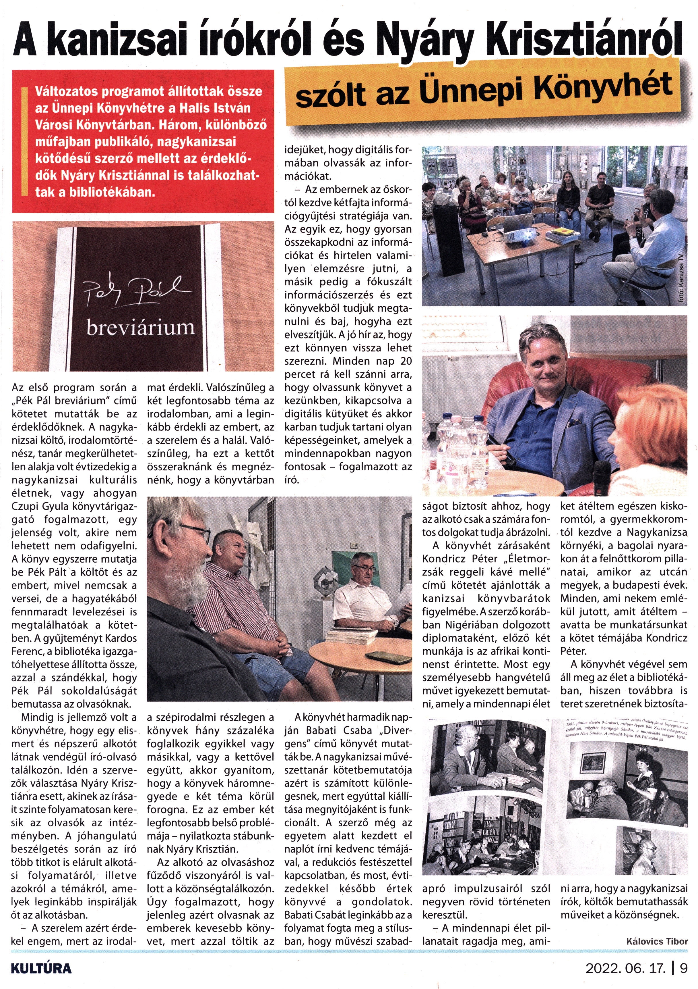 Nyilvános 1660 | 2598 | Kanizsa 2022. június 17. 12. szám 9. oldal | A kanizsai írókról és Nyáry Krisztiánról szólt az Ünnepi Könyvhét Változatos programot állítottak össze az Ünnepi Könyvhétre a Halis István Városi Könyvtárban. Három, különböző műfajban publikáló, nagykanizsai kötődésű szerző mellett az érdeklődők Nyáry Krisztiánnal is találkozhattak a bibliotékában. Az első program során a „Pék Pál breviárium" című kötetet mutatták be az érdeklődőknek. A nagykanizsai költő, irodalomtörténész, tanár megkerülhetetlen alakja volt évtizedekig a nagykanizsai kulturális életnek, vagy ahogyan Czupi Gyula könyvtárigazgató fogalmazott, egy jelenség volt, akire nem lehetett nem odafigyelni. A könyv egyszerre mutatja be Pék Pált a költőt és az embert, mivel nemcsak a versei, de a hagyatékából fennmaradt levelezései is megtalálhatóak a kötetben. A gyűjteményt Kardos Ferenc, a bibliotéka igazgatóhelyettese állította össze, azzal a szándékkal, hogy Pék Pál sokoldalúságát bemutassa az olvasóknak. Mindig is jellemző volt a könyvhétre, hogy egy elismert és népszerű alkotót látnak vendégül író-olvasó találkozón. Idén a szervezők választása Nyáry Krisztiánra esett, akinek az írásait szinte folyamatosan keresik az olvasók az intézményben. A jóhangulatú beszélgetés során az író több titkot is elárult alkotási folyamatáról, illetve azokról a témákról, amelyek leginkább inspirálják őt az alkotásban. - A szerelem azért érdekel engem, mert az irodalmat érdekli. Valószínűleg a két legfontosabb téma az irodalomban, ami a leginkább érdekli az embert, az a szerelem és a halál. Valószínűleg, ha ezt a kettőt összeraknánk és megnéznénk, hogy a könyvtárban a szépirodalmi részlegen a könyvek hány százaléka foglalkozik egyikkel vagy másikkal, vagy a kettővel együtt, akkor gyanítom, hogy a könyvek háromnegyede e két téma körül forogna. Ez az ember két legfontosabb belső problémája - nyilatkozta stábunknak Nyáry Krisztián. Az alkotó az olvasáshoz fűződő viszonyáról is vallott a közönségtalálkozón. Úgy fogalmazott, hogy jelenleg azért olvasnak az emberek kevesebb könyvet, mert azzal töltik az idejüket, hogy digitális formában olvassák az információkat. - Az embernek az őskortól kezdve kétfajta információgyűjtési stratégiája van. Az egyik ez, hogy gyorsan összekapkodni az információkat és hirtelen valamilyen elemzésre jutni, a másik pedig a fókuszált információszerzés és ezt könyvekből tudjuk megtanulni és baj, hogyha ezt elveszítjük. A jó hír az, hogy ezt könnyen vissza lehet szerezni. Minden nap 20 percet rá kell szánni arra, hogy olvassunk könyvet a kezünkben, kikapcsolva a digitális kütyüket és akkor karban tudjuk tartani olyan képességeinket, amelyek a mindennapokban nagyon fontosak - fogalmazott az író. A könyvhét harmadik napján Babati Csaba „Divergens" című könyvét mutatták be. A nagykanizsai művészettanár kötetbemutatója azért is számított különlegesnek, mert egyúttal kiállítása megnyitójaként is funkcionált. A szerző még az egyetem alatt kezdett el naplót írni kedvenc témájával, a redukciós festészettel kapcsolatban, és most, évtizedekkel később értek könyvvé a gondolatok. Babati Csabát leginkább az a folyamat fogta meg a stílusban, hogy művészi szabad- ságot biztosít ahhoz, hogy az alkotó csak a számára fontos dolgokat tudja ábrázolni. A könyvhét zárásaként Kondricz Péter „Életmorzsák reggeli kávé mellé" című kötetét ajánlották a kanizsai könyvbarátok figyelmébe. A szerző korábban Nigériában dolgozott diplomataként, előző két munkája is az afrikai kontinenst érintette. Most egy személyesebb hangvételű művet igyekezett bemutatni,amelya mindennapi élet apró impulzusairól szól negyven rövid történeten keresztül. - A mindennapi élet pillanatait ragadja meg, amiket átéltem egészen kiskoromtól, a gyermekkoromtól kezdve a Nagykanizsa környéki, a bagolai nyarakon át a felnőttkorom pillanatai, amikor az utcán megyek, a budapesti évek. Minden, ami nekem emlékül jutott, amit átéltem -avatta be munkatársunkat a kötet témájába Kondricz Péter. A könyvhét végével sem áll meg az élet a bibliotékában, hiszen továbbra is teret szeretnének biztosítani arra, hogy a nagykanizsai írók, költők bemutathassák műveiket a közönségnek. Kálovics Tibor KULTÚRA 2022. 06. 17. | 9 |