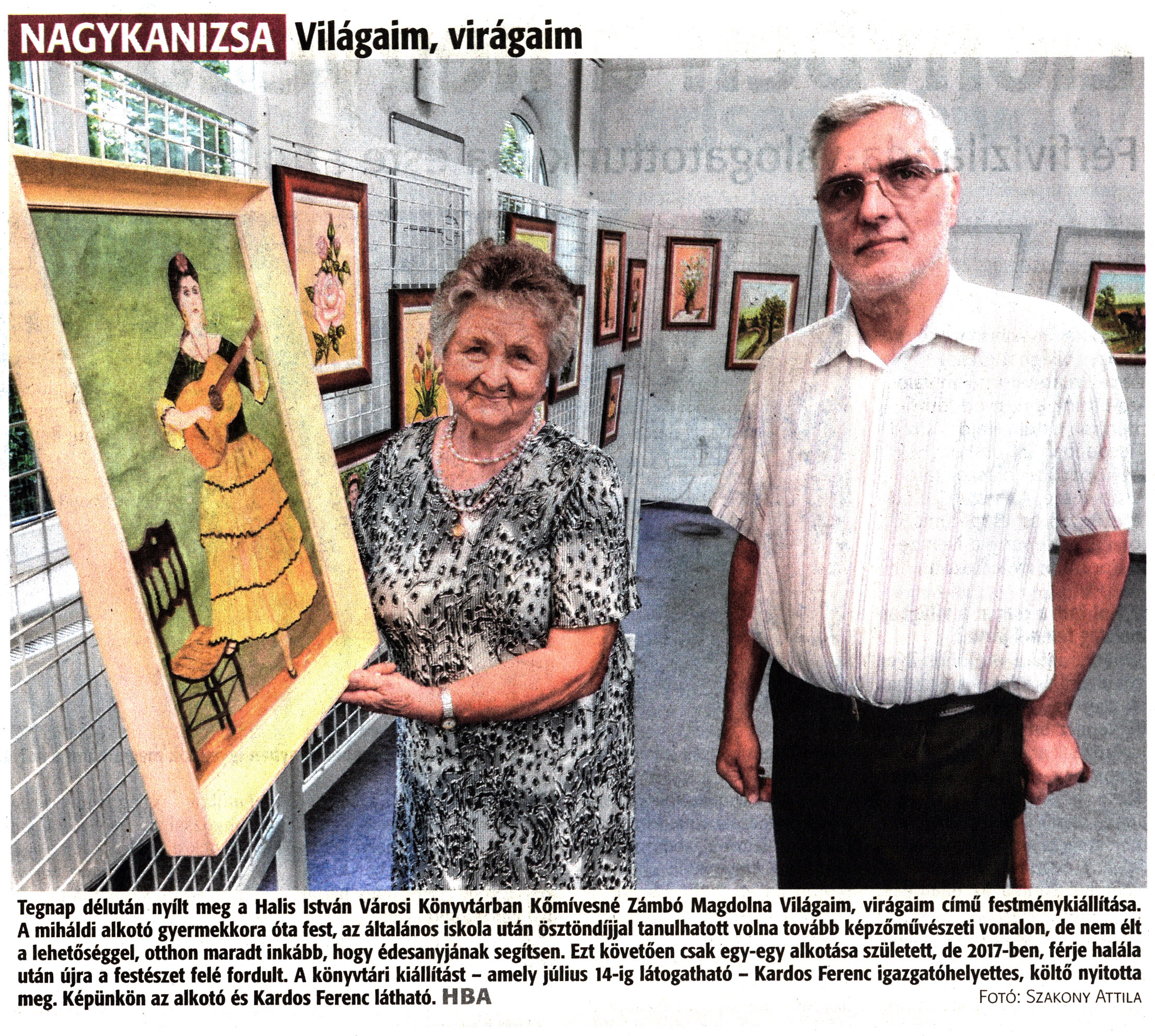 Nyilvános 1226 | 1569 | Zalai Hírlap 2022. június 29. 149. szám 16. oldal | NAGYKANIZSA Világaim, virágaim Tegnap délután nyílt meg a Halis István Városi Könyvtárban Kőmívesné Zámbó Magdolna Világaim, virágaim című festménykiállítása. A miháldi alkotó gyermekkora óta fest, az általános iskola után ösztöndíjjal tanulhatott volna tovább képzőművészeti vonalon, de nem élt a lehetőséggel, otthon maradt inkább, hogy édesanyjának segítsen. Ezt követően csak egy-egy alkotása született, de 2017-ben, férje halála után újra a festészet felé fordult. A könyvtári kiállítást - amely július 14-ig látogatható - Kardos Ferenc igazgatóhelyettes, költő nyitotta meg. Képünkön az alkotó és Kardos Ferenc látható. HBA Fotó: Szakony Attila |